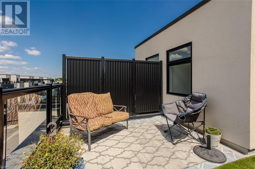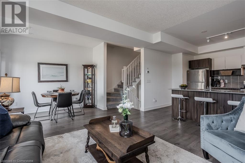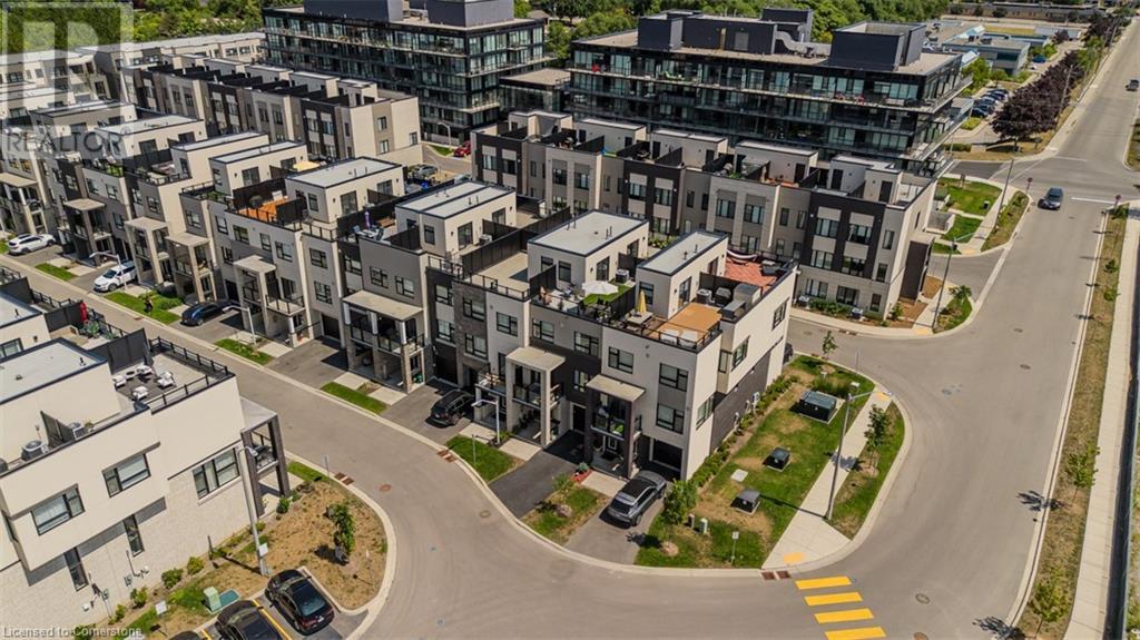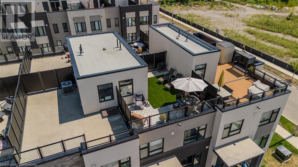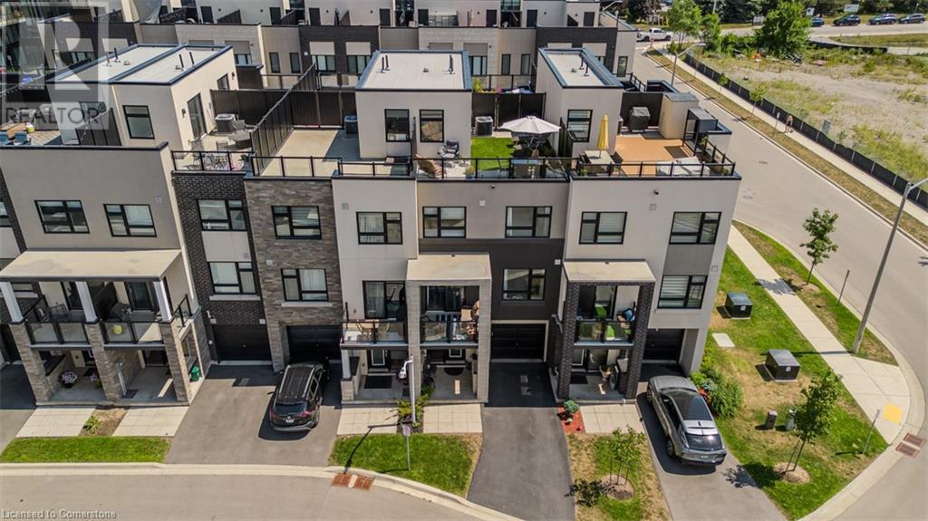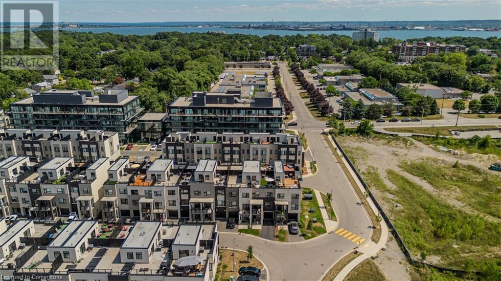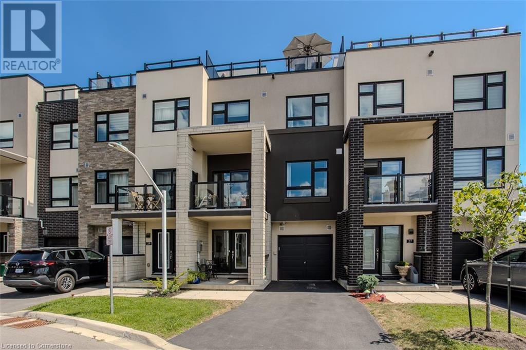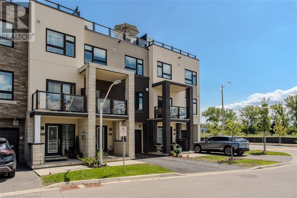 Welcome to this beautifully designed modern 3-storey townhome, perfectly located just minutes from the lake, downtown Burlington, parks, schools, and convenient transit options including the GO Station. Nestled in a quiet, family-friendly enclave, this pet-friendly home offers the ideal balance of comfort, style, and functionality—perfect for growing families, young professionals, or anyone looking to enjoy the best of Burlington living. One of the rare highlights of this unit is the 2-car private driveway—a unique feature that only two homes in the entire complex enjoy, providing unmatched parking convenience for your family and guests. Step into a bright and welcoming front entry with a convenient 2-piece powder room, perfect for guests. The second level showcases a seamless open-concept layout, ideal for both everyday living and entertaining. Wide plank laminate flooring flows throughout the spacious living and dining areas, where large windows and a walkout to your private balcony flood the space with natural light. At the heart of the home, the contemporary kitchen is sure to impress—featuring quartz countertops, stainless steel appliances, custom cabinetry, a stylish stacked tile backsplash, and a large island with breakfast bar, built-in microwave, and dishwasher. Upstairs, you’ll find a bright and airy primary retreat complete with a 3-piece ensuite boasting an oversized quartz vanity, porcelain tile floors, and a sleek stacked-tile walk-in shower with a glass door. An additional well-sized bedroom and a 4-piece main bath—with matching finishes and a tub/shower combo—offer the perfect layout for a growing family, guests, or a home office. Top it all off with a private rooftop terrace offering pond views and a glass railing—an ideal space to relax, dine, or entertain under the open sky. Whether you're looking for your first home or a stylish, low-maintenance space for your family, this thoughtfully designed townhome checks all the boxes. (id:24334)
