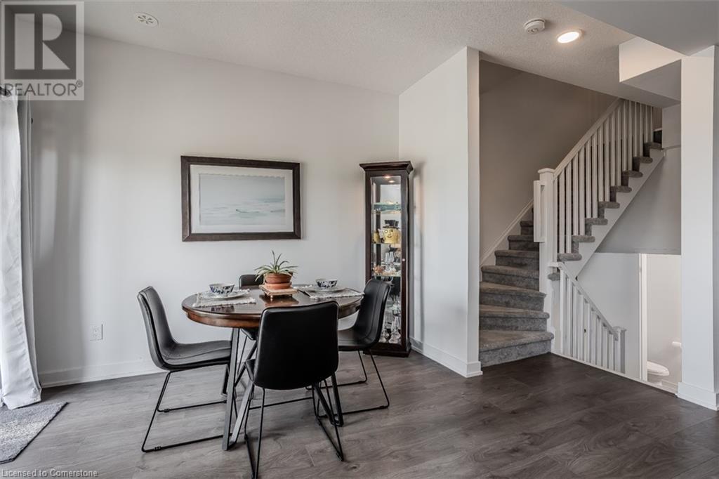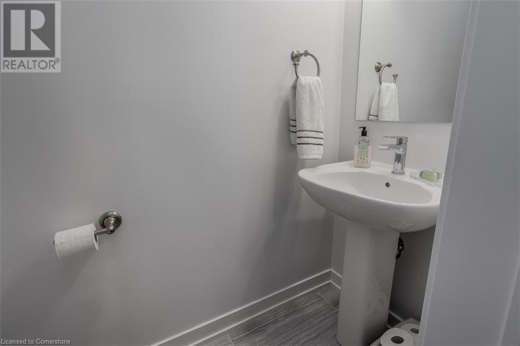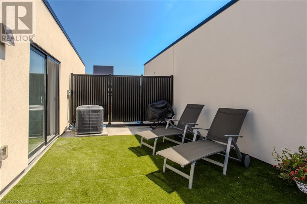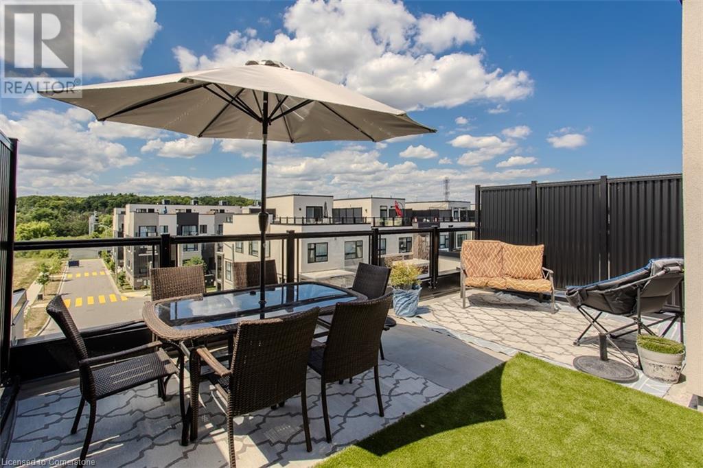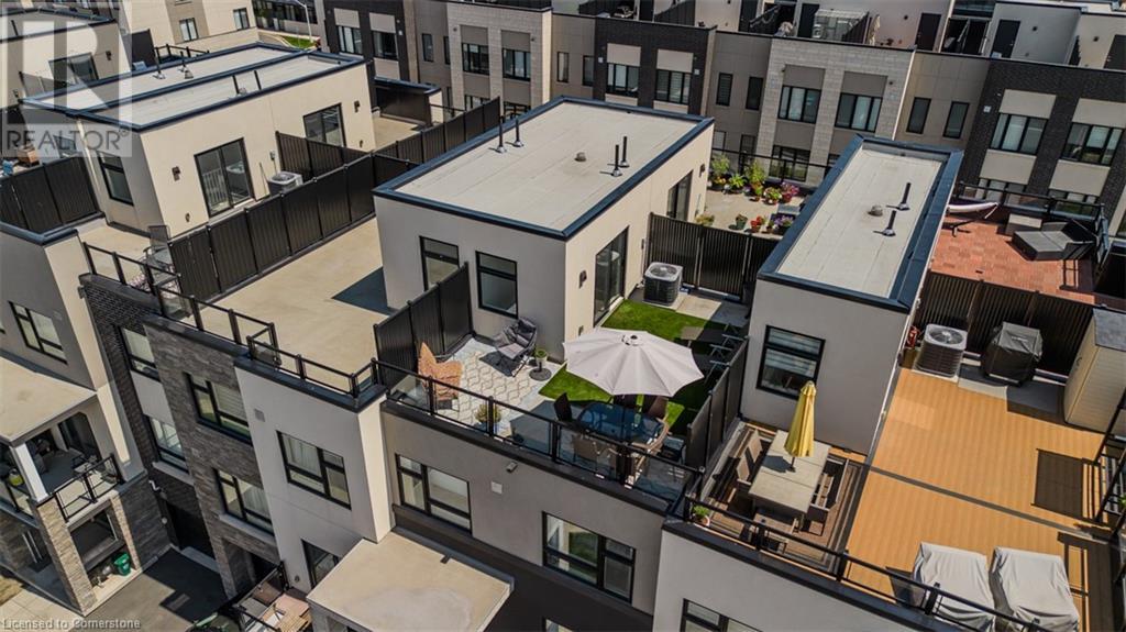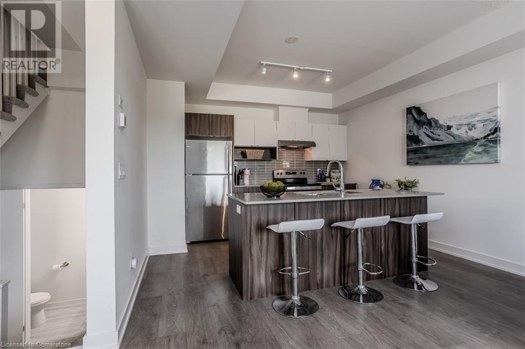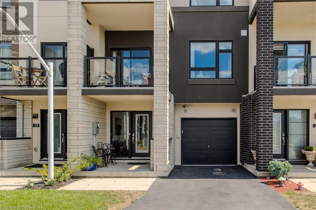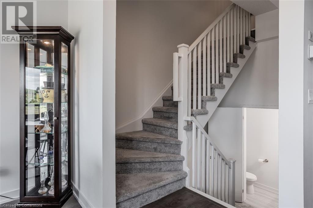 Welcome to this beautifully designed modern 3-storey townhome, perfectly located just minutes from the lake, downtown Burlington, parks, schools, and convenient transit options including the GO Station. Nestled in a quiet, family-friendly enclave, this pet-friendly home offers the ideal balance of comfort, style, and functionality—perfect for growing families, young professionals, or anyone looking to enjoy the best of Burlington living. One of the rare highlights of this unit is the 2-car private driveway—a unique feature that only two homes in the entire complex enjoy, providing unmatched parking convenience for your family and guests. Step into a bright and welcoming front entry with a convenient 2-piece powder room, perfect for guests. The second level showcases a seamless open-concept layout, ideal for both everyday living and entertaining. Wide plank laminate flooring flows throughout the spacious living and dining areas, where large windows and a walkout to your private balcony flood the space with natural light. At the heart of the home, the contemporary kitchen is sure to impress—featuring quartz countertops, stainless steel appliances, custom cabinetry, a stylish stacked tile backsplash, and a large island with breakfast bar, built-in microwave, and dishwasher. Upstairs, you’ll find a bright and airy primary retreat complete with a 3-piece ensuite boasting an oversized quartz vanity, porcelain tile floors, and a sleek stacked-tile walk-in shower with a glass door. An additional well-sized bedroom and a 4-piece main bath—with matching finishes and a tub/shower combo—offer the perfect layout for a growing family, guests, or a home office. Top it all off with a private rooftop terrace offering pond views and a glass railing—an ideal space to relax, dine, or entertain under the open sky. Whether you're looking for your first home or a stylish, low-maintenance space for your family, this thoughtfully designed townhome checks all the boxes. (id:24334)