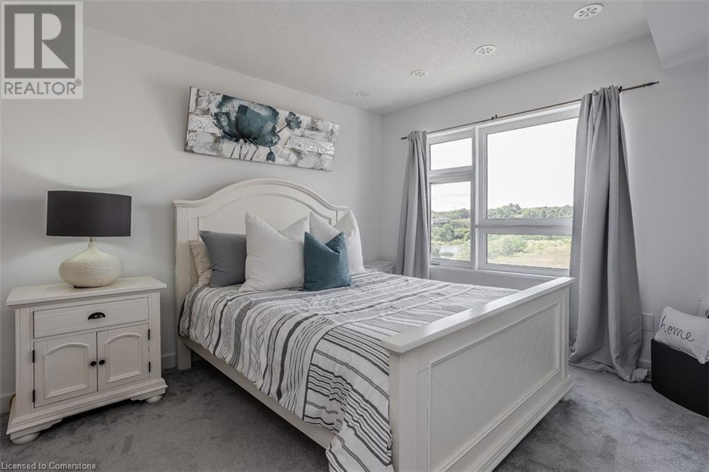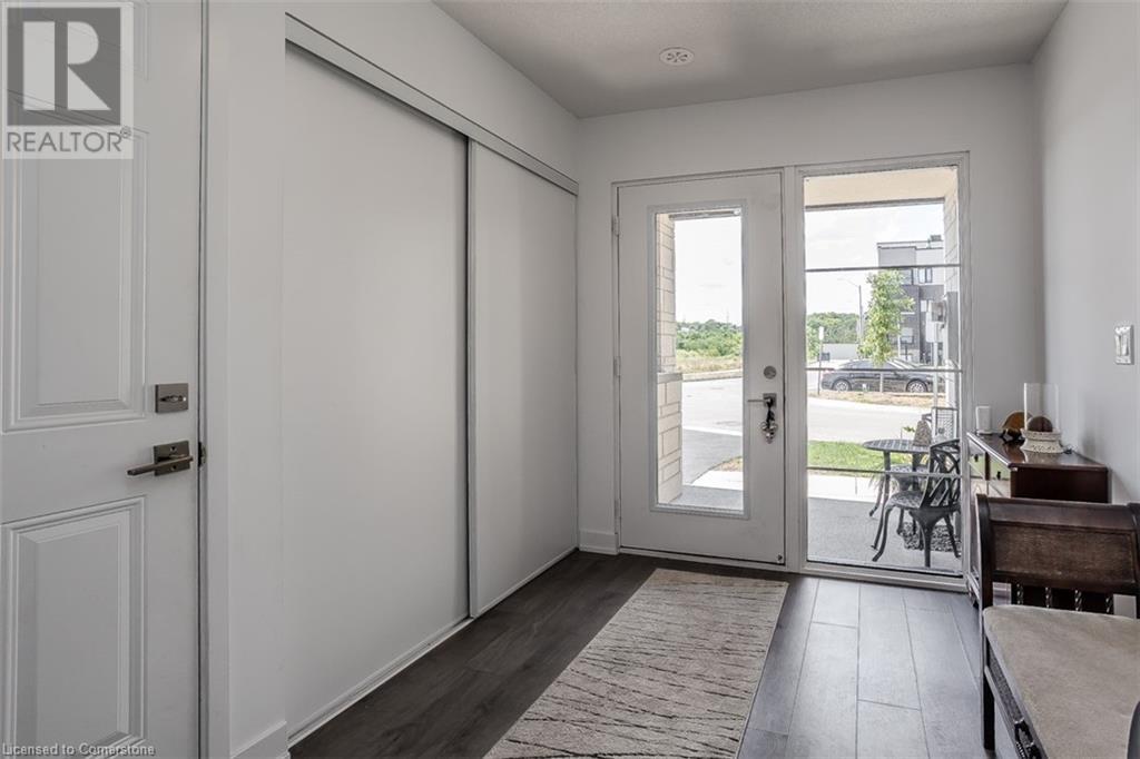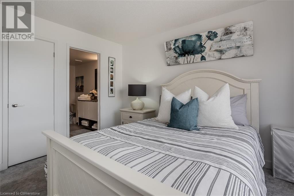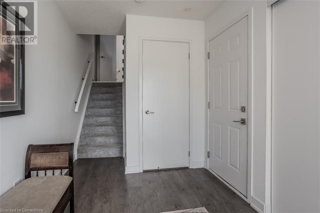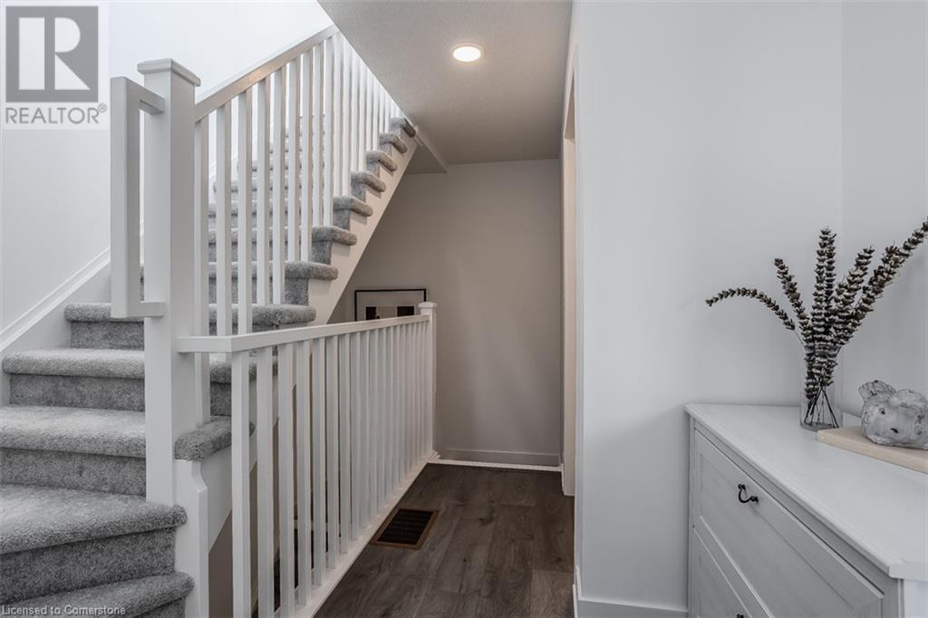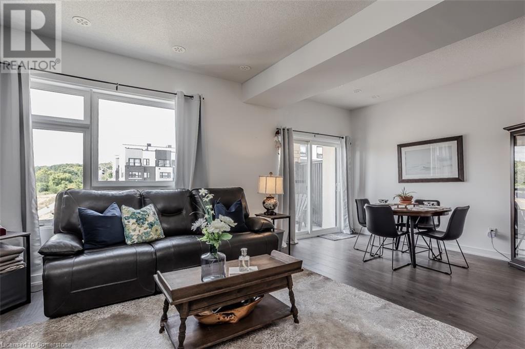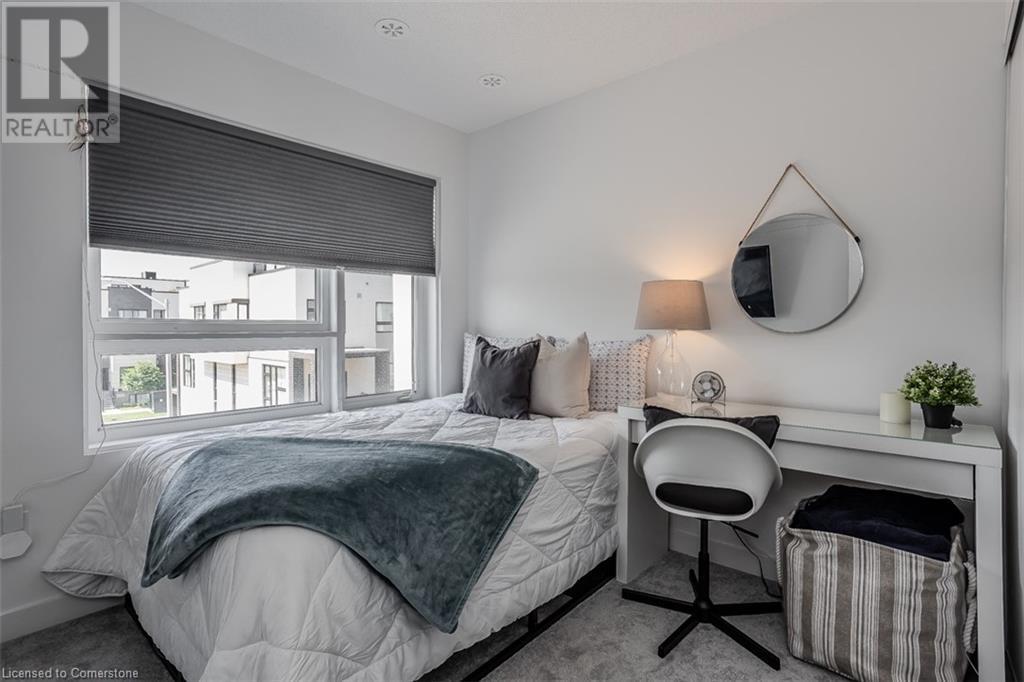 Welcome to this beautifully designed modern 3-storey townhome, perfectly located just minutes from the lake, downtown Burlington, parks, schools, and convenient transit options including the GO Station. Nestled in a quiet, family-friendly enclave, this pet-friendly home offers the ideal balance of comfort, style, and functionality—perfect for growing families, young professionals, or anyone looking to enjoy the best of Burlington living. One of the rare highlights of this unit is the 2-car private driveway—a unique feature that only two homes in the entire complex enjoy, providing unmatched parking convenience for your family and guests. Step into a bright and welcoming front entry with a convenient 2-piece powder room, perfect for guests. The second level showcases a seamless open-concept layout, ideal for both everyday living and entertaining. Wide plank laminate flooring flows throughout the spacious living and dining areas, where large windows and a walkout to your private balcony flood the space with natural light. At the heart of the home, the contemporary kitchen is sure to impress—featuring quartz countertops, stainless steel appliances, custom cabinetry, a stylish stacked tile backsplash, and a large island with breakfast bar, built-in microwave, and dishwasher. Upstairs, you’ll find a bright and airy primary retreat complete with a 3-piece ensuite boasting an oversized quartz vanity, porcelain tile floors, and a sleek stacked-tile walk-in shower with a glass door. An additional well-sized bedroom and a 4-piece main bath—with matching finishes and a tub/shower combo—offer the perfect layout for a growing family, guests, or a home office. Top it all off with a private rooftop terrace offering pond views and a glass railing—an ideal space to relax, dine, or entertain under the open sky. Whether you're looking for your first home or a stylish, low-maintenance space for your family, this thoughtfully designed townhome checks all the boxes. (id:24334)