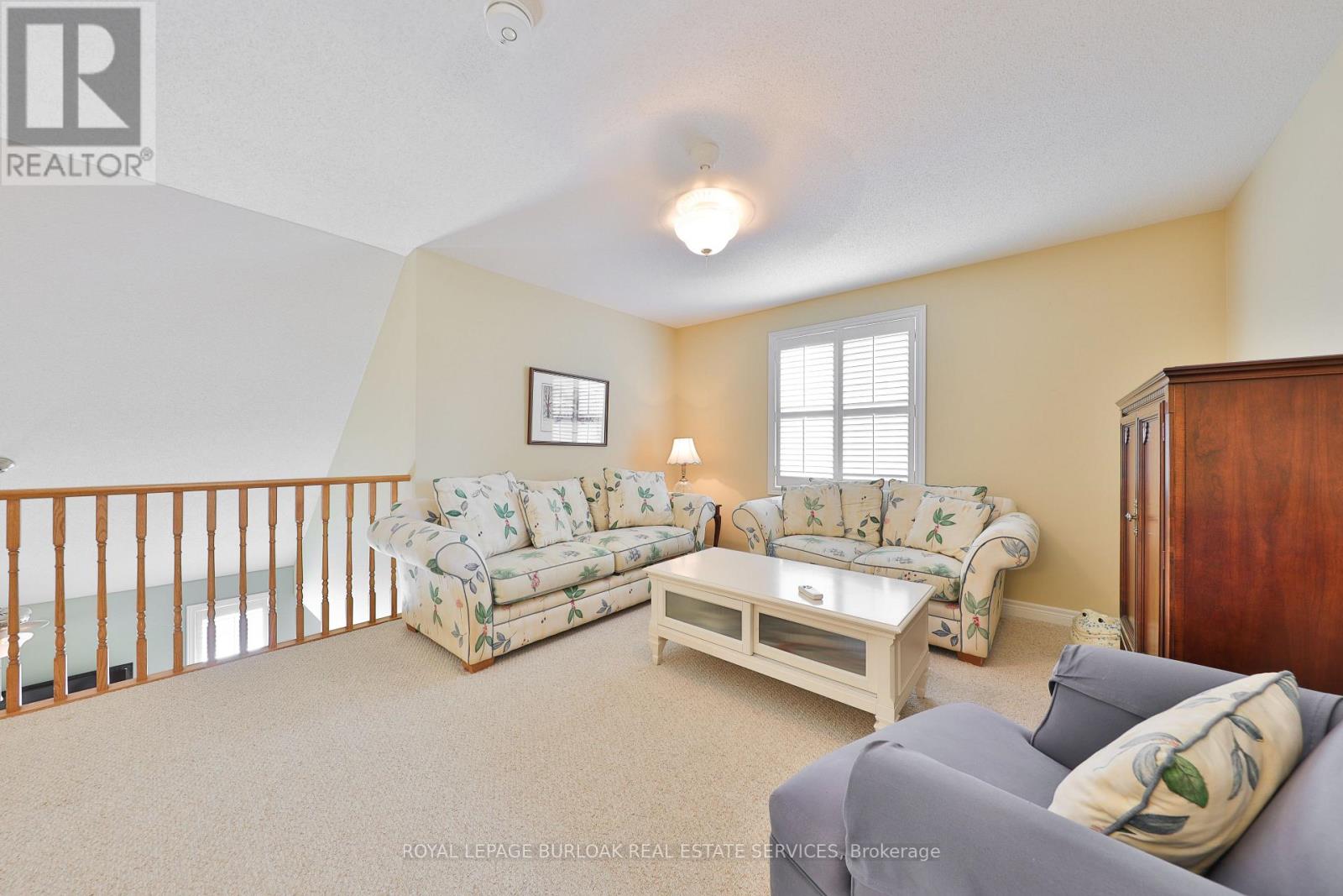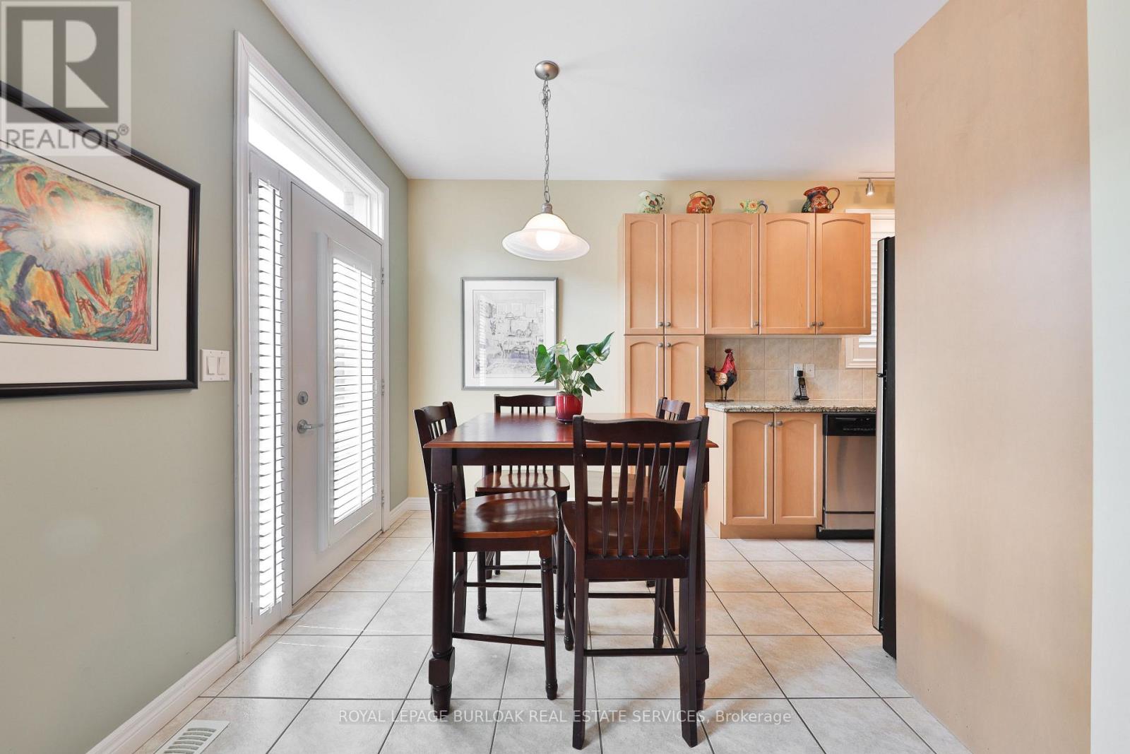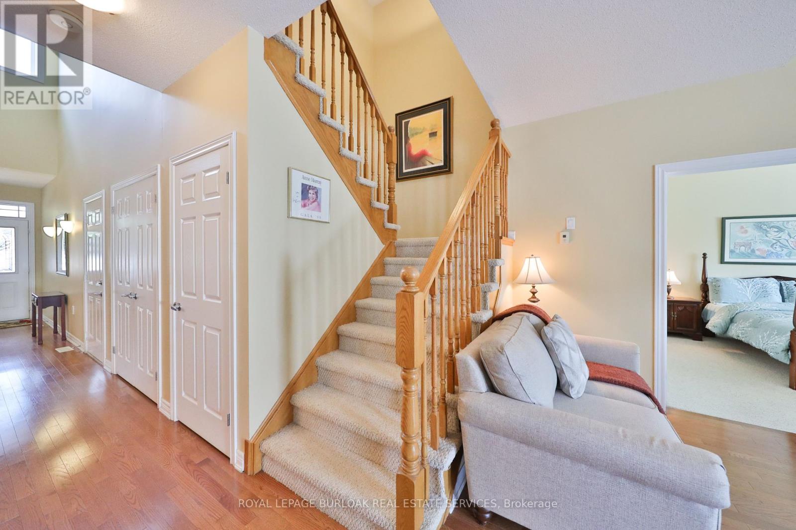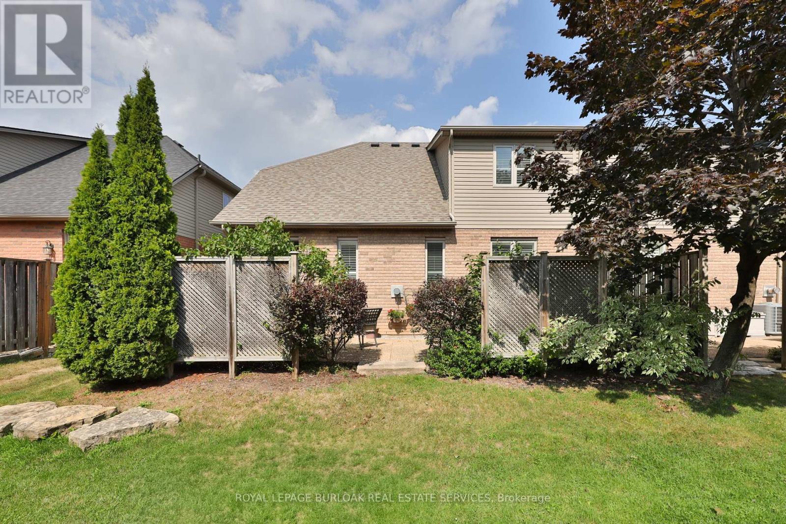 Welcome to this stunning bungaloft townhome, set within one of Burlington's most desirable lifestyle communities. Combining comfort and convenience, this residence offers total parking for 4 vehicles, a landscaped front yard framed by mature trees, and an automatic garage with inside entry. Its location is ideal just steps from scenic parks, vibrant shopping, and dining options, all with effortless access to major highways for commuting or weekend getaways. Inside, you'll find gleaming hardwood floors flowing throughout the main level, creating a warm, cohesive feel. The eat-in kitchen is both stylish and functional, featuring granite countertops, ample cabinetry, a tile backsplash, and stainless steel appliances. A walkout leads directly to your private backyard retreat, perfect for al fresco dining or relaxing with friends. The living room, highlighted by a soaring vaulted ceiling and cozy gas fireplace, offers an inviting space to gather, while the dining room provides a refined setting for entertaining. The main floor primary suite enhances everyday ease with its walk-in closet and 3pc ensuite, making it a perfect haven at days end. A versatile home office easily convertible to an additional bedroom and a 2pc bathroom complete this level. Upstairs, a bright and airy loft area offers flexible living potential ideal as a lounge, reading nook, or creative workspace, accompanied by a spacious bedroom with walk-in closet and a full 4pc bathroom. The lower level, currently unfinished, features a bathroom rough-in and unlimited potential to design the space of your dreams, whether that's a gym, media room, or additional living quarters. The private backyard is a true extension of the home, with an aggregate patio bordered by lush cedars for privacy. A sprinkler system, maintained by the condo, ensures effortless upkeep. This is more than a home its an opportunity to embrace a vibrant, well-connected lifestyle in a fantastic community. (id:24334)