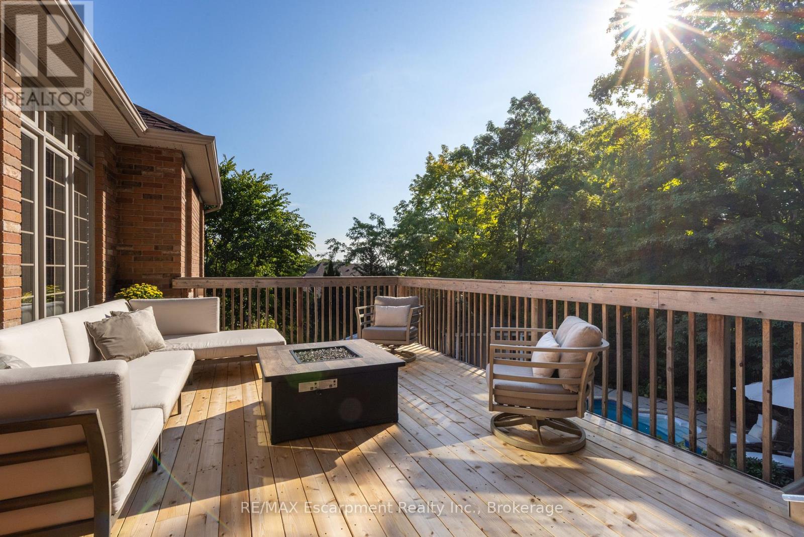 Discover this exceptional custom executive bungalow with southern exposure positioned at the end of a peaceful cul-de-sac on a 1/3 acre lot,where luxury meets tranquility backing onto a wooded ravine connecting the Bruce Trail and all its beauty.This stunning 3+1 bdrm,3.5 bath residence spans 6,327 sq ft of meticulously designed living space,perfectly situated in Burlington's desirable Escarpment neighbourhood.Natural light cascades throughout the home,enhanced by impressive 10-12ft ceilings on the main level and over 9 -12ft ceilings on the lower level.Open concept Great Room features hardwood flooring and a cozy gas f/p flowing seamlessly into the gourmet kitchen.The kitchen showcases pristine cabinetry,a large island and breakfast area w/ convenient access to the outdoor 16ft x 22ft balcony overlooking your backyard.The perfect places for casual entertaining. Elegant formal dining room accommodates larger gatherings, while a separate main-floor office provides a quiet workspace.The oversized primary bdrm offers a private retreat with gas f/p,spacious w/i closet,and updated 5 pc ensuite. 2 addt'l bedrooms, 4 pc bath, and powder room complete the main level along with the practical elements of a laundry room with direct garage access.The finished LL expands living options w/ a rec room complete with pool table area,media room,and a gym area with direct access to the yard. Guest bedroom is located next to a 4-pc bath.The Utility room w/ 12ft ceiling provides ample storage,maximize functionality.Step outside to discover a private retreat w/ manicured gardens featuring an inground saltwater pool & extensive entertaining areas accessible through 2 separate walkouts from the LL.A double oversize garage provides space for a car storage lift system. This prime location offers convenient access to highways,shopping,walking trails,& golf, creating the perfect blend of suburban serenity and urban convenience. Freshly paint thru/out ensures move-in readiness. LUXURY CERTIFIED (id:24334)