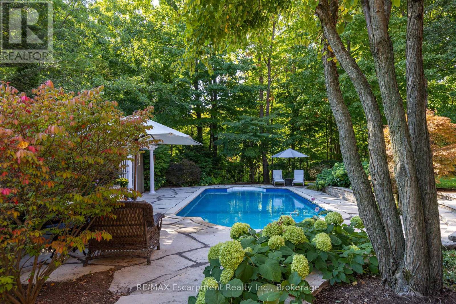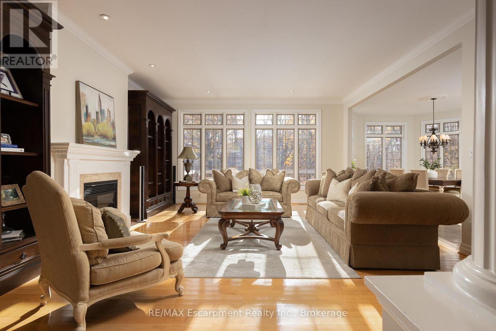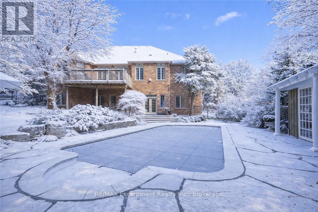 Discover this exceptional custom executive bungalow with southern exposure positioned at the end of a peaceful cul-de-sac on a 1/3 acre lot,where luxury meets tranquility backing onto a wooded ravine connecting the Bruce Trail and all its beauty.This stunning 3+1 bdrm,3.5 bath residence spans 6,327 sq ft of meticulously designed living space,perfectly situated in Burlington's desirable Escarpment neighbourhood.Natural light cascades throughout the home,enhanced by impressive 10-12ft ceilings on the main level and over 9 -12ft ceilings on the lower level.Open concept Great Room features hardwood flooring and a cozy gas f/p flowing seamlessly into the gourmet kitchen.The kitchen showcases pristine cabinetry,a large island and breakfast area w/ convenient access to the outdoor 16ft x 22ft balcony overlooking your backyard.The perfect places for casual entertaining. Elegant formal dining room accommodates larger gatherings, while a separate main-floor office provides a quiet workspace.The oversized primary bdrm offers a private retreat with gas f/p,spacious w/i closet,and updated 5 pc ensuite. 2 addt'l bedrooms, 4 pc bath, and powder room complete the main level along with the practical elements of a laundry room with direct garage access.The finished LL expands living options w/ a rec room complete with pool table area,media room,and a gym area with direct access to the yard. Guest bedroom is located next to a 4-pc bath.The Utility room w/ 12ft ceiling provides ample storage,maximize functionality.Step outside to discover a private retreat w/ manicured gardens featuring an inground saltwater pool & extensive entertaining areas accessible through 2 separate walkouts from the LL.A double oversize garage provides space for a car storage lift system. This prime location offers convenient access to highways,shopping,walking trails,& golf, creating the perfect blend of suburban serenity and urban convenience. Freshly paint thru/out ensures move-in readiness. LUXURY CERTIFIED (id:24334)