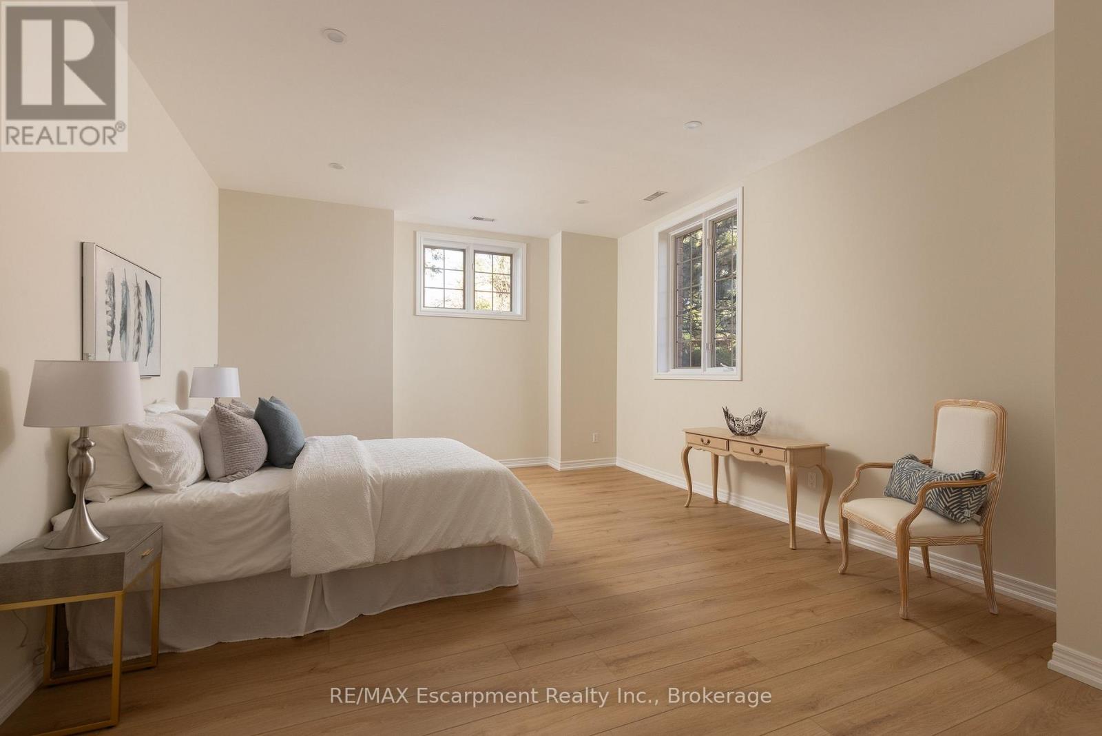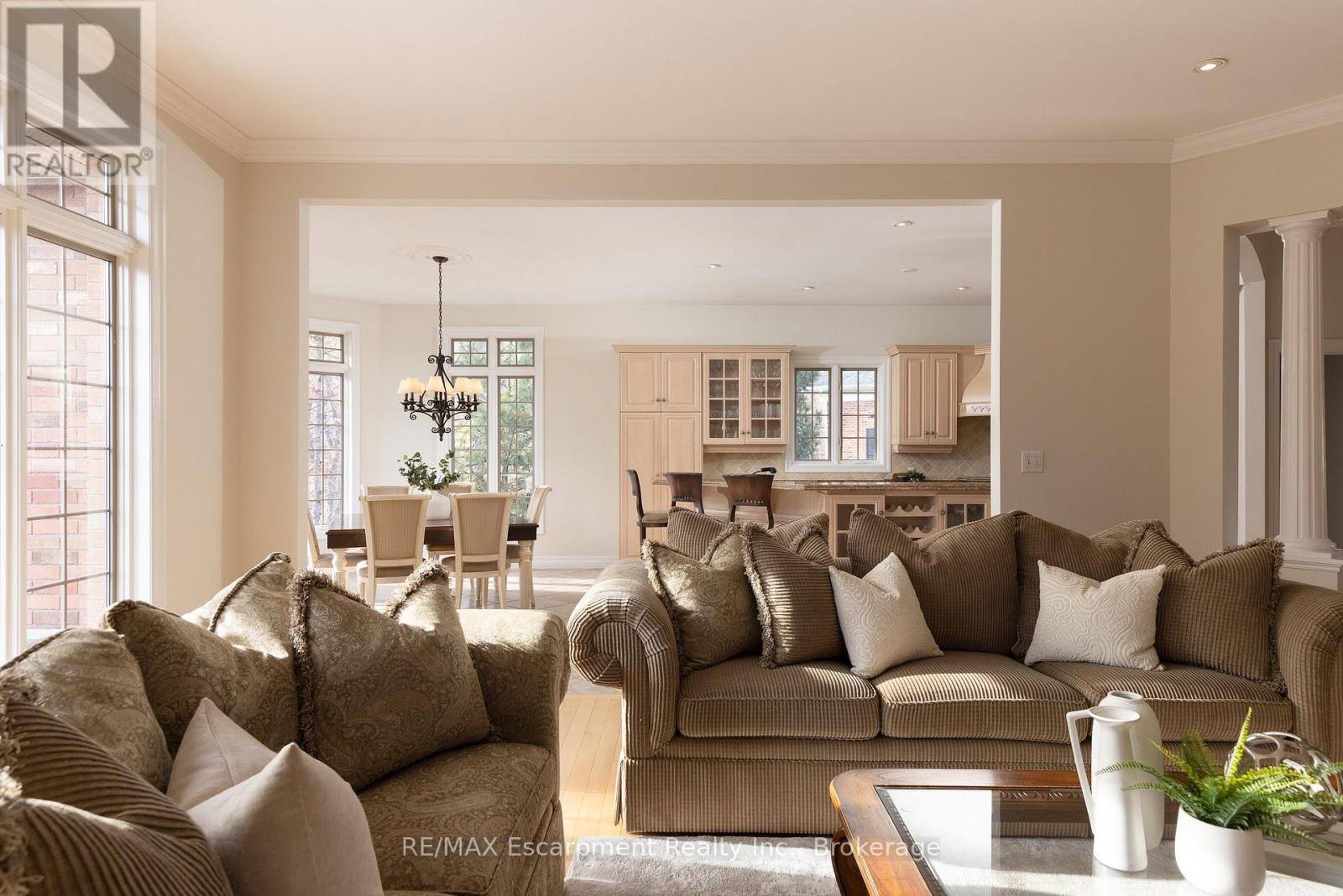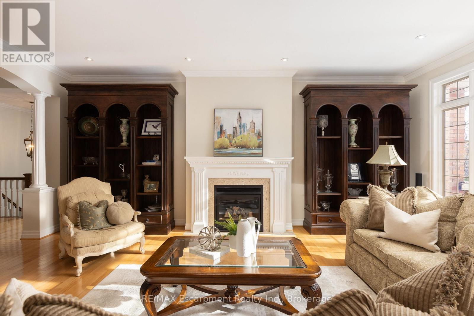Discover this exceptional custom executive bungalow with southern exposure positioned at the end of a peaceful cul-de-sac on a 1/3 acre lot,where luxury meets tranquility backing onto a wooded ravine connecting the Bruce Trail and all its beauty.This stunning 3+1 bdrm,3.5 bath residence spans 6,327 sq ft of meticulously designed living space,perfectly situated in Burlington's desirable Escarpment neighbourhood.Natural light cascades throughout the home,enhanced by impressive 10-12ft ceilings on the main level and over 9 -12ft ceilings on the lower level.Open concept Great Room features hardwood flooring and a cozy gas f/p flowing seamlessly into the gourmet kitchen.The kitchen showcases pristine cabinetry,a large island and breakfast area w/ convenient access to the outdoor 16ft x 22ft balcony overlooking your backyard.The perfect places for casual entertaining. Elegant formal dining room accommodates larger gatherings, while a separate main-floor office provides a quiet workspace.The oversized primary bdrm offers a private retreat with gas f/p,spacious w/i closet,and updated 5 pc ensuite. 2 addt'l bedrooms, 4 pc bath, and powder room complete the main level along with the practical elements of a laundry room with direct garage access.The finished LL expands living options w/ a rec room complete with pool table area,media room,and a gym area with direct access to the yard. Guest bedroom is located next to a 4-pc bath.The Utility room w/ 12ft ceiling provides ample storage,maximize functionality.Step outside to discover a private retreat w/ manicured gardens featuring an inground saltwater pool & extensive entertaining areas accessible through 2 separate walkouts from the LL.A double oversize garage provides space for a car storage lift system. This prime location offers convenient access to highways,shopping,walking trails,& golf, creating the perfect blend of suburban serenity and urban convenience. Freshly paint thru/out ensures move-in readiness. LUXURY CERTIFIED (id:24334)