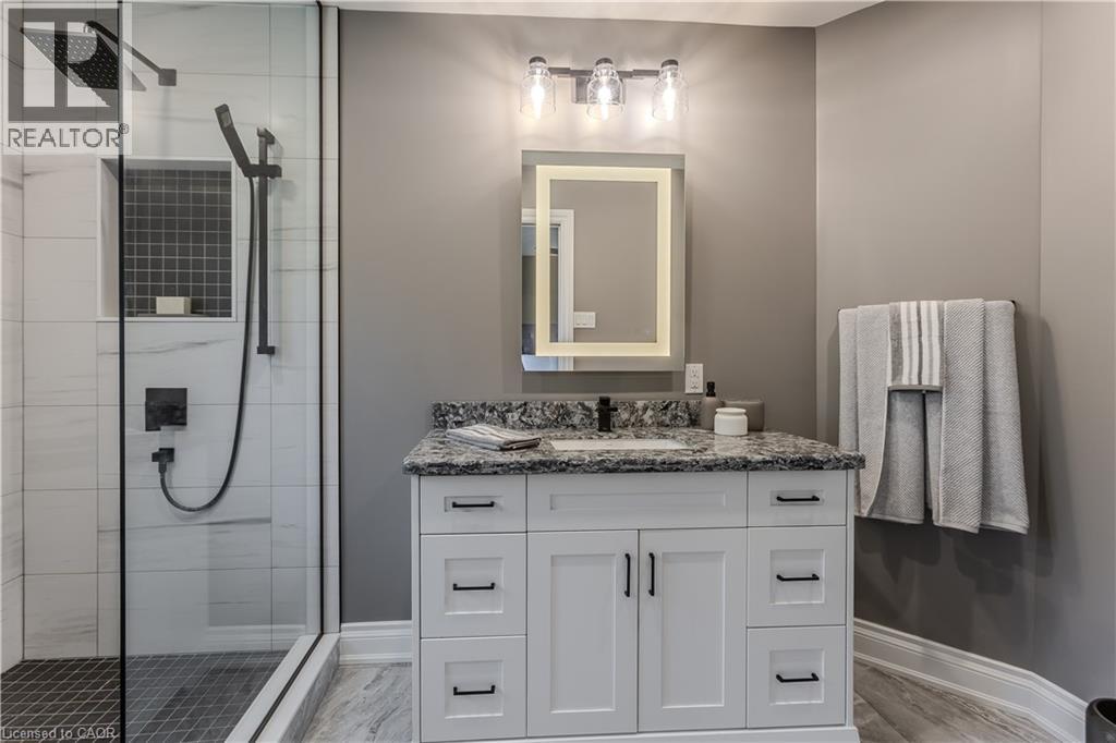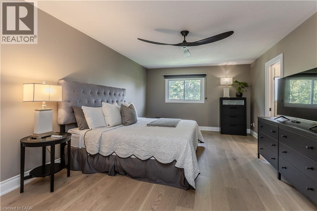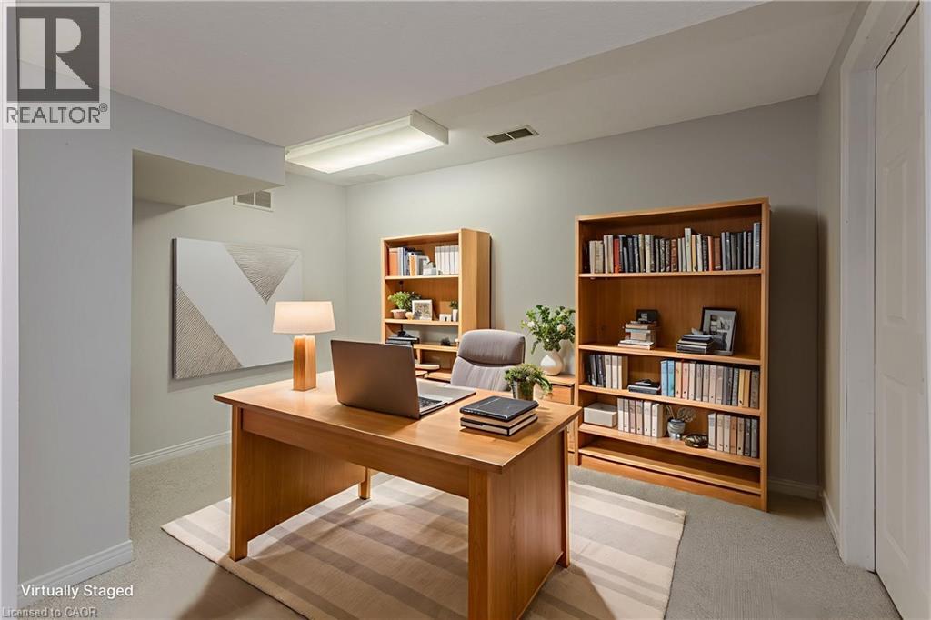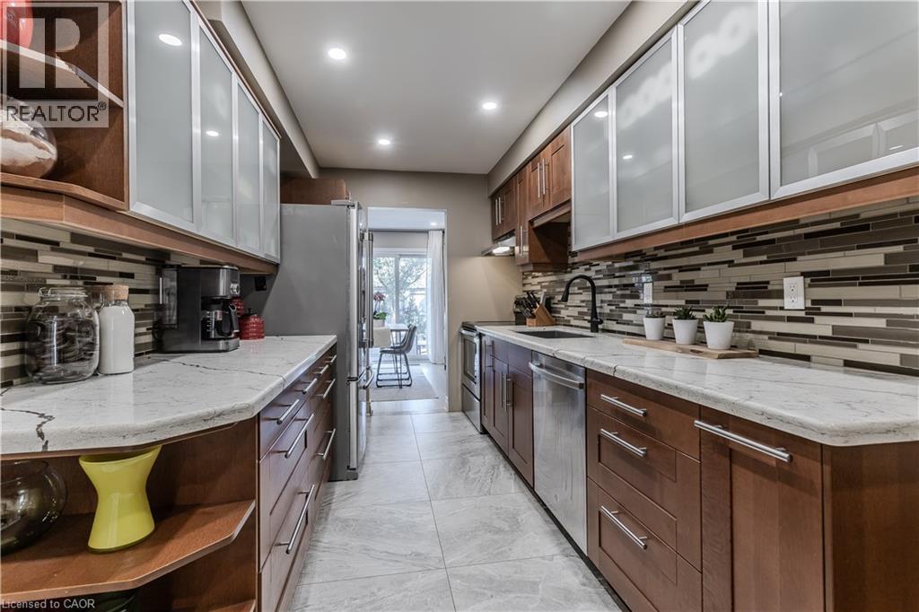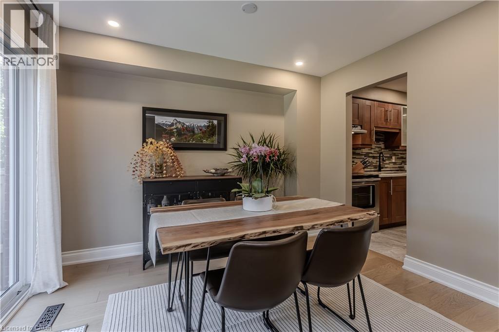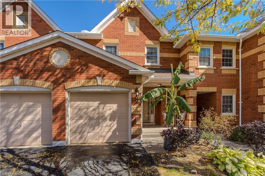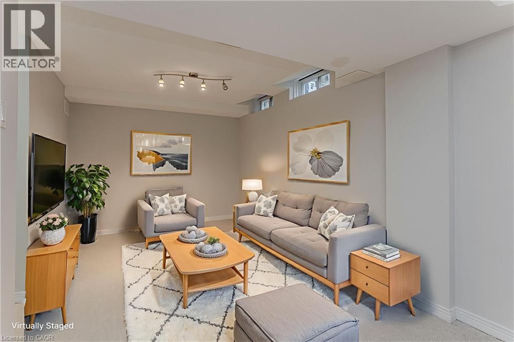 Welcome to this spacious executive townhome offering over 2,100sf of modern, move-in ready living space in the sought-after Tyandaga Highlands community. Perfectly situated with quick access to major highways, parks, schools, shopping, and everyday amenities, this home combines convenience, comfort, and style—making it an ideal choice for new families looking to settle in Burlington. The front exterior greets you with perennial gardens, a charming covered porch, and an attached garage with inside entry. Step inside to find a welcoming foyer with sleek modern tile leading into a functional main floor layout. Newer pot lights (2021) and wide-plank hardwood floors flow throughout, complementing the bright and open living and dining areas. The upgraded kitchen is a true highlight with quartz countertops, custom cabinetry, stainless steel appliances, and a stylish tile backsplash. The dining room, open to the living room, provides a seamless flow for family gatherings and features a walkout to the rear yard. A modern 2-piece powder room and upgraded wood staircase with iron spindles (2021) complete this level. Upstairs, the expansive primary retreat serves as a peaceful escape with a large walk-in closet and a renovated spa-like ensuite (2021) featuring an oversized glass walk-in shower and LED mirror. An additional generously sized bedroom and a 4-piece main bathroom provide plenty of space for children, guests, or a home office. The fully finished lower level offers even more living space with newly upgraded carpet (2025), a spacious recreation room, laundry, and ample storage. Whether you need a playroom, media lounge, or private office, this versatile level adapts to your family’s lifestyle. The rear yard is designed for easy maintenance and everyday enjoyment with patio stones, privacy walls, and shared green space. Every detail has been thoughtfully updated and cared for, offering a turnkey lifestyle in one of Burlington’s most desirable neighbourhoods. (id:24334)