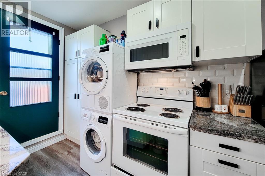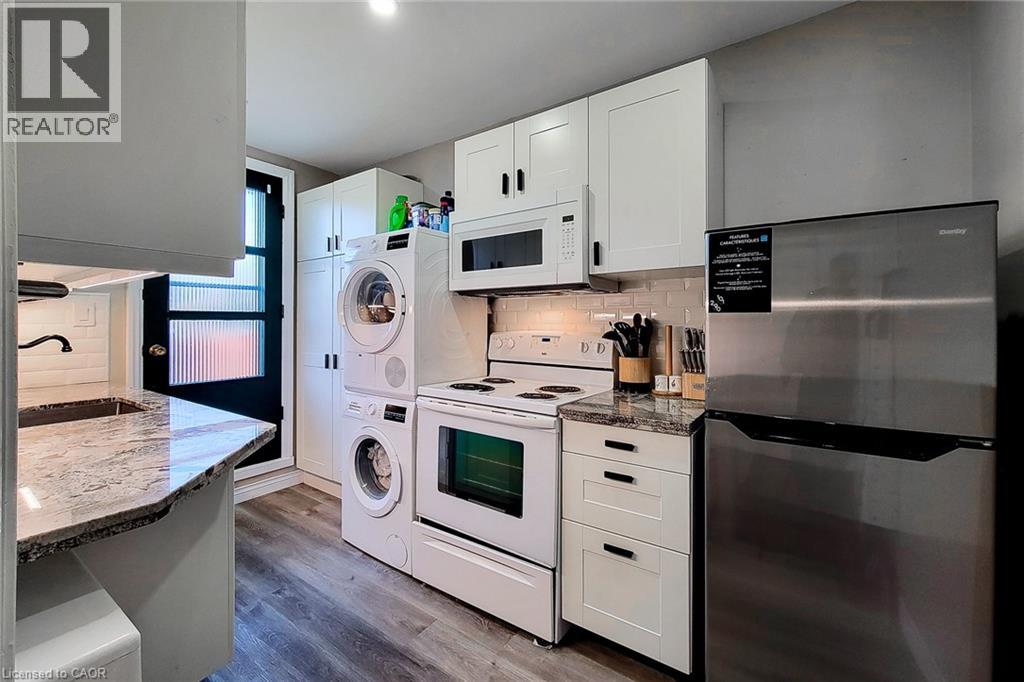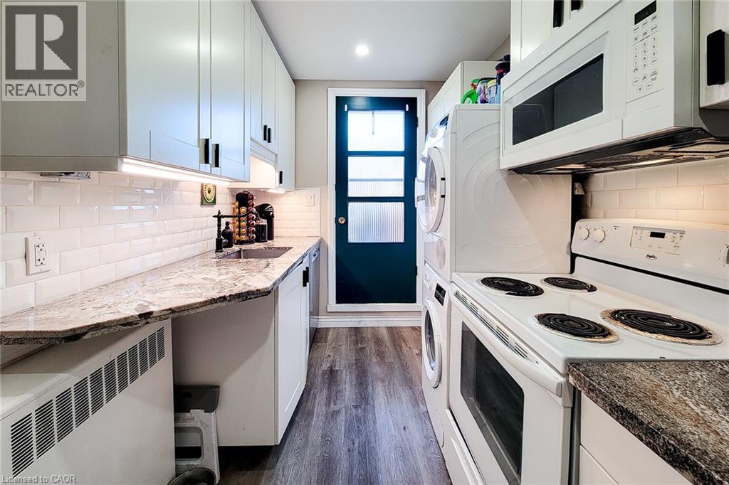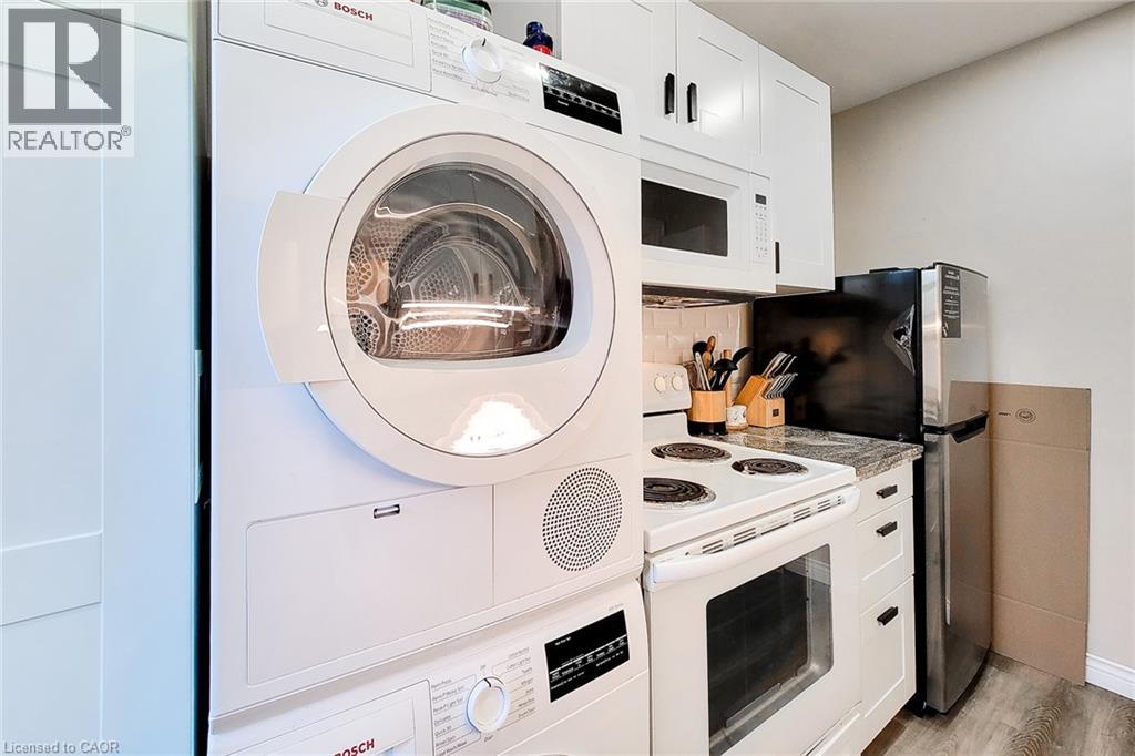 Discover an inviting, contemporary urban retreat in the heart of downtown Burlington. This beautifully designed 800 sq. ft. residence offers a bright and airy layout that blends comfort with modern sophistication. Featuring one bedroom, an updated 3-piece bathroom, and a kitchen equipped with an in-unit washer/dryer that opens into the spacious, open-concept living and dining area. Step outside onto the expansive private patio—an exceptional extension of your living space, perfect for relaxing, entertaining, or simply enjoying the outdoors. Live steps from Burlington’s best: the lakefront, beach, pier, vibrant shops and restaurants, Spencer Smith Park, and countless local amenities. A warm, upscale sanctuary in a truly unbeatable location. Welcome home! (id:24334)