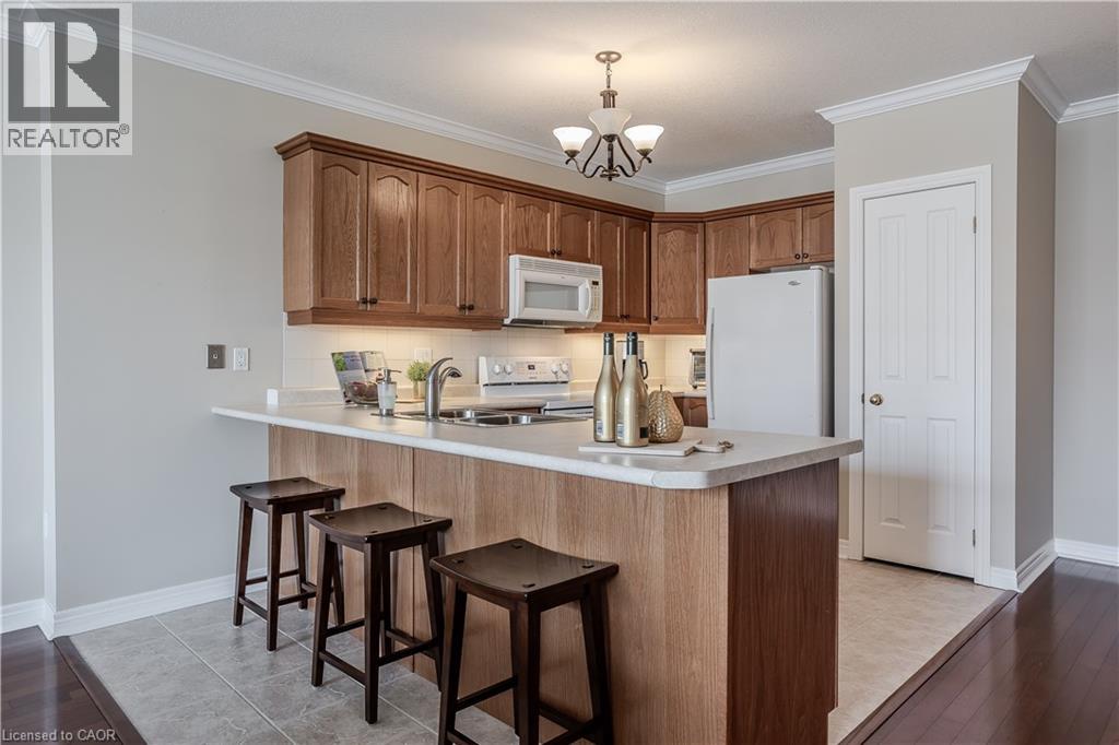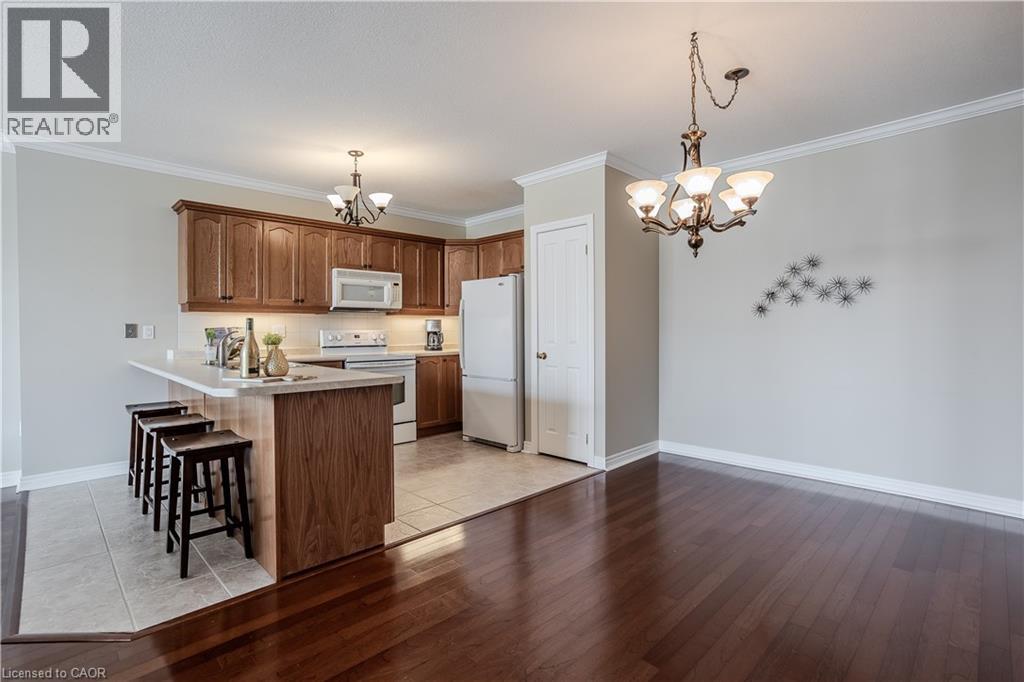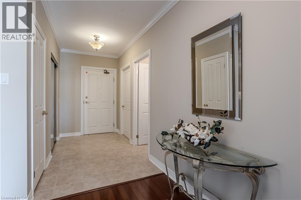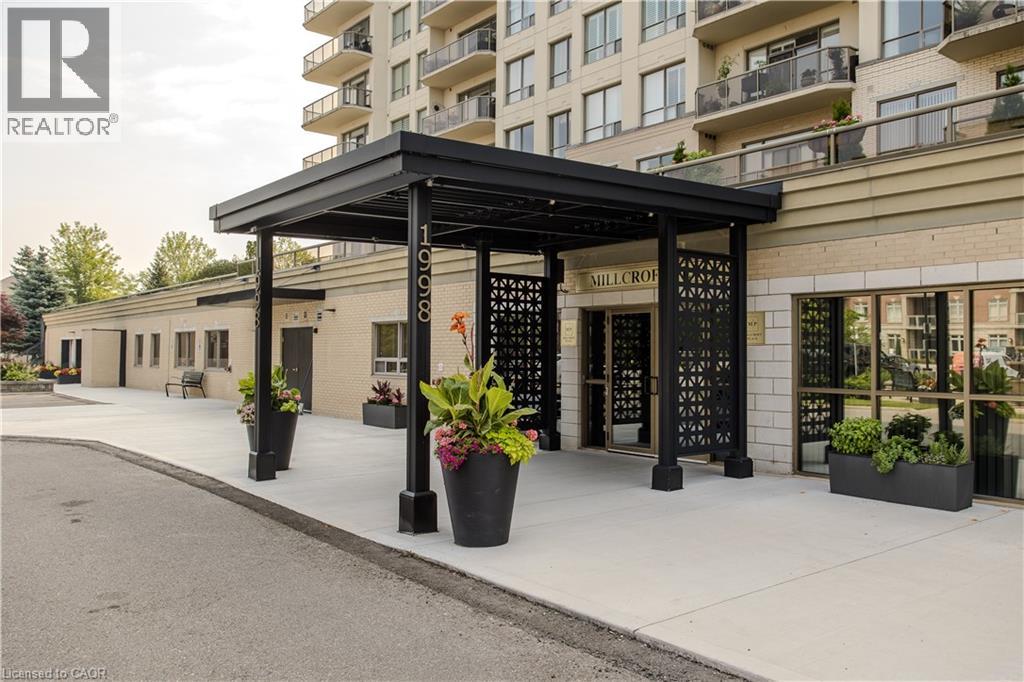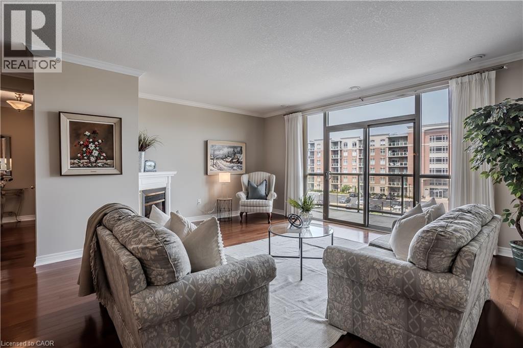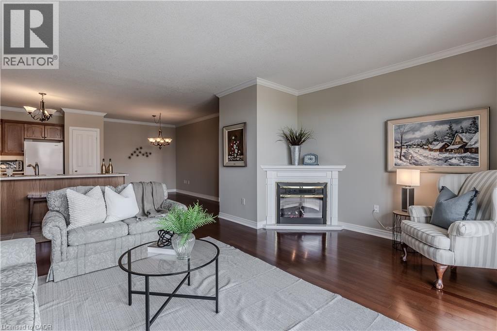 Welcome to Millcroft Place—where thoughtful design meets carefree living in the heart of Uptown Burlington. This sought-after residence is ideal for those looking to downsize without compromise, offering a spacious layout, elegant finishes, and a vibrant community. You’ll enjoy the ease of a low-maintenance lifestyle with shopping, dining, transit, parks, and trails all within walking distance. From the moment you walk in, you’ll appreciate the crown moulding throughout, warm hardwood flooring in the main living areas, and oversized windows that flood the space with natural light. The kitchen is as functional as it is welcoming, with a peninsula breakfast bar, classic tile backsplash, ample cabinetry, and a pantry for all your essentials. Whether you're hosting dinner or enjoying a quiet meal at home, the full-sized dining area offers the flexibility and space to suit your lifestyle. The living room is expansive and inviting, anchored by a cozy gas fireplace that adds warmth and charm to the space. Walk out onto the large, private balcony with sleek glass railing—perfect for relaxing with your morning coffee, tending to a container garden, or watching the sunset in peace. The primary bedroom is a true retreat with a large window, walk-in closet, and private 3-piece ensuite featuring a sleek glass shower. A second bedroom provides space for guests, a home office, or hobbies, while the 4-piece main bathroom offers a quartz-topped vanity and modern finishes. Additional conveniences include in-suite laundry, one underground parking space, and a private storage locker. Enjoy a friendly, well-maintained building with top-tier amenities including an exercise centre, party room, beautifully appointed indoor and outdoor seating areas, and ample visitor parking. All of this just steps from shopping, dining, transit, and Millcroft’s scenic parks and trails. This is downsizing done right—welcome home. (id:24334)