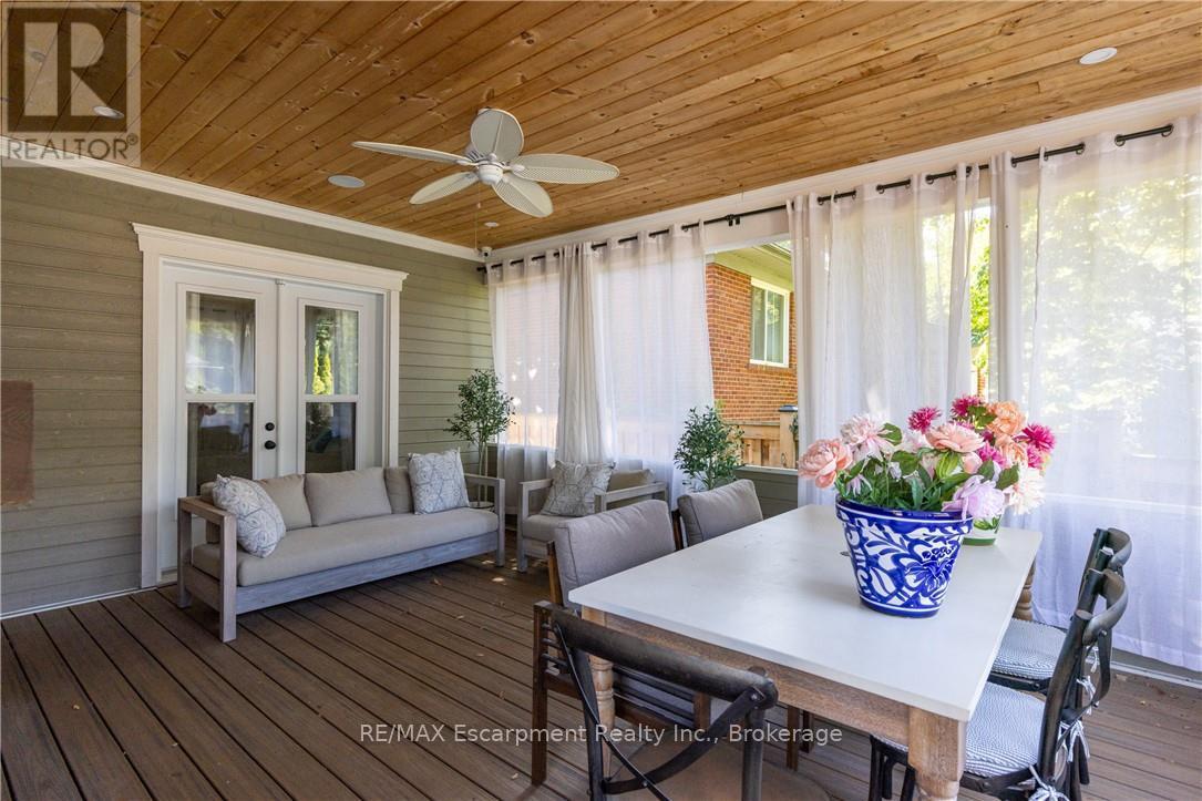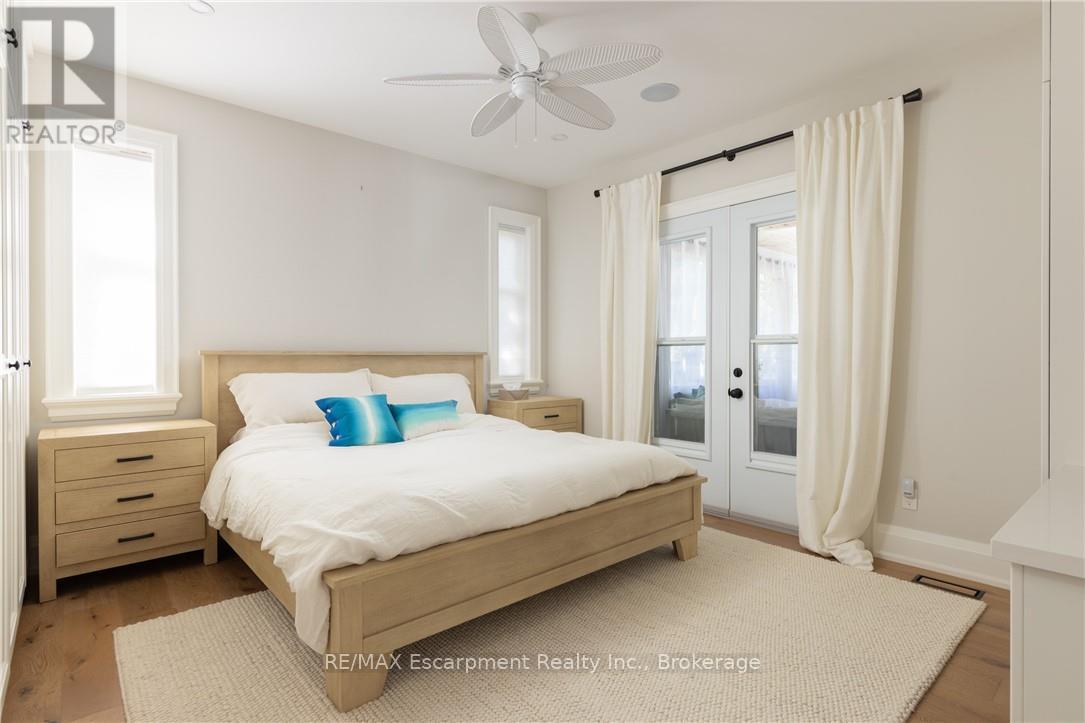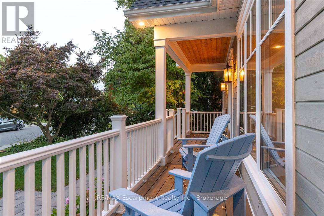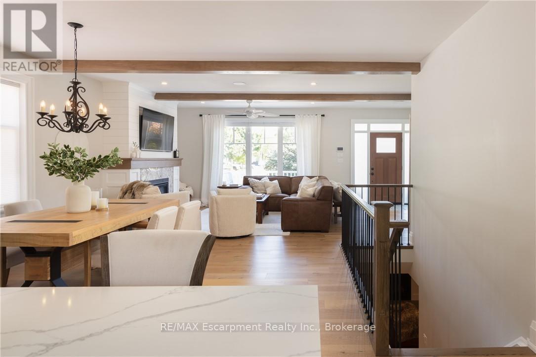 CUSTOM RENOVATION BUNGALOW. This exceptional residence is the perfect blend of modern luxury, thoughtful design, and everyday comfort. The open-concept main floor is bathed in natural light, showcasing high ceilings, wide-plank hardwood floors, and refined designer finishes throughout. The Great Room focal point is the gas fireplace and detailed surround open to the dining room area for easy entertaining. The chefs kitchen is a true showpiece, featuring quartz countertops, a 6-burner gas range, premium stainless-steel appliances, and a cleverly concealed walk-in pantry a seamless balance of beauty and function. The primary suite is a private retreat with a custom PAX closet system and a spa-inspired 3-piece semi-ensuite complete with a glass shower and heated floors. A second bedroom can also be used as a main floor office. From either the primary bedroom or the mudroom, step outside to a 400 sq. ft. covered porch where a fireplace and built-in TV space create a 3 season indoor-outdoor haven. The lower level offers an expansive extension of living space with a welcoming family/games room, a 4-piece bathroom, gym area, laundry room, and two additional bedrooms perfect for guests, hobbies, or a growing family. Outdoors, the fully fenced and landscaped backyard sets the stage for effortless entertaining and relaxation. Additional highlights include 9 ft. ceilings, hardwood flooring throughout, a heated detached double-car garage with easy access to attic storage, and a whole-home integrated security system with cameras and sound system. Every detail has been carefully curated in this exquisitely designed home, offering a move-in-ready lifestyle with upgrades too numerous to list. This is a property you'll want to experience firsthand. Located a short stroll to shops and restaurants of downtown Burlington and close proximity to highway access. (id:24334)