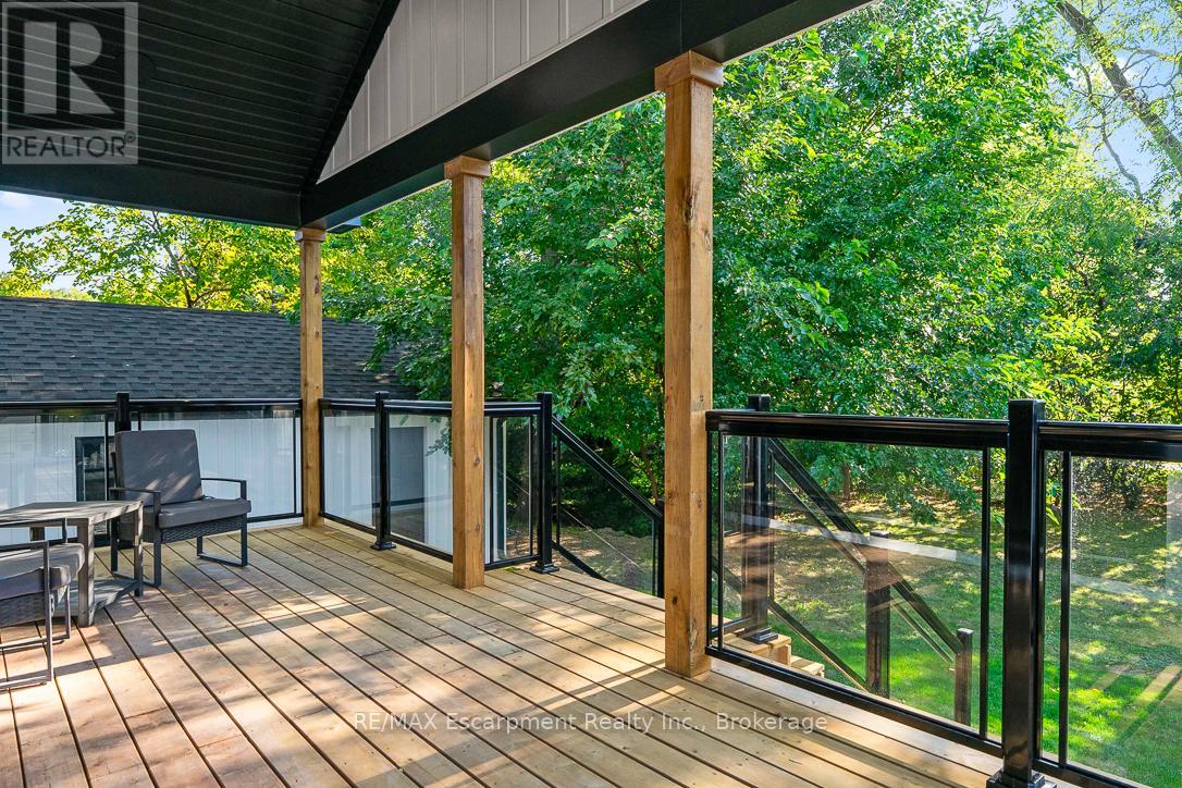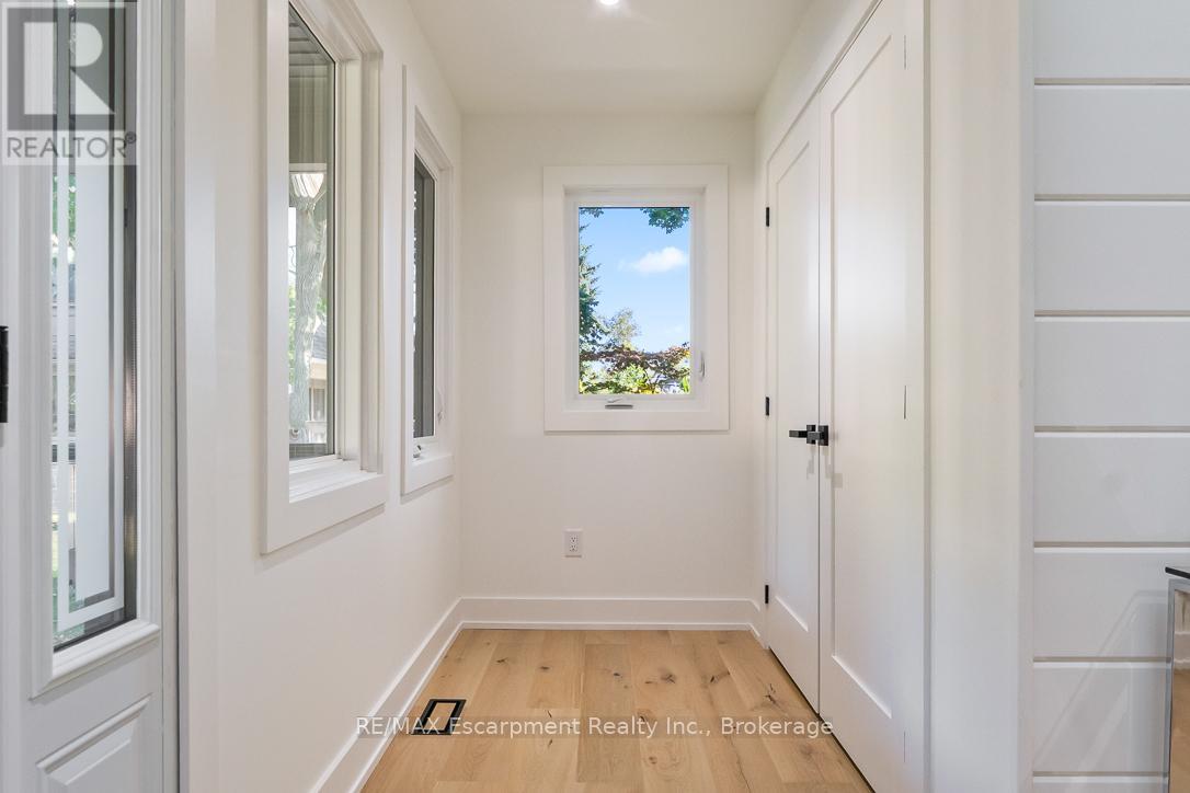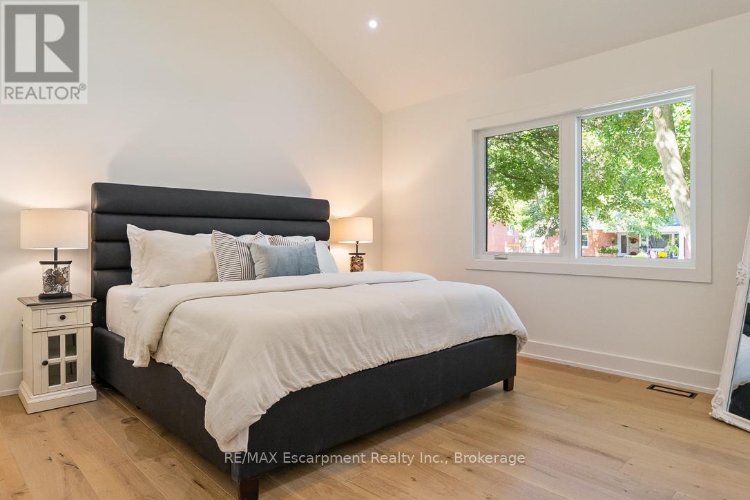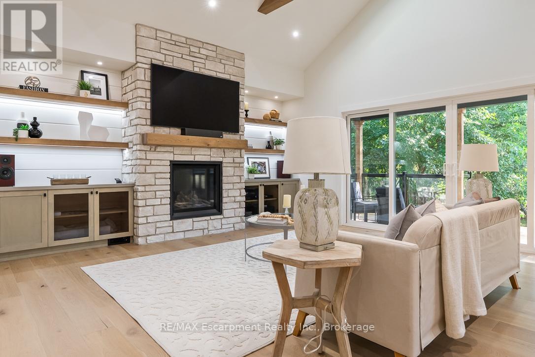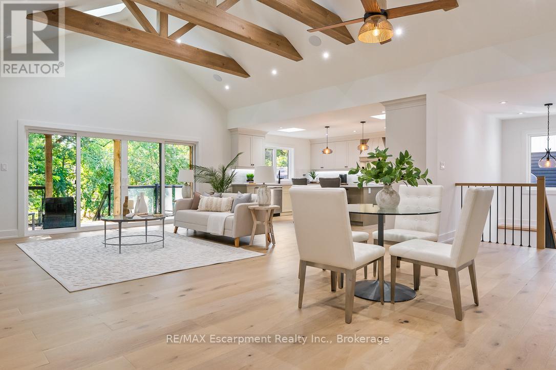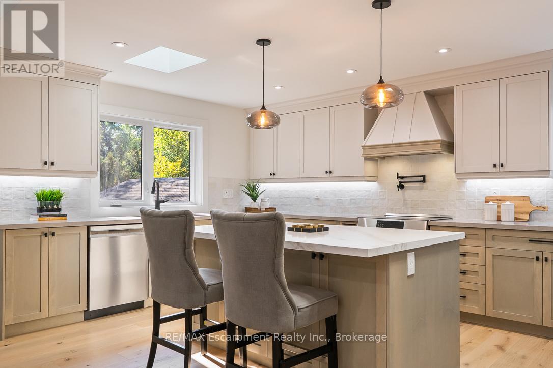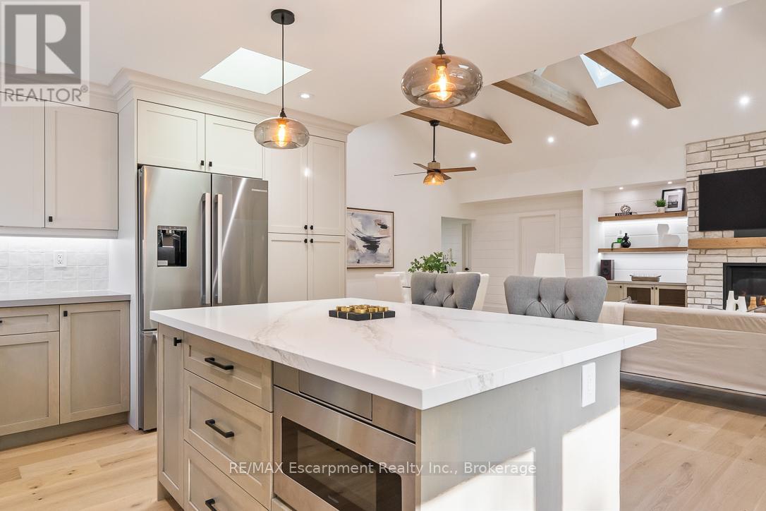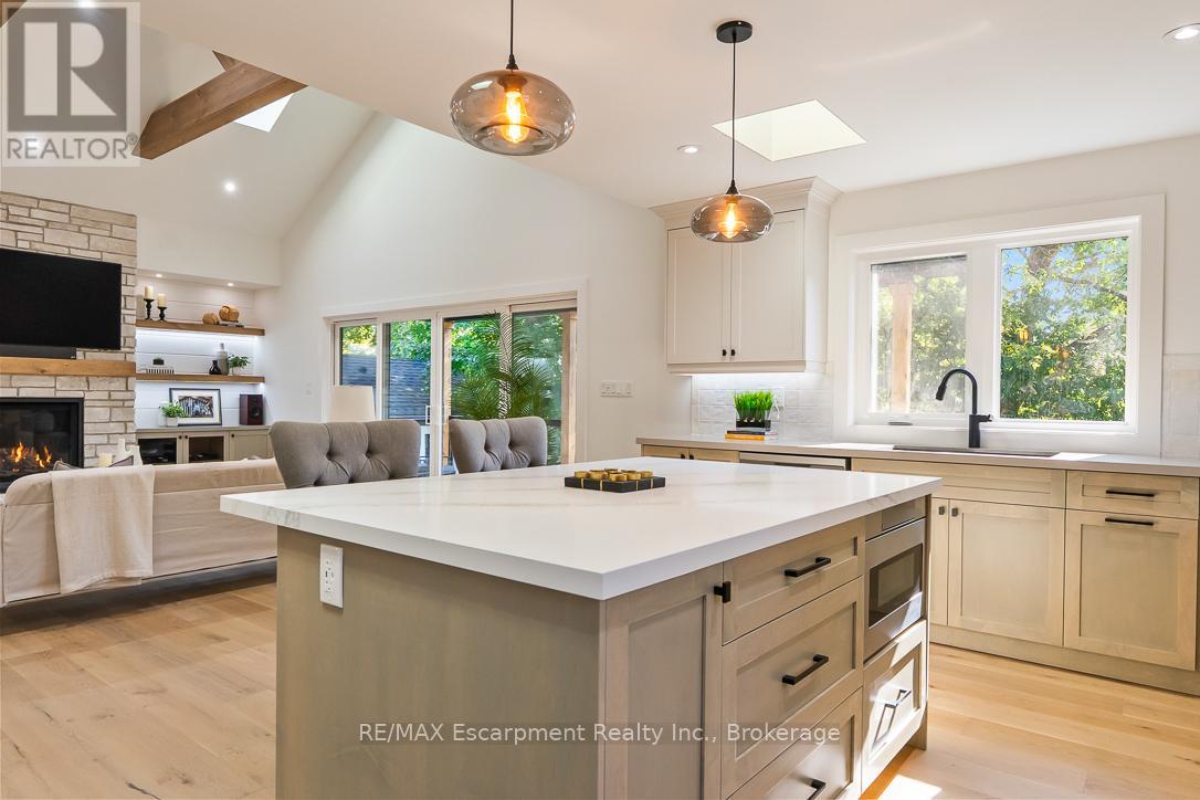 Stunning Brand-New Rebuild in Downtown Burlington. Originally built in 1952,Tucked away on a quiet cul-de-sac, this raised bungalow offers refined living at its best. Perfectly situated backing onto the picturesque Waterfront Trail, its just a short stroll to downtown Burlington, with its charming shops, restaurants, and the sparkling shores of Lake Ontario. Never been lived in, this home is ideal for downsizers or professionals seeking a luxurious, low-maintenance lifestyle where style and comfort abound. Step inside to discover a magnificent open-concept design, featuring engineered hardwood floors, pot lights, and integrated speakers throughout. The great room captivates with its cathedral, beam accented ceiling, skylights, and a stone-framed gas fireplace flanked by illuminated custom shelving and cabinetry. Sliding doors create a seamless transition to the covered porch, wired for sound and complete with glass railings overlooking a private backyard oasis. The professionally designed kitchen is a showpiece featuring Bosch appliances, sleek finishes, and a large island perfect for entertaining. Just off the great room, the main floor laundry is bright and functional, with ample cabinetry, heated floors, and direct access to the garage and backyard. The primary suite offers a serene retreat with a vaulted ceiling, numerous custom built-ins, and a spa-like ensuite boasting a soaker tub and heated floors. The lower level is equally impressive, with a spacious, light-filled family room featuring a walkout to the garden and custom built-ins for extra storage. Three generous bedrooms, each large enough for a king bed, share a beautiful 3-piece bath again with heated floors. Even the mechanical room has been finished with large-format tile for a polished touch. Outside, a detached garage comes EV charger ready, completing this exceptional offering. Every detail has been thoughtfully designed and flawlessly executed. This one-of-a-kind property is truly not to be missed (id:24334)