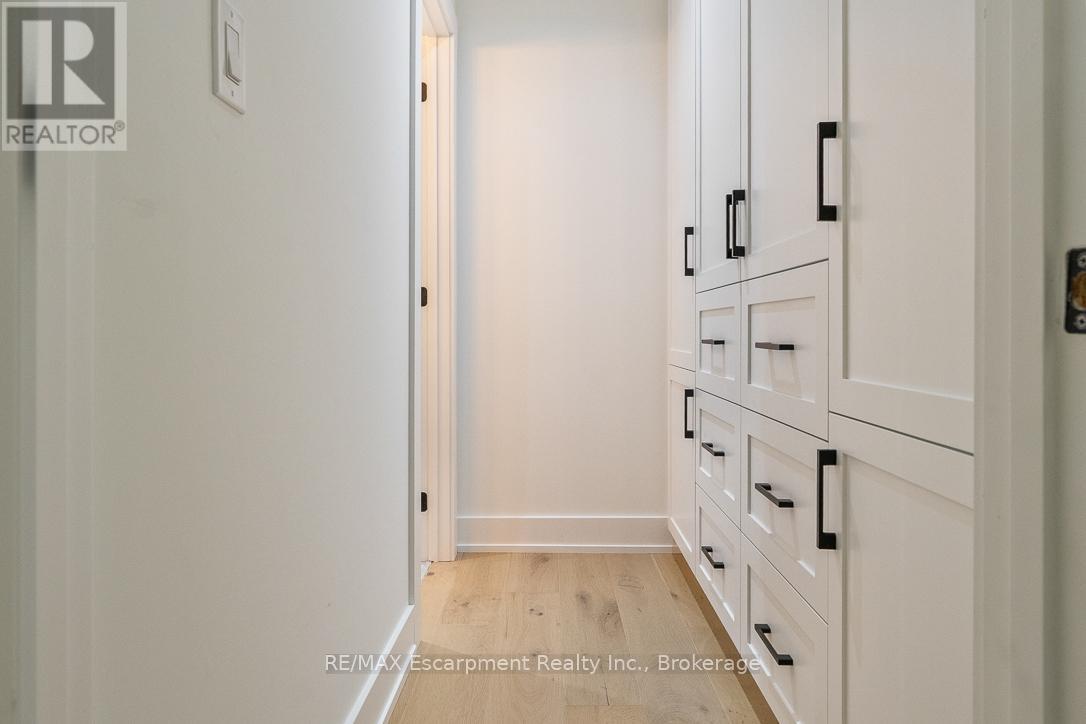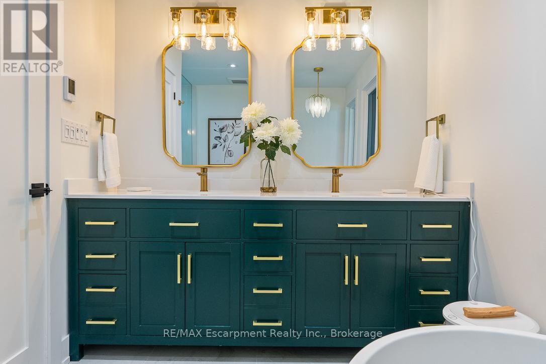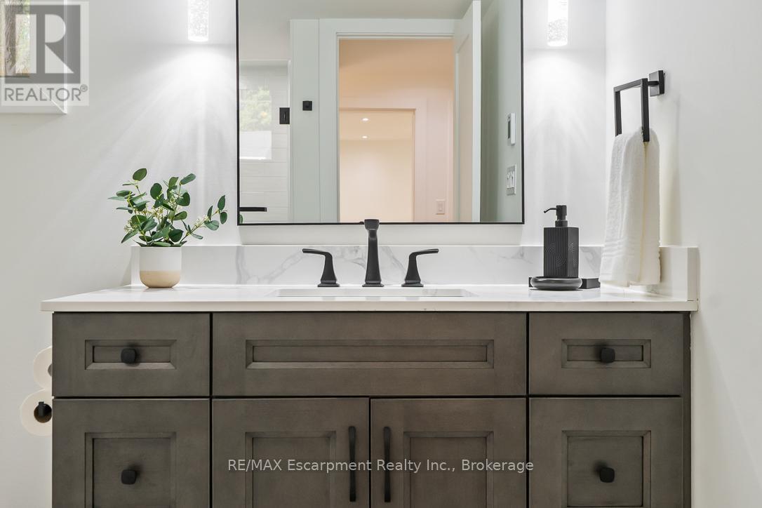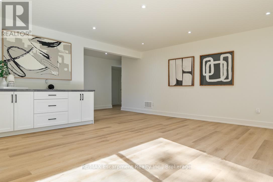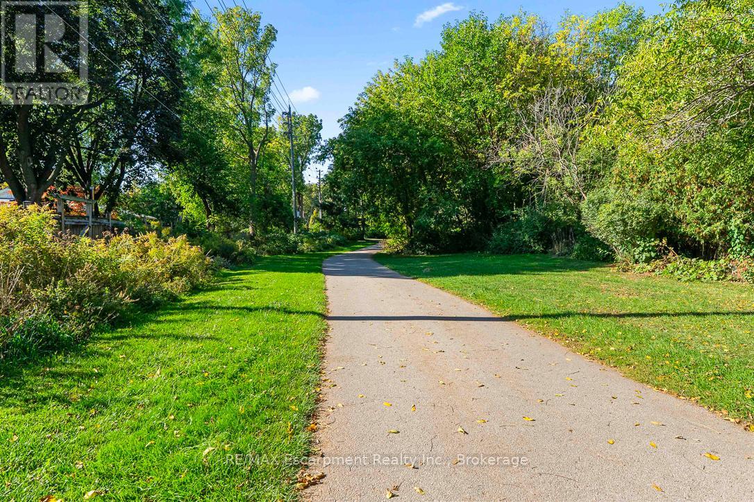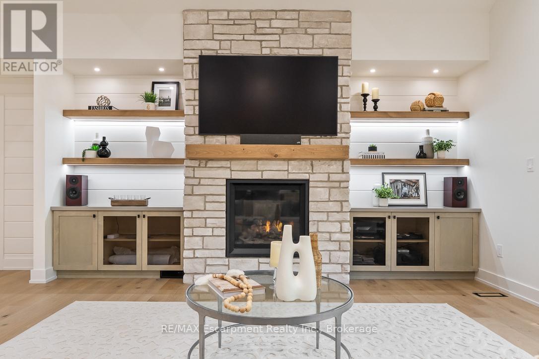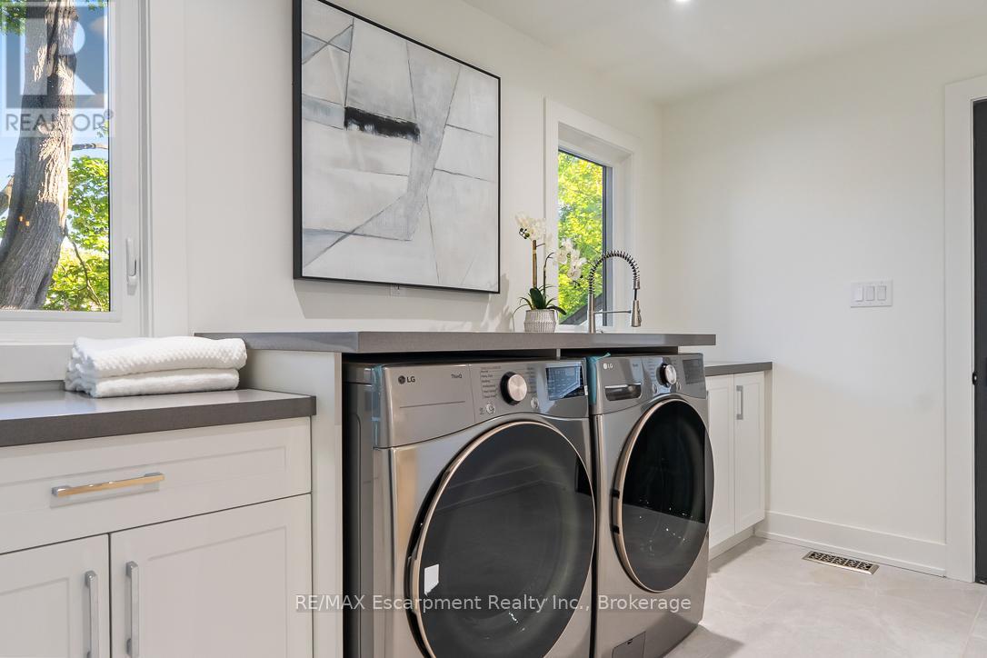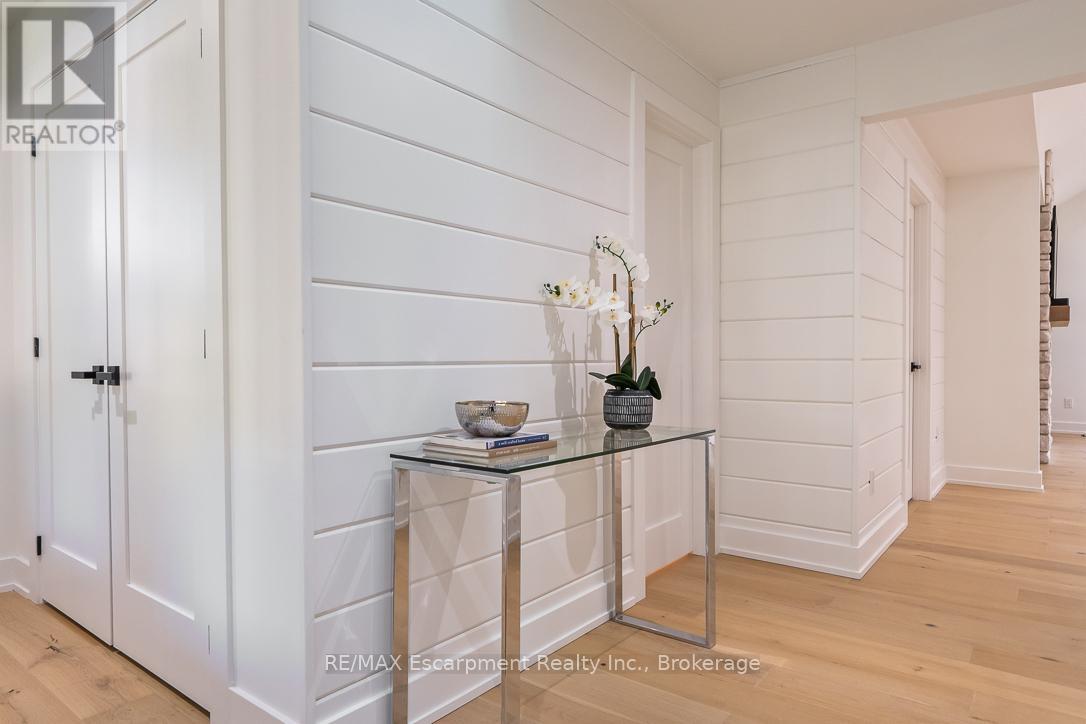 Stunning Brand-New Rebuild in Downtown Burlington. Originally built in 1952,Tucked away on a quiet cul-de-sac, this raised bungalow offers refined living at its best. Perfectly situated backing onto the picturesque Waterfront Trail, its just a short stroll to downtown Burlington, with its charming shops, restaurants, and the sparkling shores of Lake Ontario. Never been lived in, this home is ideal for downsizers or professionals seeking a luxurious, low-maintenance lifestyle where style and comfort abound. Step inside to discover a magnificent open-concept design, featuring engineered hardwood floors, pot lights, and integrated speakers throughout. The great room captivates with its cathedral, beam accented ceiling, skylights, and a stone-framed gas fireplace flanked by illuminated custom shelving and cabinetry. Sliding doors create a seamless transition to the covered porch, wired for sound and complete with glass railings overlooking a private backyard oasis. The professionally designed kitchen is a showpiece featuring Bosch appliances, sleek finishes, and a large island perfect for entertaining. Just off the great room, the main floor laundry is bright and functional, with ample cabinetry, heated floors, and direct access to the garage and backyard. The primary suite offers a serene retreat with a vaulted ceiling, numerous custom built-ins, and a spa-like ensuite boasting a soaker tub and heated floors. The lower level is equally impressive, with a spacious, light-filled family room featuring a walkout to the garden and custom built-ins for extra storage. Three generous bedrooms, each large enough for a king bed, share a beautiful 3-piece bath again with heated floors. Even the mechanical room has been finished with large-format tile for a polished touch. Outside, a detached garage comes EV charger ready, completing this exceptional offering. Every detail has been thoughtfully designed and flawlessly executed. This one-of-a-kind property is truly not to be missed (id:24334)