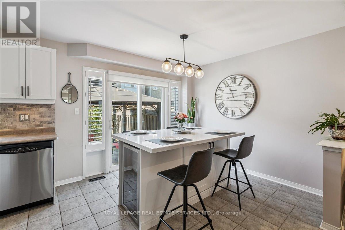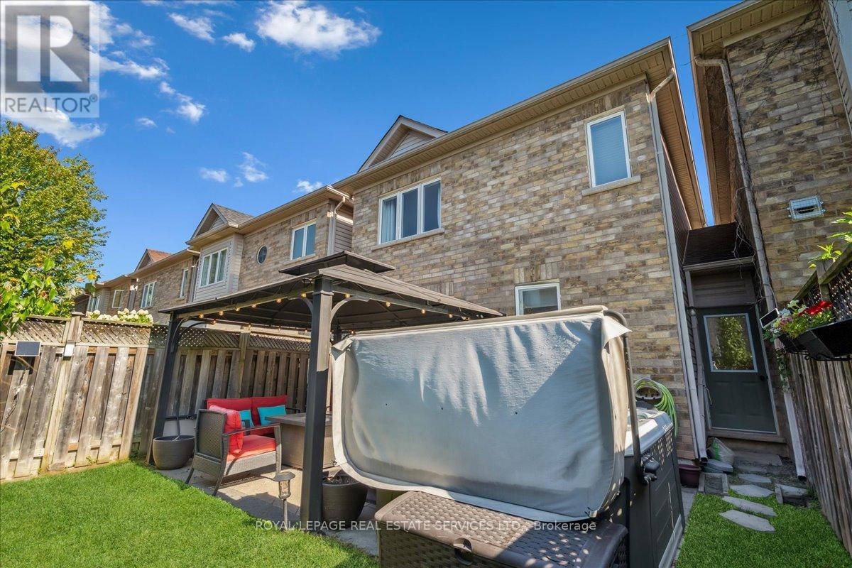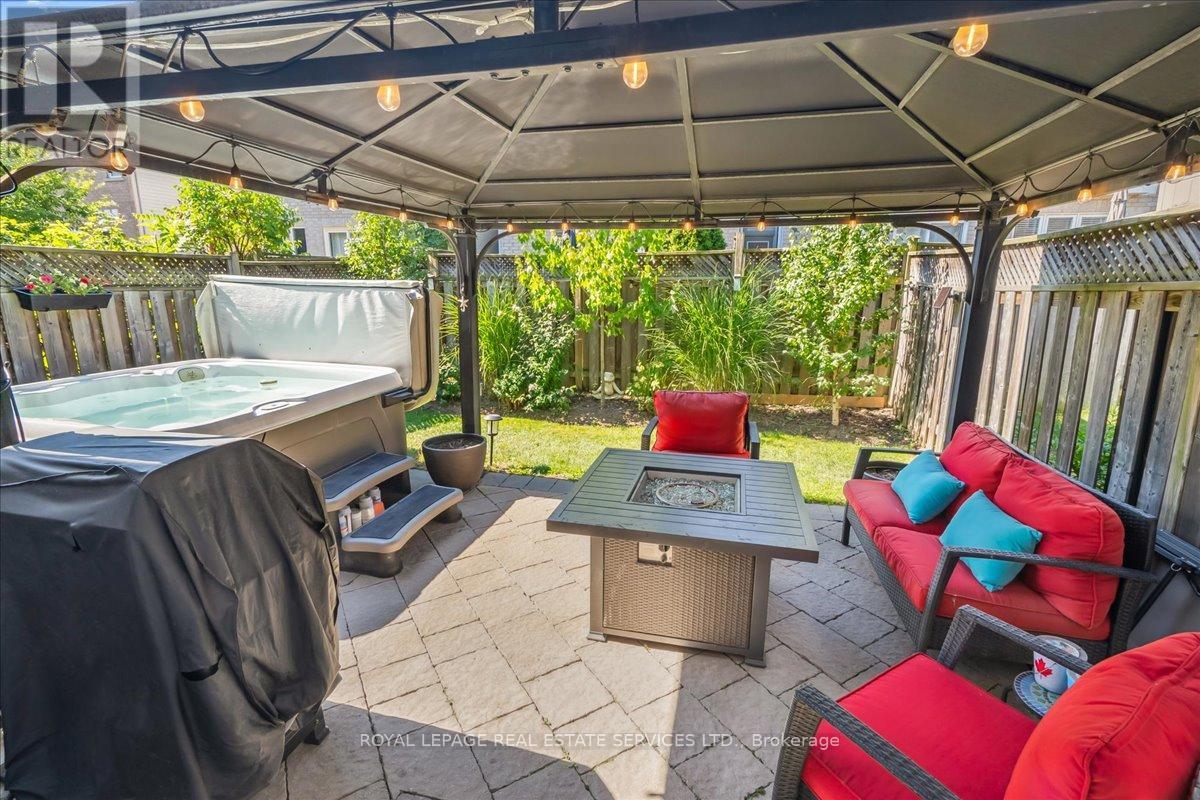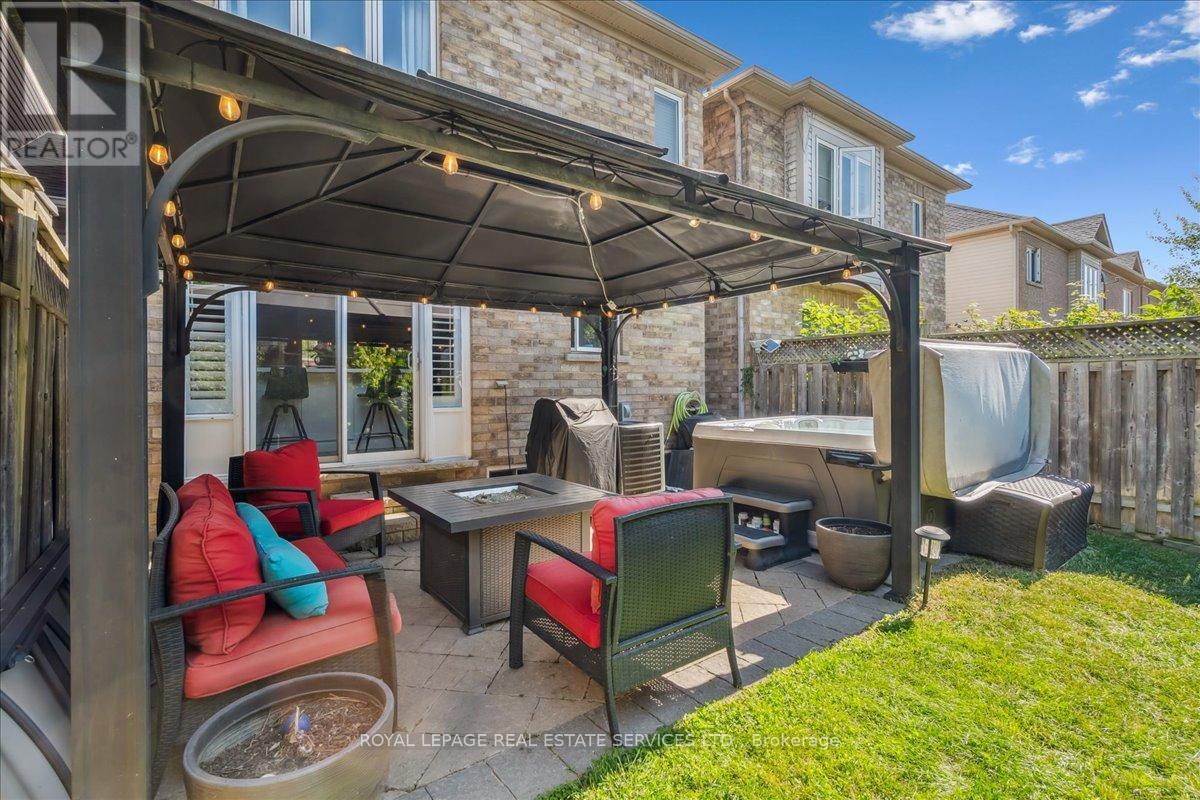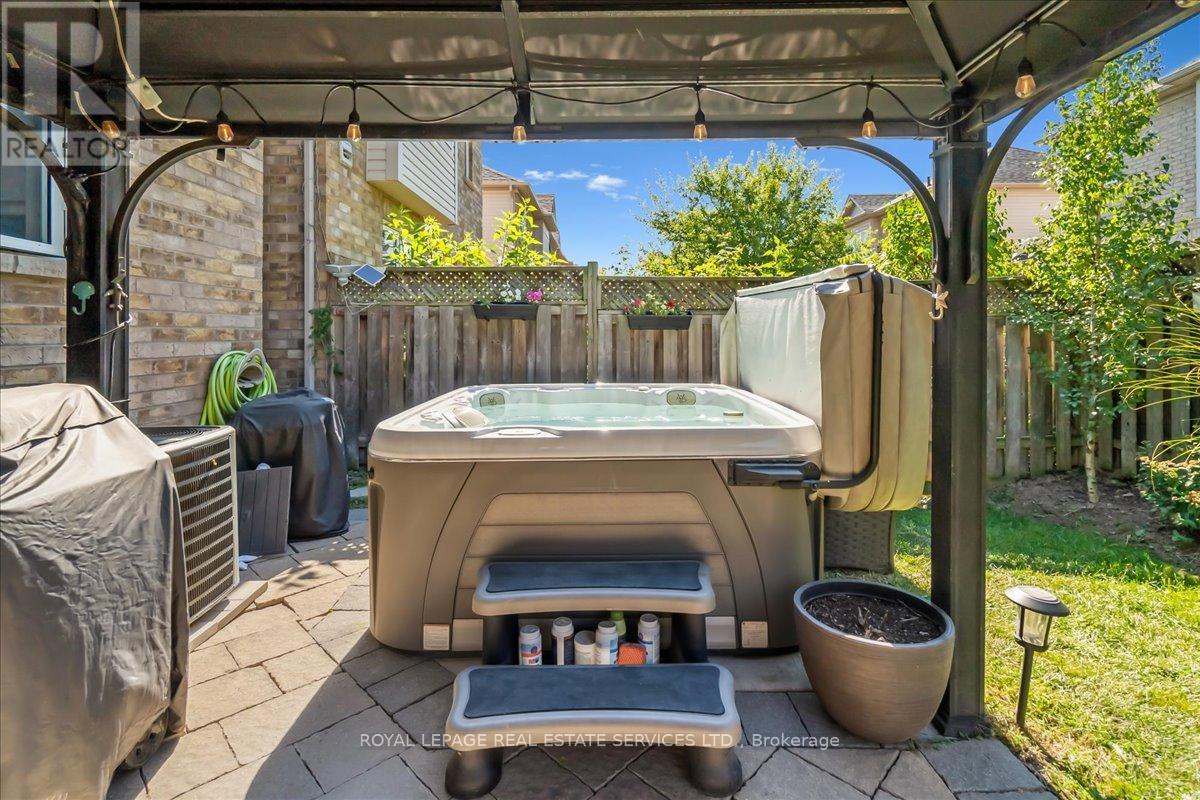 Linked-Detached Living in Burlingtons Orchard! This 3-bed, 3-bath home offers 1,871sqft of beautifully finished living space and feels fully detached - attached only at the garage - delivering style, function, and value on a small, quiet street with minimal traffic. The main floor features engineered hardwood, California shutters (2022), and an updated kitchen with stainless steel appliances, refinished cabinets (2023), and a sleek island (2022) with added storage & workspace. Upstairs, the primary suite offers a walk-in closet and ensuite, with two more spacious bedrooms and a full bath designed for family living. A finished basement adds flexible space for a rec room, office, or gym. The backyard oasis boasts a gazebo and hot tub (2022, warranty until 2027). Major updates include: new A/C (2023, warranty until 2033), owned furnace & hot water tank. Close to parks, trails, schools, Appleby GO & highways...in an Orchard full of apples, this one's a peach! ** This is a linked property.** (id:24334)