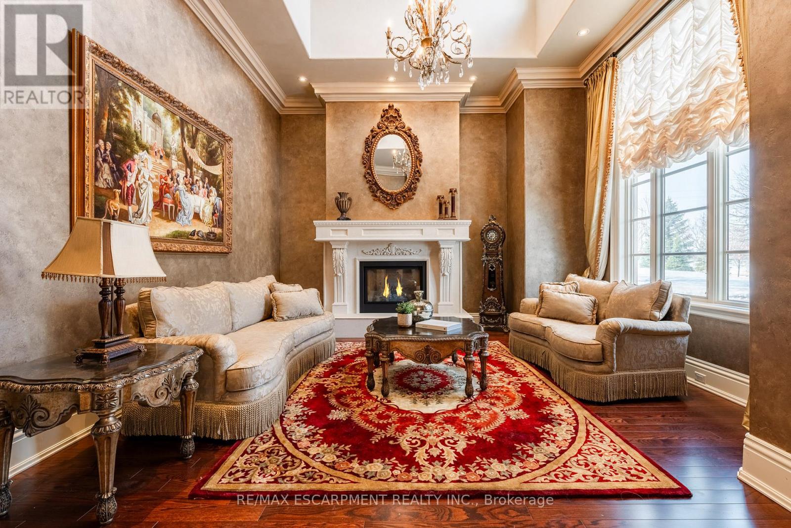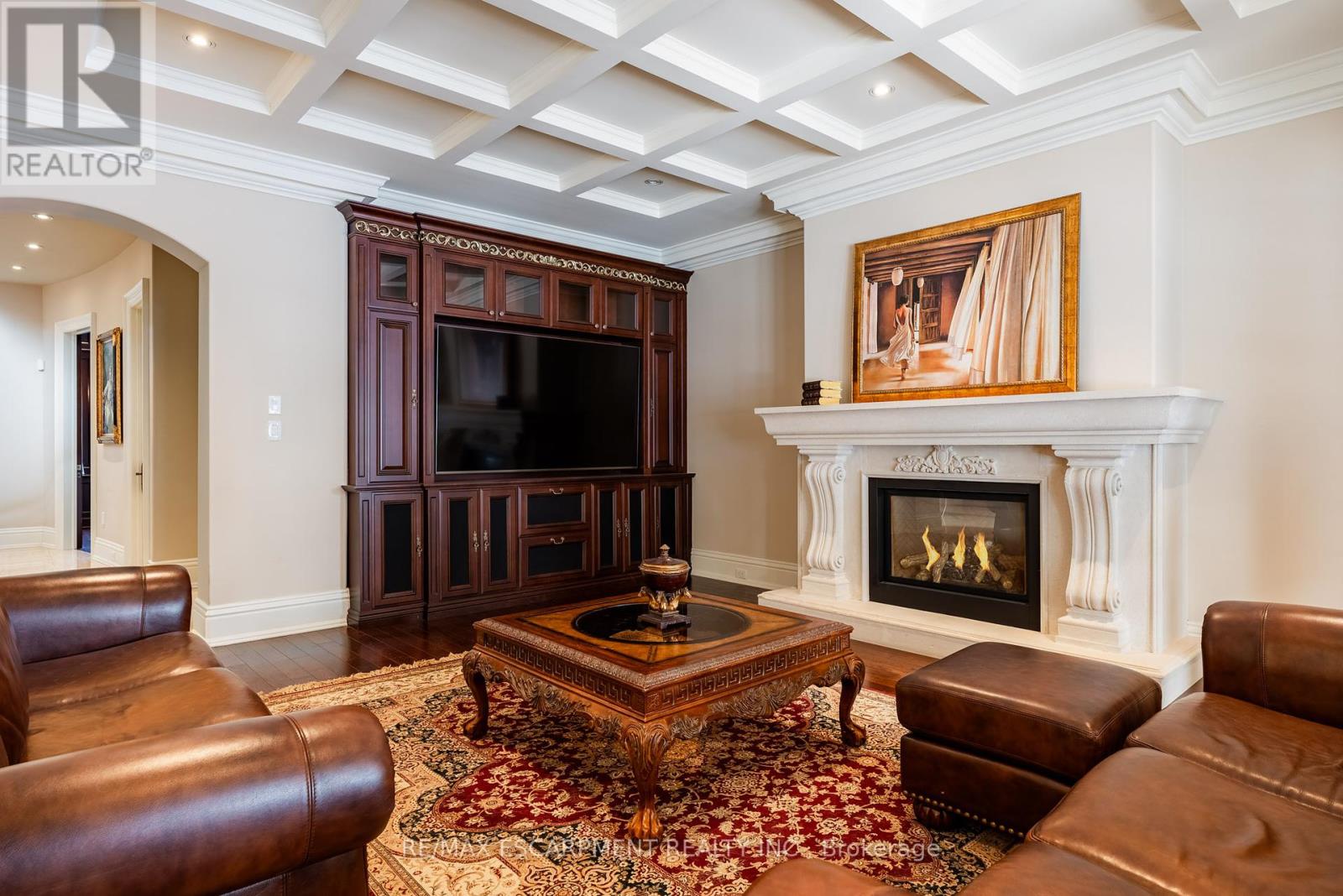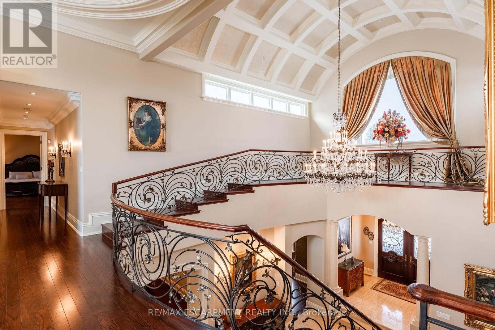 Impeccably nestled in The Bluffs, this extraordinary estate spans over 11,000 sqft. of luxurious living space on approx two acres of treed property. Blending modern sophistication with traditional elegance, this home offers an unparalleled lifestyle in a breathtaking setting. From the moment you step into the grand foyer, the impeccable craftsmanship and seamless flow set the tone for refined living. Architectural excellence is showcased through soaring coffered ceilings, expansive windows, & an intricate wrought-iron staircase. The chefs kitchen is a culinary masterpiece, boasting a walk-in pantry, top-tier custom cabinetry, & premium appliances. A spacious breakfast room opens to the beautifully landscaped backyard, where a heated covered lanai provides the perfect setting for outdoor relaxation. The main-floor primary suite is a private retreat, featuring a cozy F/P, his and her walk-in closets, & a lavish 6pc spa-inspired ensuite. Adding to its allure, an adjoining sunroom offers direct access to the backyard, creating a seamless indoor-outdoor experience. A richly appointed home office, complete with wood paneling & built-in cabinetry, provides an ideal workspace. The second level hosts 3 additional bedrooms, while the lower level is designed for ultimate comfort, entertainment, & hosting unforgettable events. Here, youll find a full bar, oversized wine cellar, & a dance floor, along with a state-of-the-art home theatre, a gym, a gentlemans cigar room, & a spa-inspired bath with a stone steam sauna, walk-in shower, & radiant floor heating. A 5th bedroom completes this level, offering flexibility for guests or extended family. For car enthusiasts, the impressive heated 3-car garage is outfitted with 2 lifts, allowing for up to 6 vehicles to be stored with ease. Built-in speakers throughout the home further enhance the ambiance, providing a seamless audio experience indoors & out. Minutes from major highways & Burlingtons finest amenities. LUXURY CERTIFIED (id:24334)