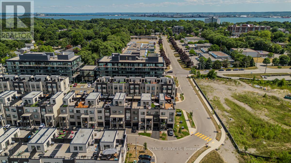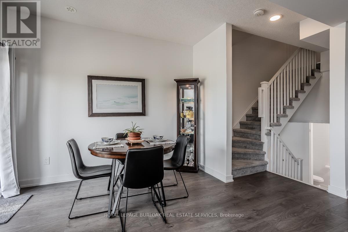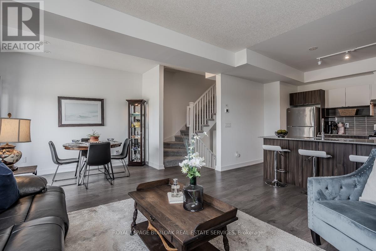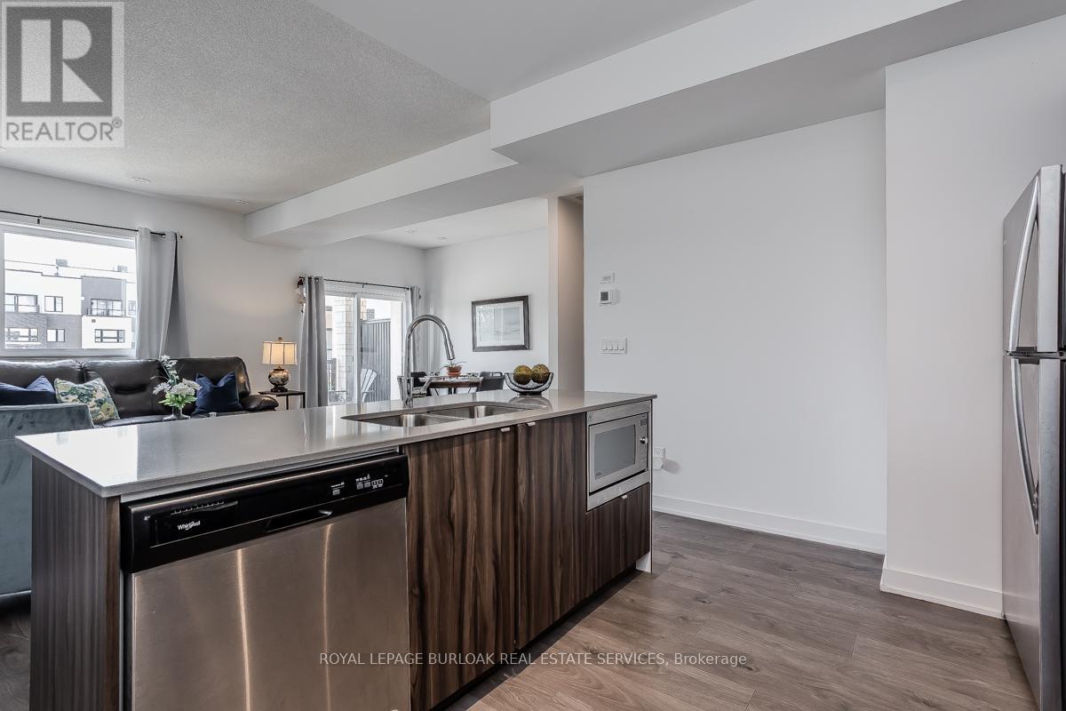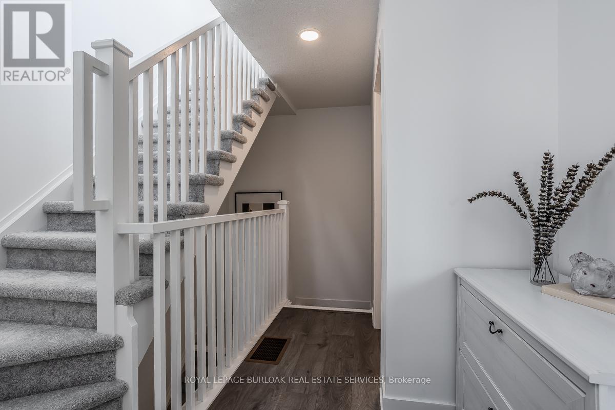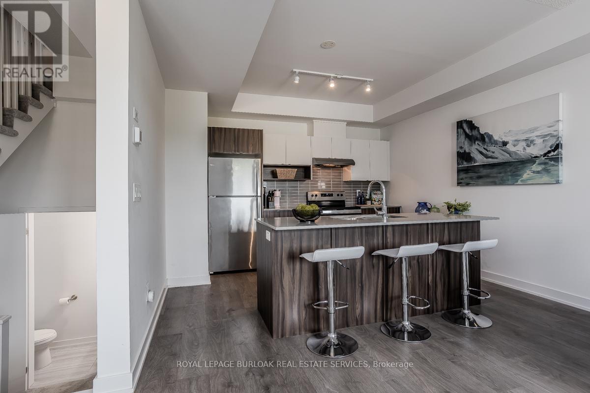 Welcome to this beautifully designed modern 3-storey townhome, perfectly located just minutes from the lake, downtown Burlington, parks, schools, and convenient transit options including the GO Station. Nestled in a quiet, family-friendly enclave, this pet-friendly home offers the ideal balance of comfort, style, and functionality perfect for growing families, young professionals, or anyone looking to enjoy the best of Burlington living. One of the rare highlights of this unit is the 2-car private driveway a unique feature that only two homes in the entire complex enjoy, providing unmatched parking convenience for your family and guests. Step into a bright and welcoming front entry with a convenient 2-piece powder room, perfect for guests. The second level showcases a seamless open-concept layout, ideal for both everyday living and entertaining. Wide plank laminate flooring flows throughout the spacious living and dining areas, where large windows and a walkout to your private balcony flood the space with natural light. At the heart of the home, the contemporary kitchen is sure to impress featuring quartz countertops, stainless steel appliances, custom cabinetry, a stylish stacked tile backsplash, and a large island with breakfast bar, built-in microwave, and dishwasher. Upstairs, you'll find a bright and airy primary retreat complete with a 3-piece ensuite boasting an oversized quartz vanity, porcelain tile floors, and a sleek stacked-tile walk-in shower with a glass door. An additional well-sized bedroom and a 4-piece main bath with matching finishes and a tub/shower combo offer the perfect layout for a growing family, guests, or a home office. Top it all off with a private rooftop terrace offering pond views and a glass railing an ideal space to relax, dine, or entertain under the open sky. Whether you're looking for your first home or a stylish, low-maintenance space for your family, this thoughtfully designed townhome checks all the boxes. (id:24334)