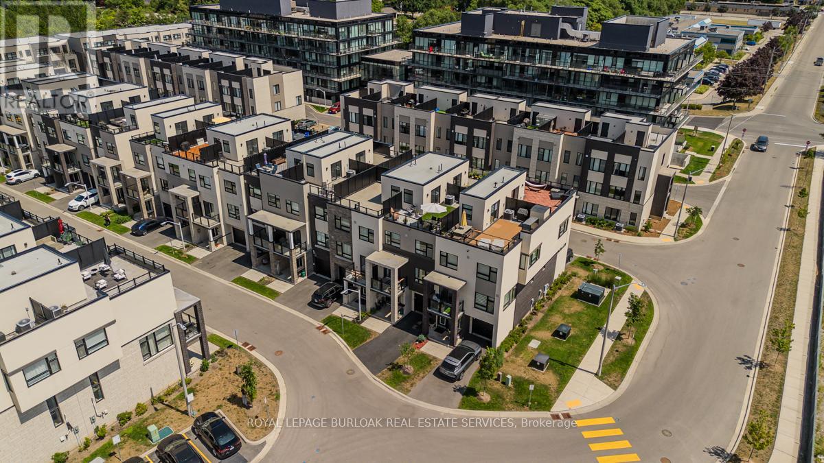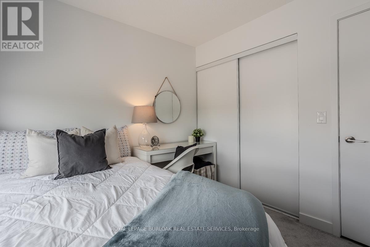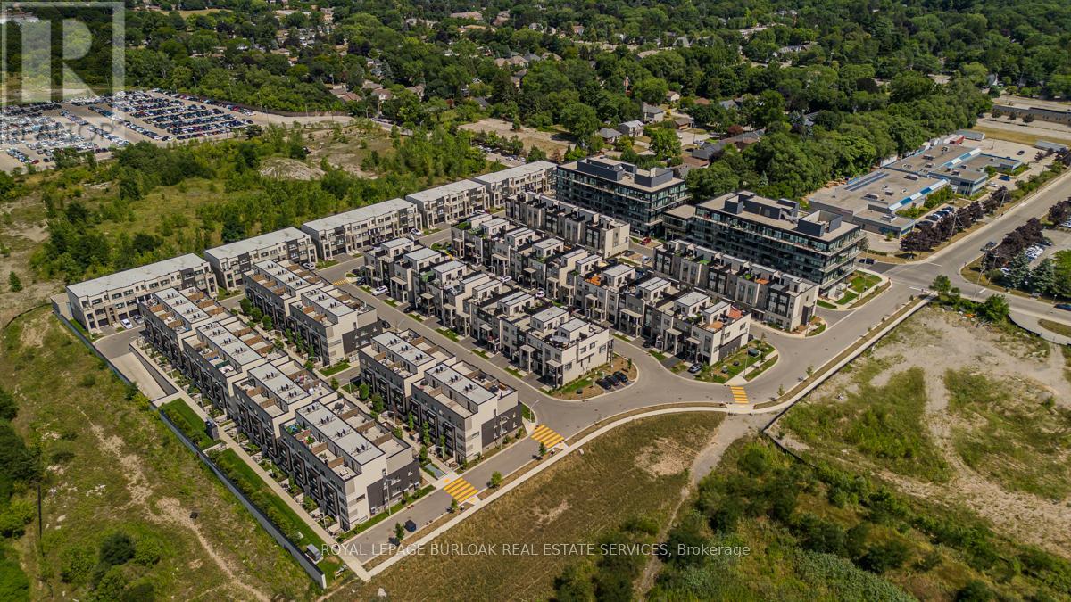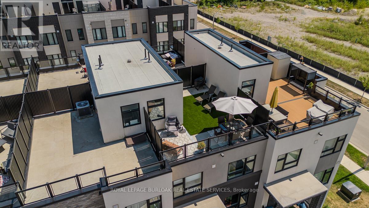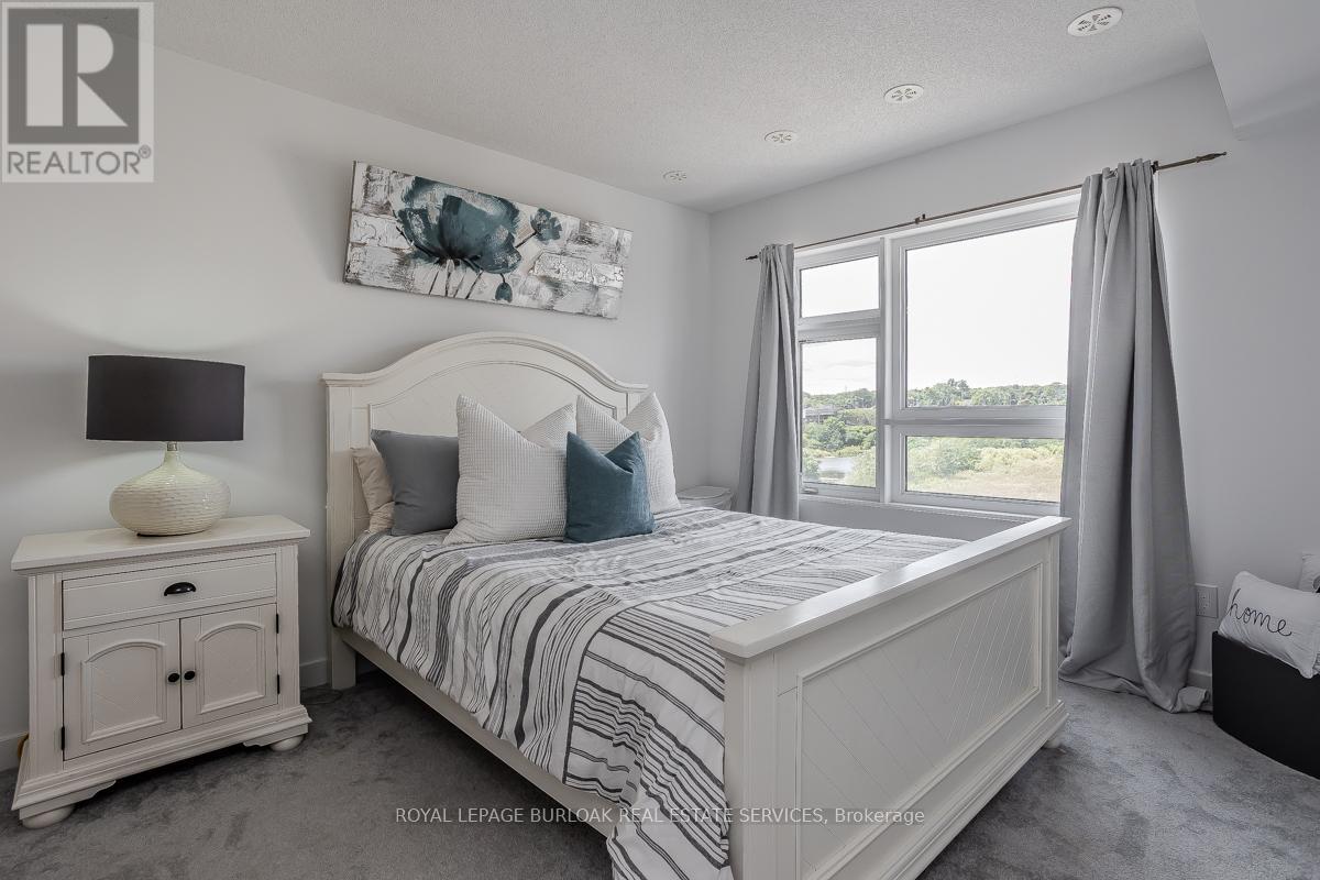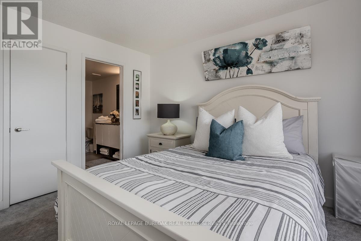 Welcome to this beautifully designed modern 3-storey townhome, perfectly located just minutes from the lake, downtown Burlington, parks, schools, and convenient transit options including the GO Station. Nestled in a quiet, family-friendly enclave, this pet-friendly home offers the ideal balance of comfort, style, and functionality perfect for growing families, young professionals, or anyone looking to enjoy the best of Burlington living. One of the rare highlights of this unit is the 2-car private driveway a unique feature that only two homes in the entire complex enjoy, providing unmatched parking convenience for your family and guests. Step into a bright and welcoming front entry with a convenient 2-piece powder room, perfect for guests. The second level showcases a seamless open-concept layout, ideal for both everyday living and entertaining. Wide plank laminate flooring flows throughout the spacious living and dining areas, where large windows and a walkout to your private balcony flood the space with natural light. At the heart of the home, the contemporary kitchen is sure to impress featuring quartz countertops, stainless steel appliances, custom cabinetry, a stylish stacked tile backsplash, and a large island with breakfast bar, built-in microwave, and dishwasher. Upstairs, you'll find a bright and airy primary retreat complete with a 3-piece ensuite boasting an oversized quartz vanity, porcelain tile floors, and a sleek stacked-tile walk-in shower with a glass door. An additional well-sized bedroom and a 4-piece main bath with matching finishes and a tub/shower combo offer the perfect layout for a growing family, guests, or a home office. Top it all off with a private rooftop terrace offering pond views and a glass railing an ideal space to relax, dine, or entertain under the open sky. Whether you're looking for your first home or a stylish, low-maintenance space for your family, this thoughtfully designed townhome checks all the boxes. (id:24334)