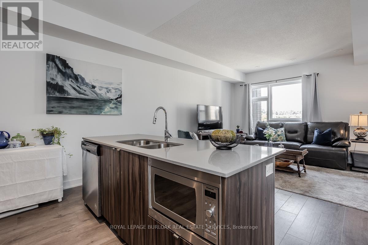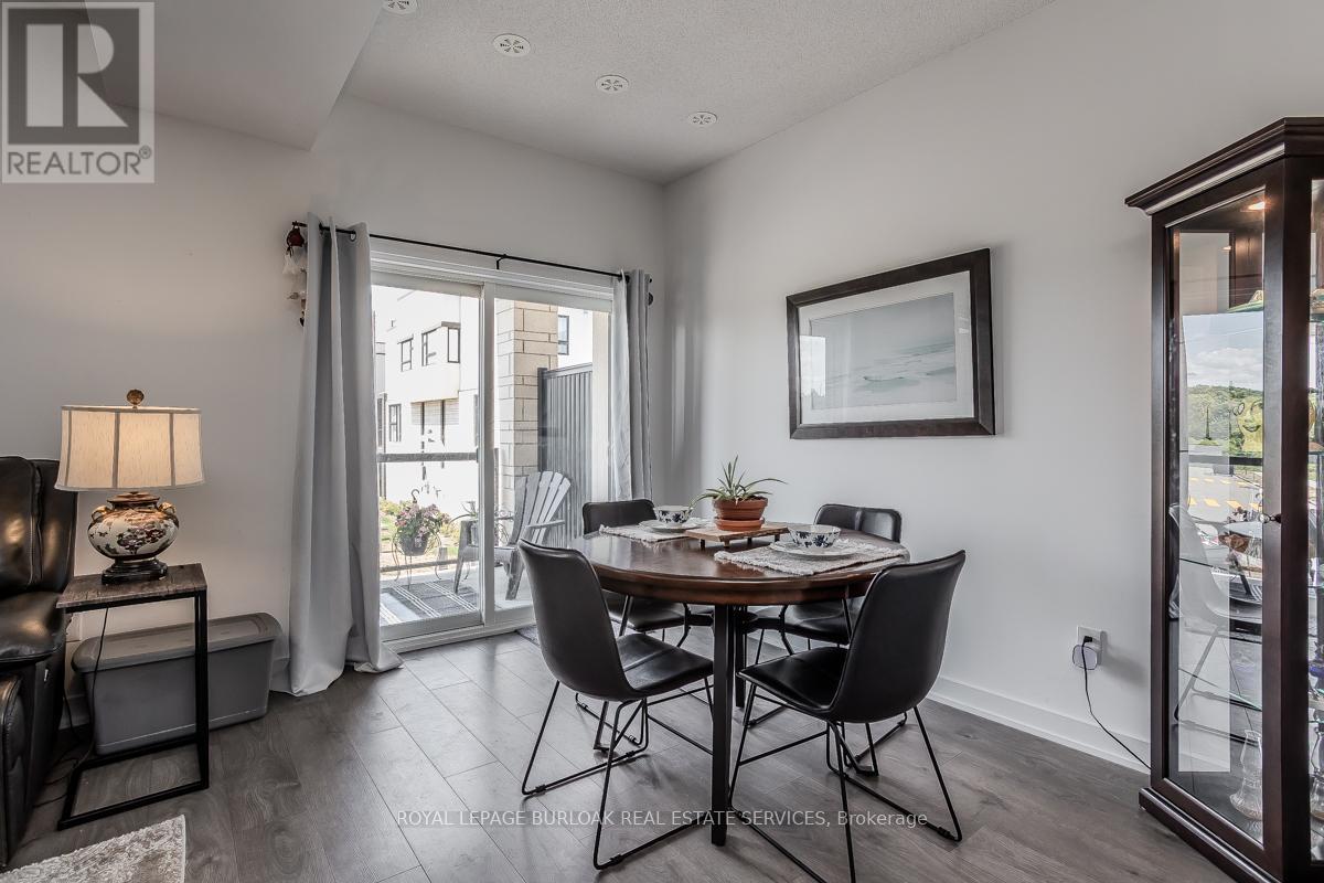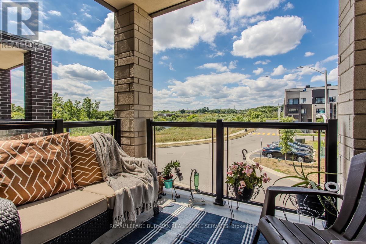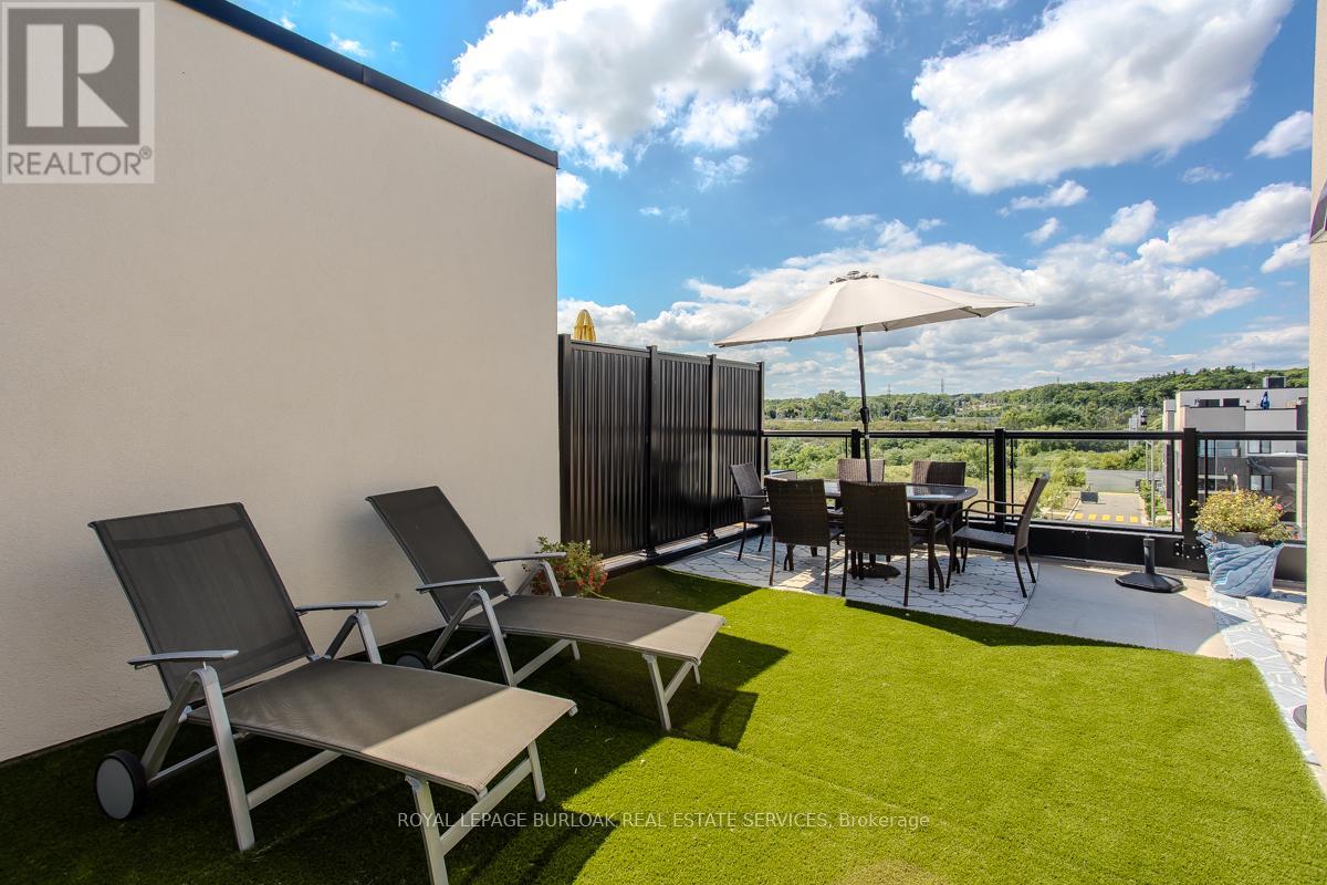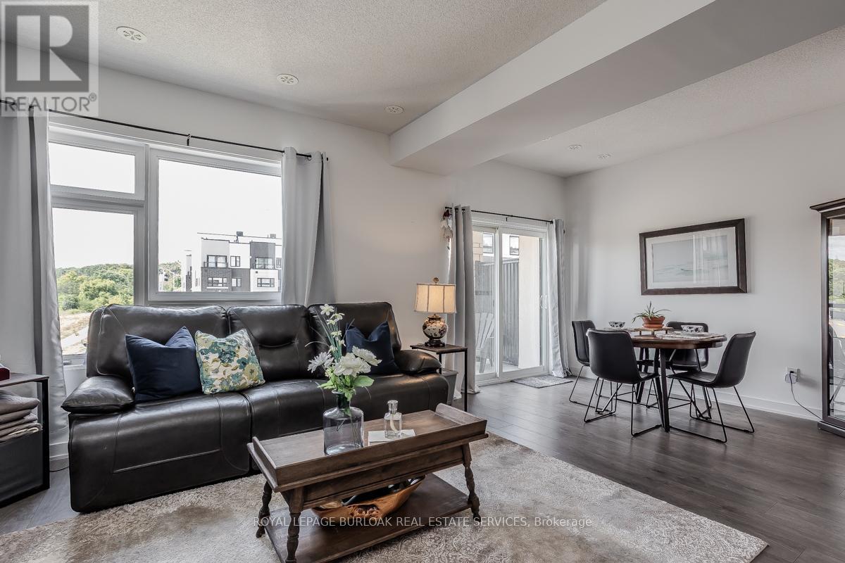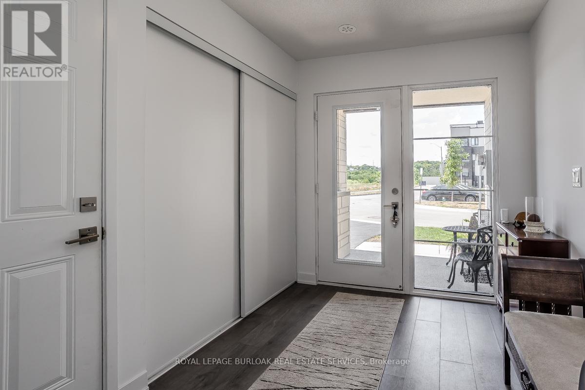 Welcome to this beautifully designed modern 3-storey townhome, perfectly located just minutes from the lake, downtown Burlington, parks, schools, and convenient transit options including the GO Station. Nestled in a quiet, family-friendly enclave, this pet-friendly home offers the ideal balance of comfort, style, and functionality perfect for growing families, young professionals, or anyone looking to enjoy the best of Burlington living. One of the rare highlights of this unit is the 2-car private driveway a unique feature that only two homes in the entire complex enjoy, providing unmatched parking convenience for your family and guests. Step into a bright and welcoming front entry with a convenient 2-piece powder room, perfect for guests. The second level showcases a seamless open-concept layout, ideal for both everyday living and entertaining. Wide plank laminate flooring flows throughout the spacious living and dining areas, where large windows and a walkout to your private balcony flood the space with natural light. At the heart of the home, the contemporary kitchen is sure to impress featuring quartz countertops, stainless steel appliances, custom cabinetry, a stylish stacked tile backsplash, and a large island with breakfast bar, built-in microwave, and dishwasher. Upstairs, you'll find a bright and airy primary retreat complete with a 3-piece ensuite boasting an oversized quartz vanity, porcelain tile floors, and a sleek stacked-tile walk-in shower with a glass door. An additional well-sized bedroom and a 4-piece main bath with matching finishes and a tub/shower combo offer the perfect layout for a growing family, guests, or a home office. Top it all off with a private rooftop terrace offering pond views and a glass railing an ideal space to relax, dine, or entertain under the open sky. Whether you're looking for your first home or a stylish, low-maintenance space for your family, this thoughtfully designed townhome checks all the boxes. (id:24334)