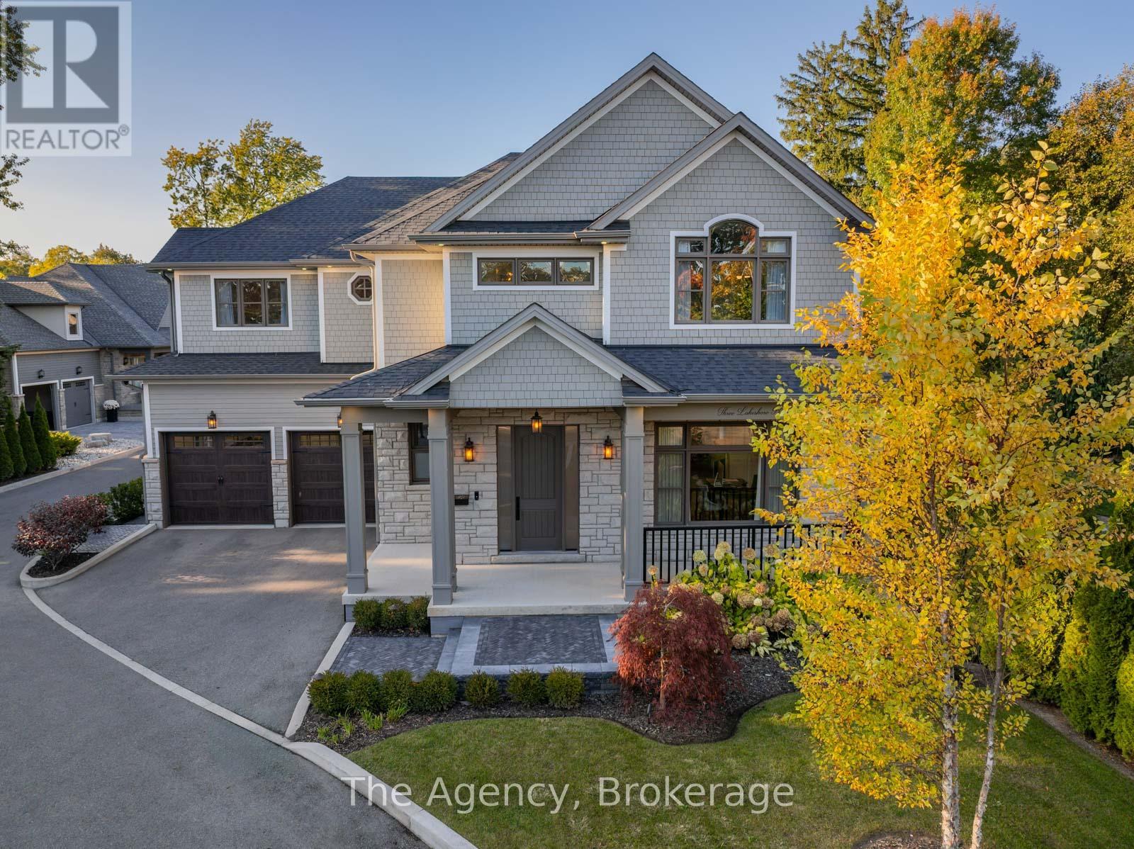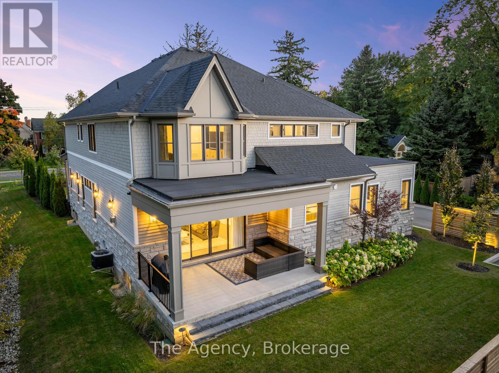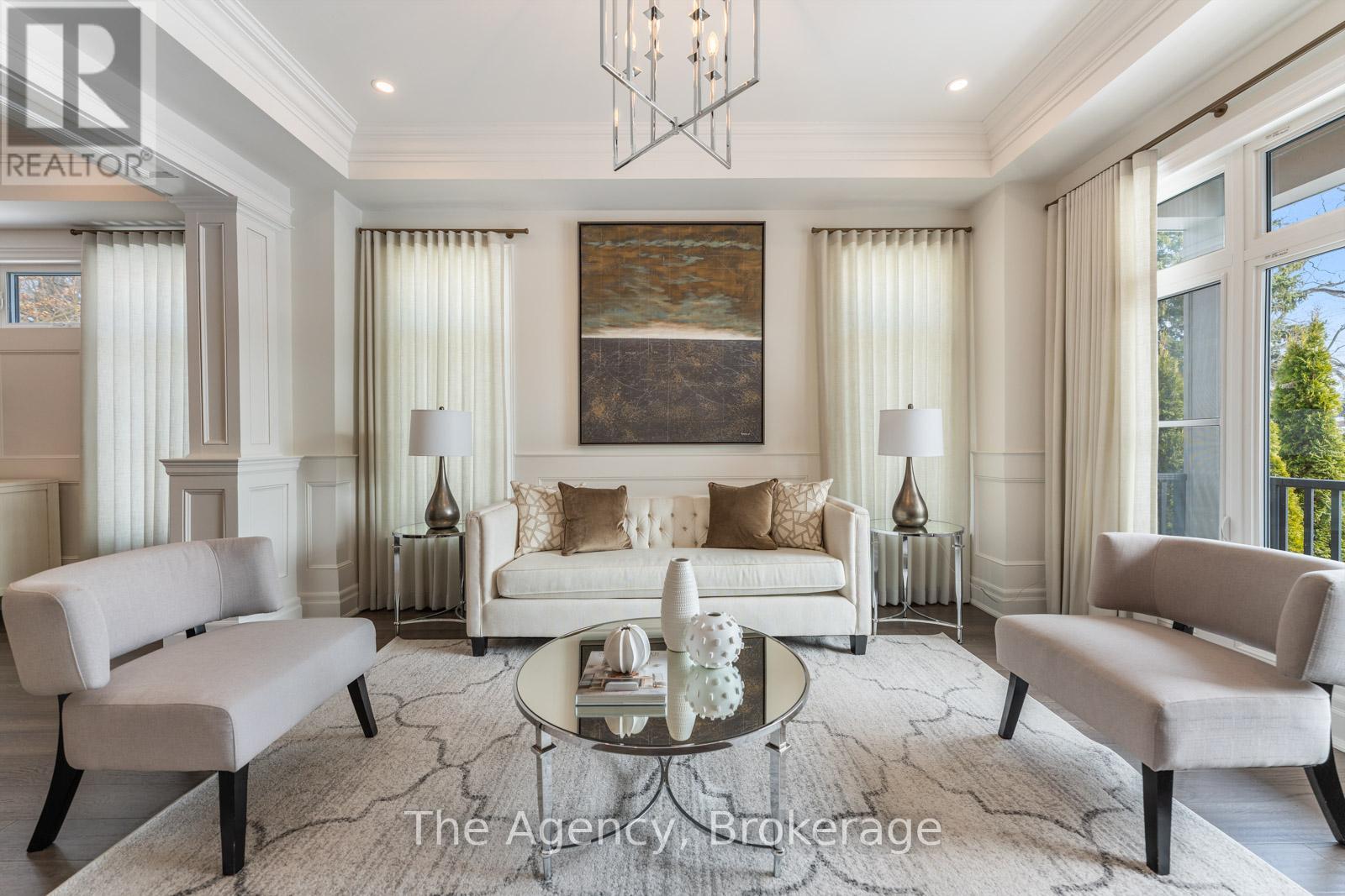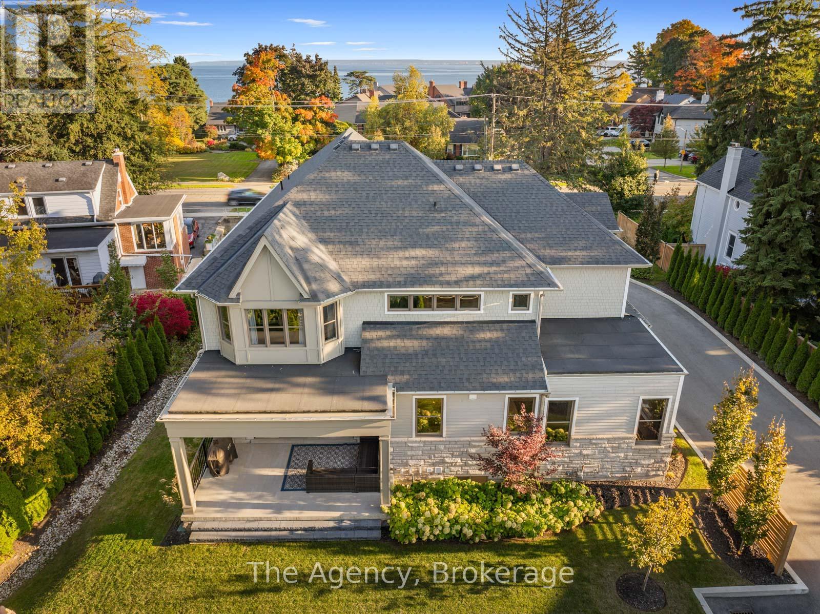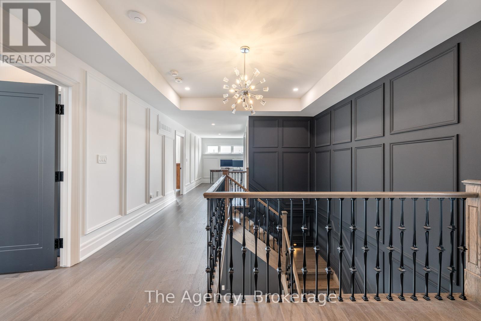 Your dream home awaits in an exclusive enclave just steps from Lake Ontario and minutes from downtown Burlington's shops, cafes, and restaurants. With 4+1 bedrooms and 6+2 bathrooms and a fully finished lower-level ideal for entertaining or extended family living this upgraded, custom home truly has it all. On the main level, hardwood floors, 10ft ceilings, wainscoting, coffered ceilings, and an oak staircase with wrought iron accents set a refined tone. The home features formal living and dining rooms, as well as a main floor family room with custom built-ins, a gas fireplace and patio doors leading to the exterior. A convenient mud room with access to the double car garage adds to the practicality of the space. The customized kitchen boasts a large center island, quartz countertops, a gas range, stainless steel appliances, and a cozy breakfast area. Upstairs, the primary suite includes a dressing room, ensuite, and laundry, while three additional bedrooms each enjoy their own ensuite bath. The fully finished lower level offers a spacious living area with a fireplace, projector screen, built in speakers, glass enclosed gym, guest bedroom, and heated bathroom floors. Set on a low-maintenance lot, this home offers both convenience and luxury, with a landscaped front yard featuring a sprinkler system and security cameras, plus a covered rear patio designed for relaxing outdoor living. (id:24334)