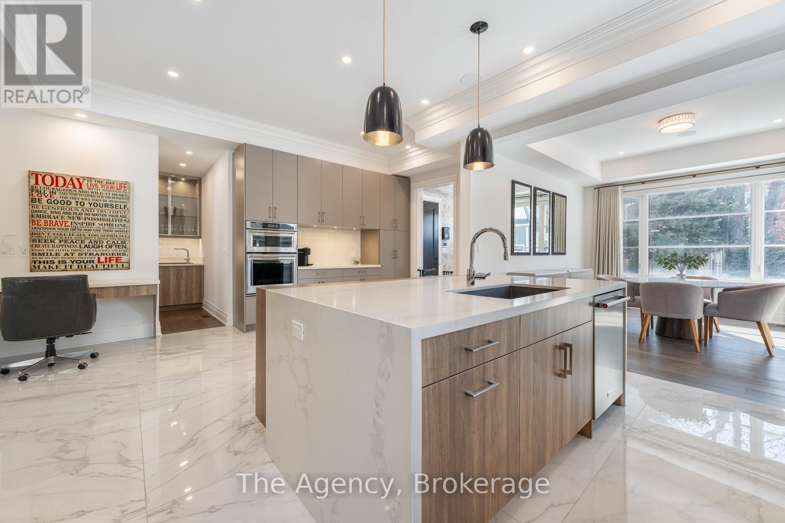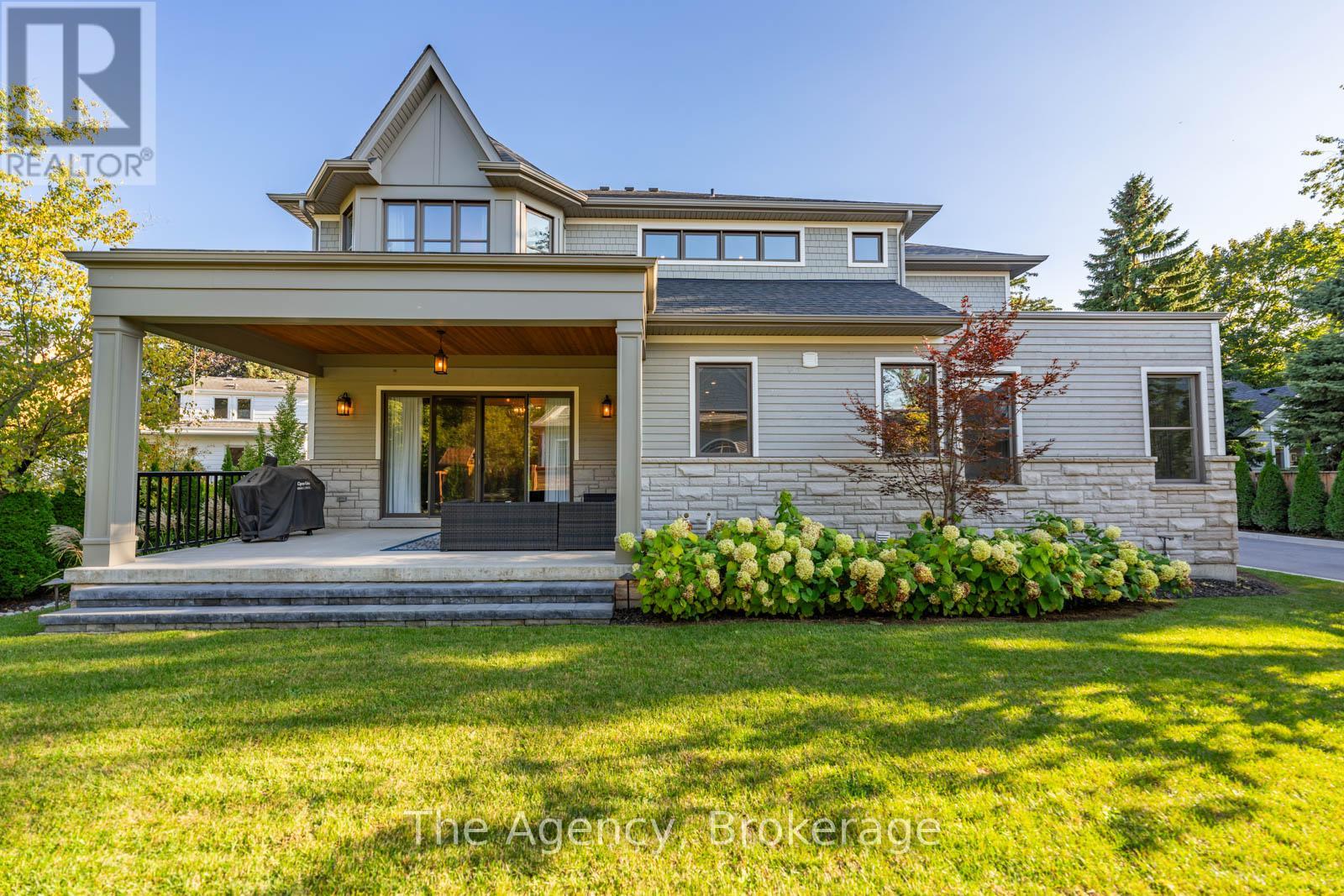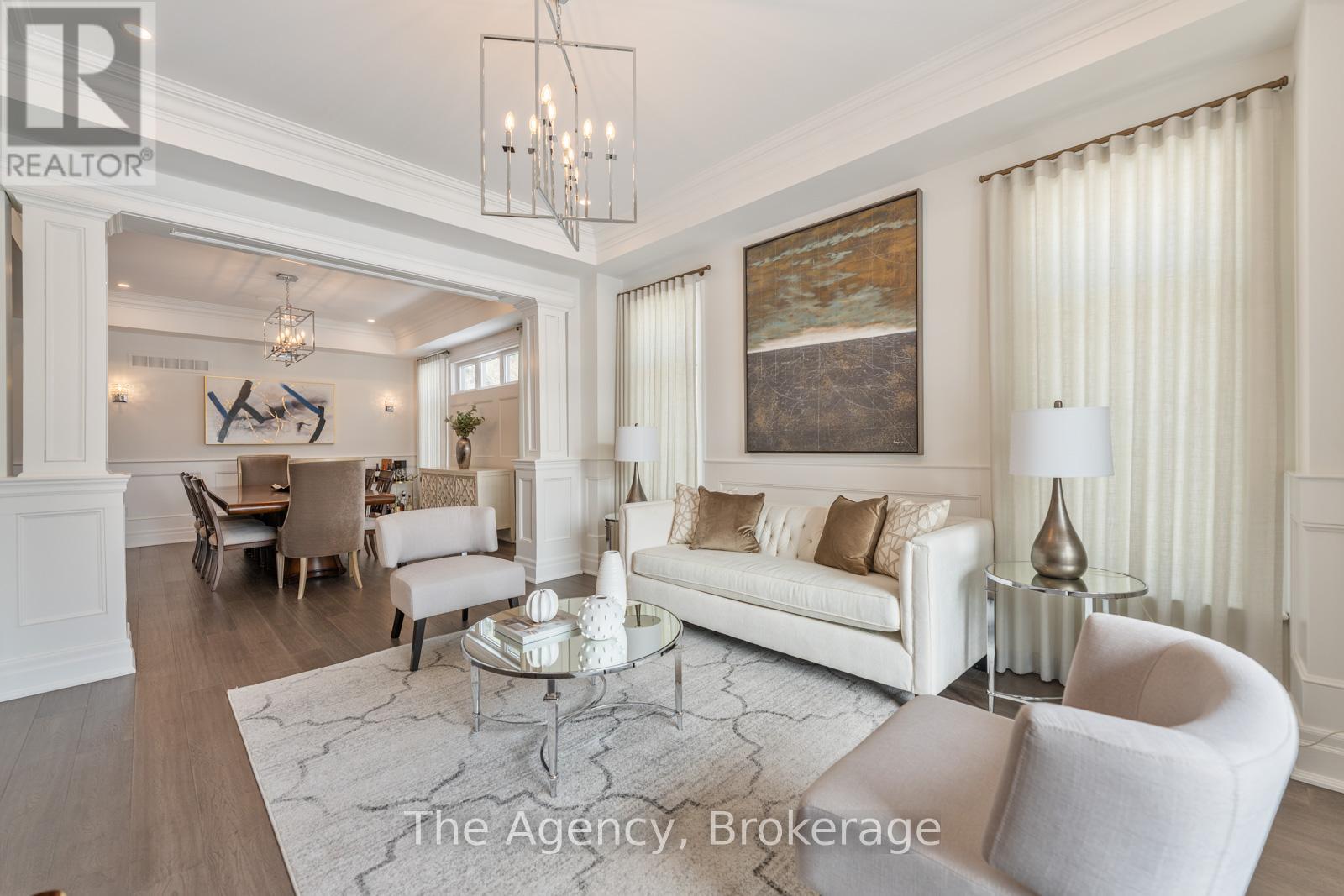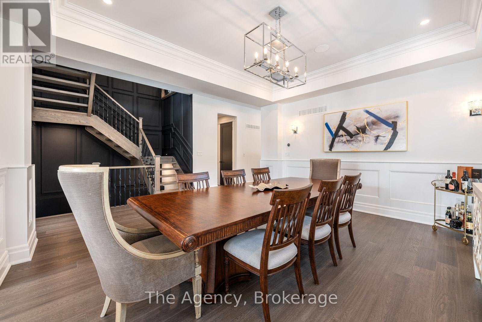 Your dream home awaits in an exclusive enclave just steps from Lake Ontario and minutes from downtown Burlington's shops, cafes, and restaurants. With 4+1 bedrooms and 6+2 bathrooms and a fully finished lower-level ideal for entertaining or extended family living this upgraded, custom home truly has it all. On the main level, hardwood floors, 10ft ceilings, wainscoting, coffered ceilings, and an oak staircase with wrought iron accents set a refined tone. The home features formal living and dining rooms, as well as a main floor family room with custom built-ins, a gas fireplace and patio doors leading to the exterior. A convenient mud room with access to the double car garage adds to the practicality of the space. The customized kitchen boasts a large center island, quartz countertops, a gas range, stainless steel appliances, and a cozy breakfast area. Upstairs, the primary suite includes a dressing room, ensuite, and laundry, while three additional bedrooms each enjoy their own ensuite bath. The fully finished lower level offers a spacious living area with a fireplace, projector screen, built in speakers, glass enclosed gym, guest bedroom, and heated bathroom floors. Set on a low-maintenance lot, this home offers both convenience and luxury, with a landscaped front yard featuring a sprinkler system and security cameras, plus a covered rear patio designed for relaxing outdoor living. (id:24334)