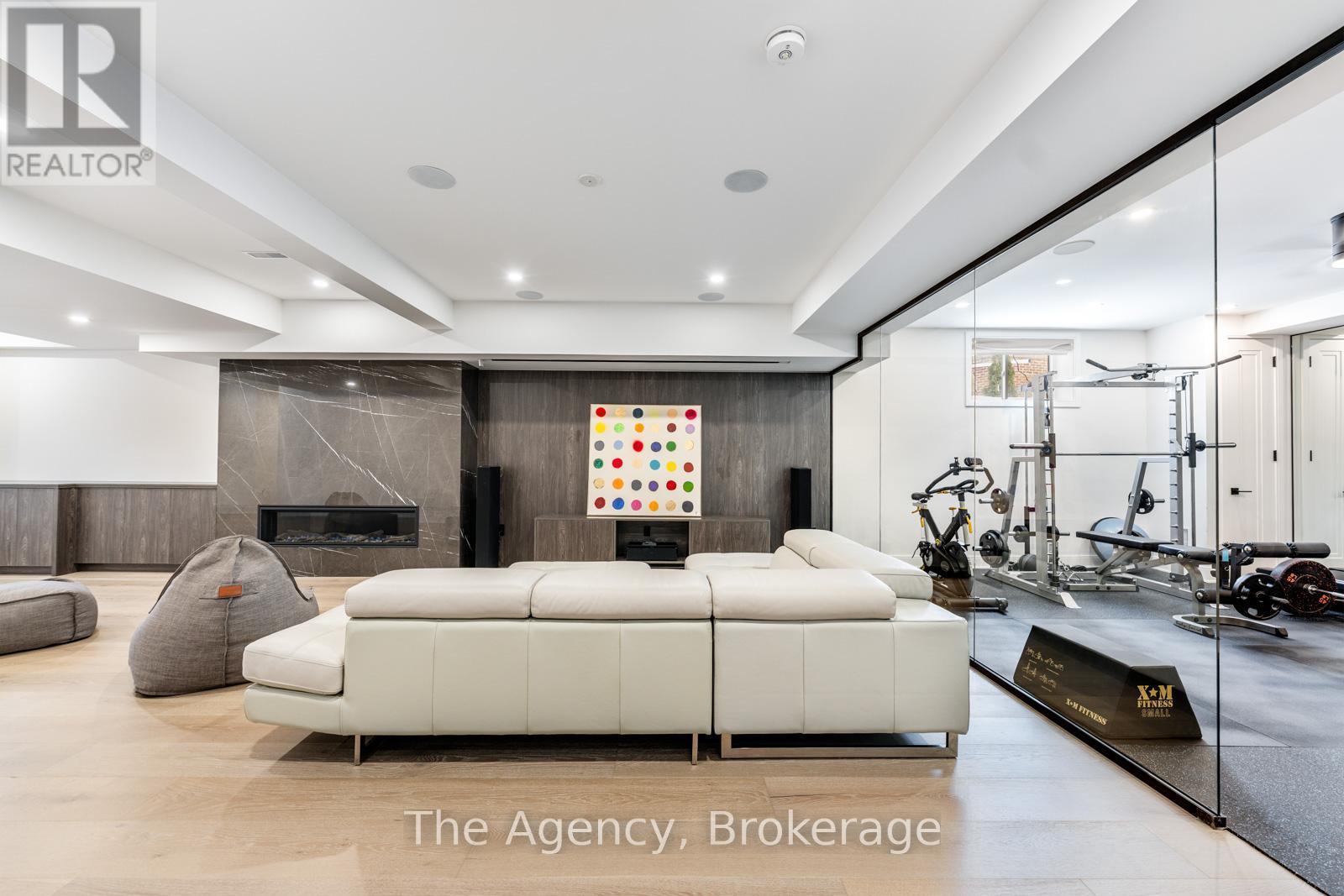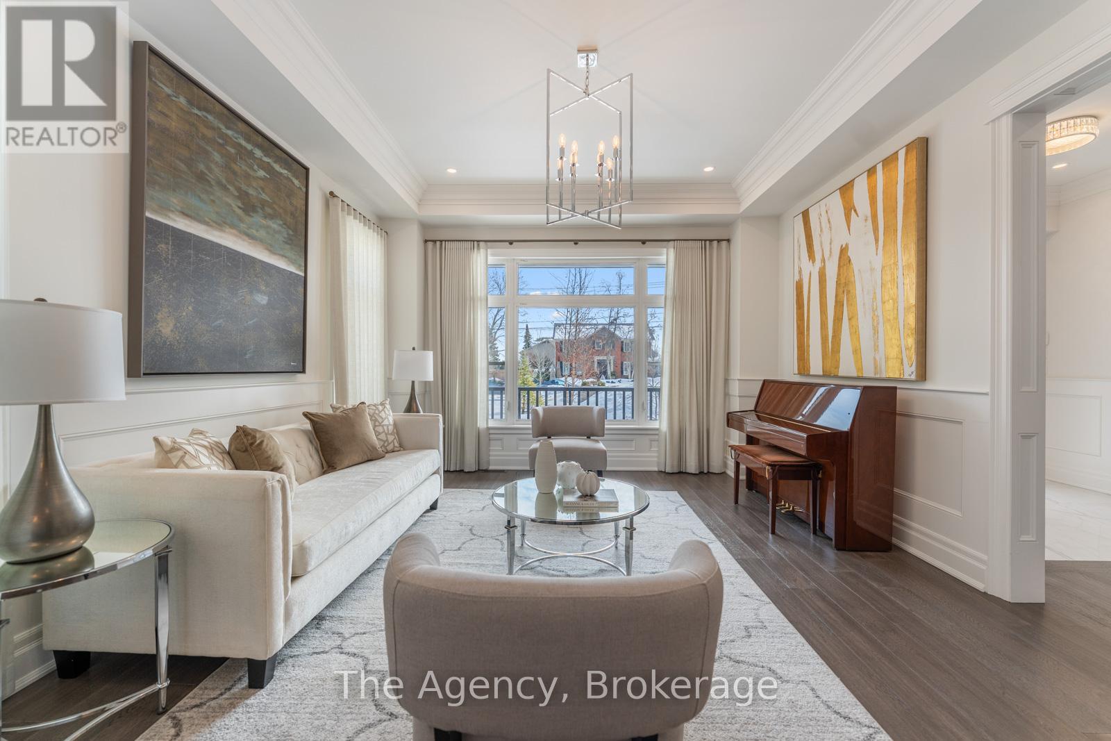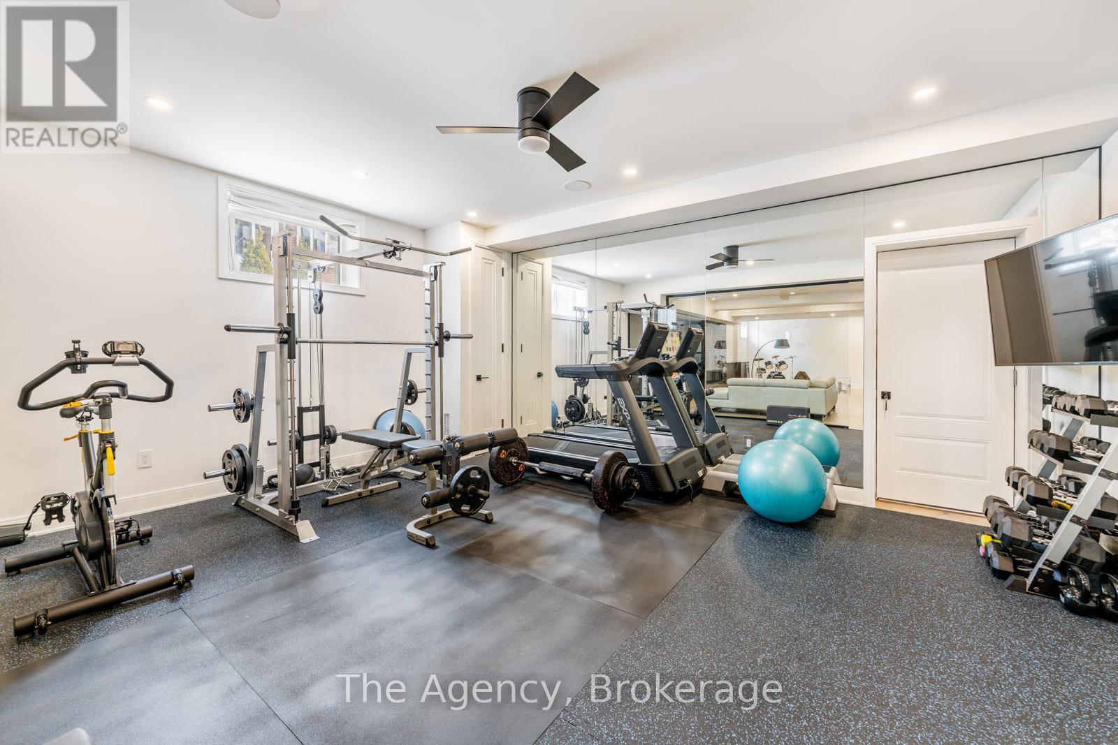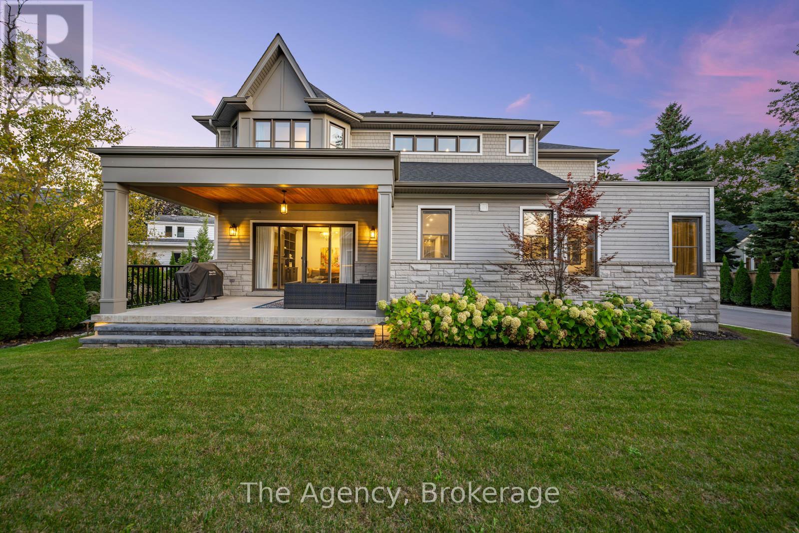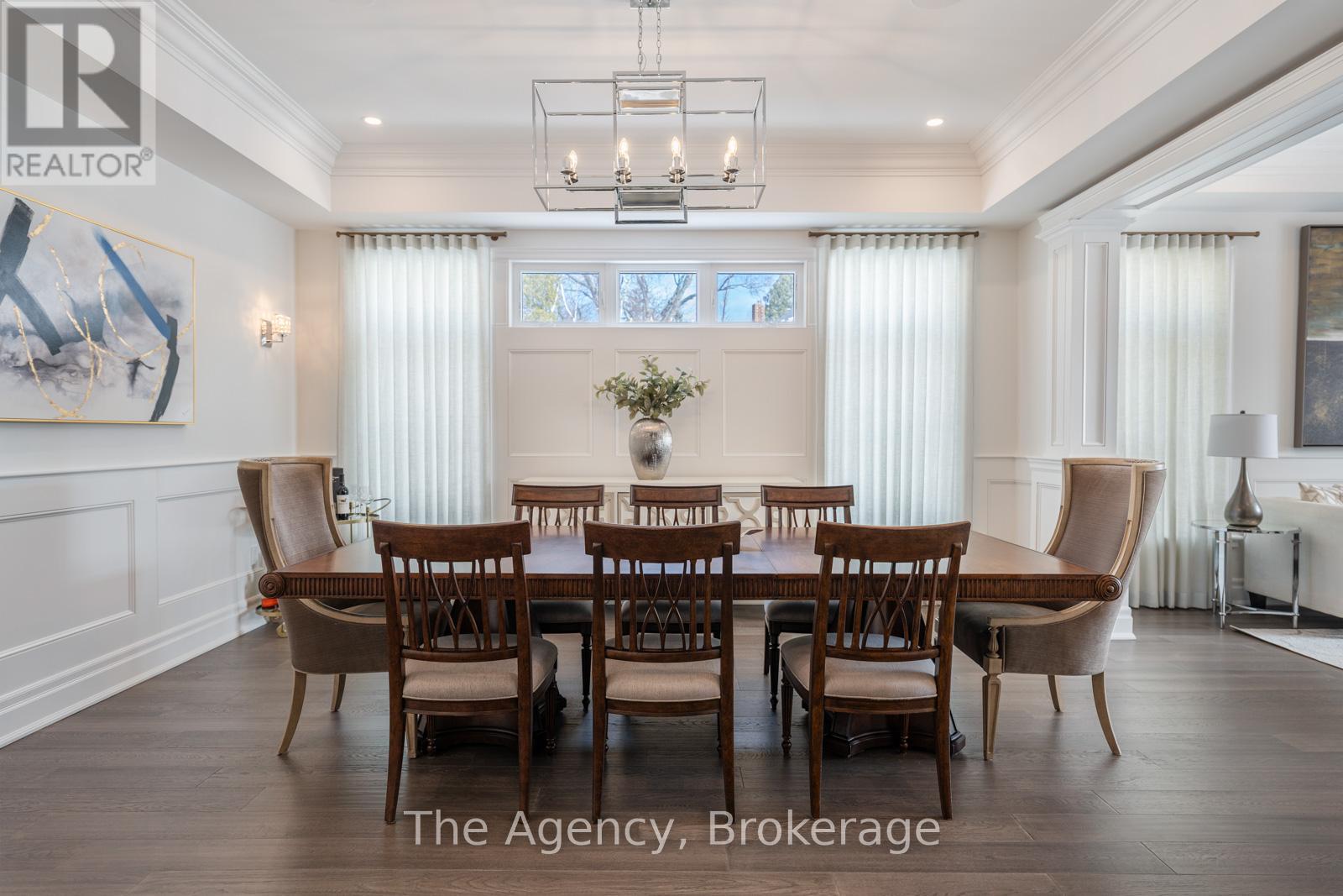 Your dream home awaits in an exclusive enclave just steps from Lake Ontario and minutes from downtown Burlington's shops, cafes, and restaurants. With 4+1 bedrooms and 6+2 bathrooms and a fully finished lower-level ideal for entertaining or extended family living this upgraded, custom home truly has it all. On the main level, hardwood floors, 10ft ceilings, wainscoting, coffered ceilings, and an oak staircase with wrought iron accents set a refined tone. The home features formal living and dining rooms, as well as a main floor family room with custom built-ins, a gas fireplace and patio doors leading to the exterior. A convenient mud room with access to the double car garage adds to the practicality of the space. The customized kitchen boasts a large center island, quartz countertops, a gas range, stainless steel appliances, and a cozy breakfast area. Upstairs, the primary suite includes a dressing room, ensuite, and laundry, while three additional bedrooms each enjoy their own ensuite bath. The fully finished lower level offers a spacious living area with a fireplace, projector screen, built in speakers, glass enclosed gym, guest bedroom, and heated bathroom floors. Set on a low-maintenance lot, this home offers both convenience and luxury, with a landscaped front yard featuring a sprinkler system and security cameras, plus a covered rear patio designed for relaxing outdoor living. (id:24334)