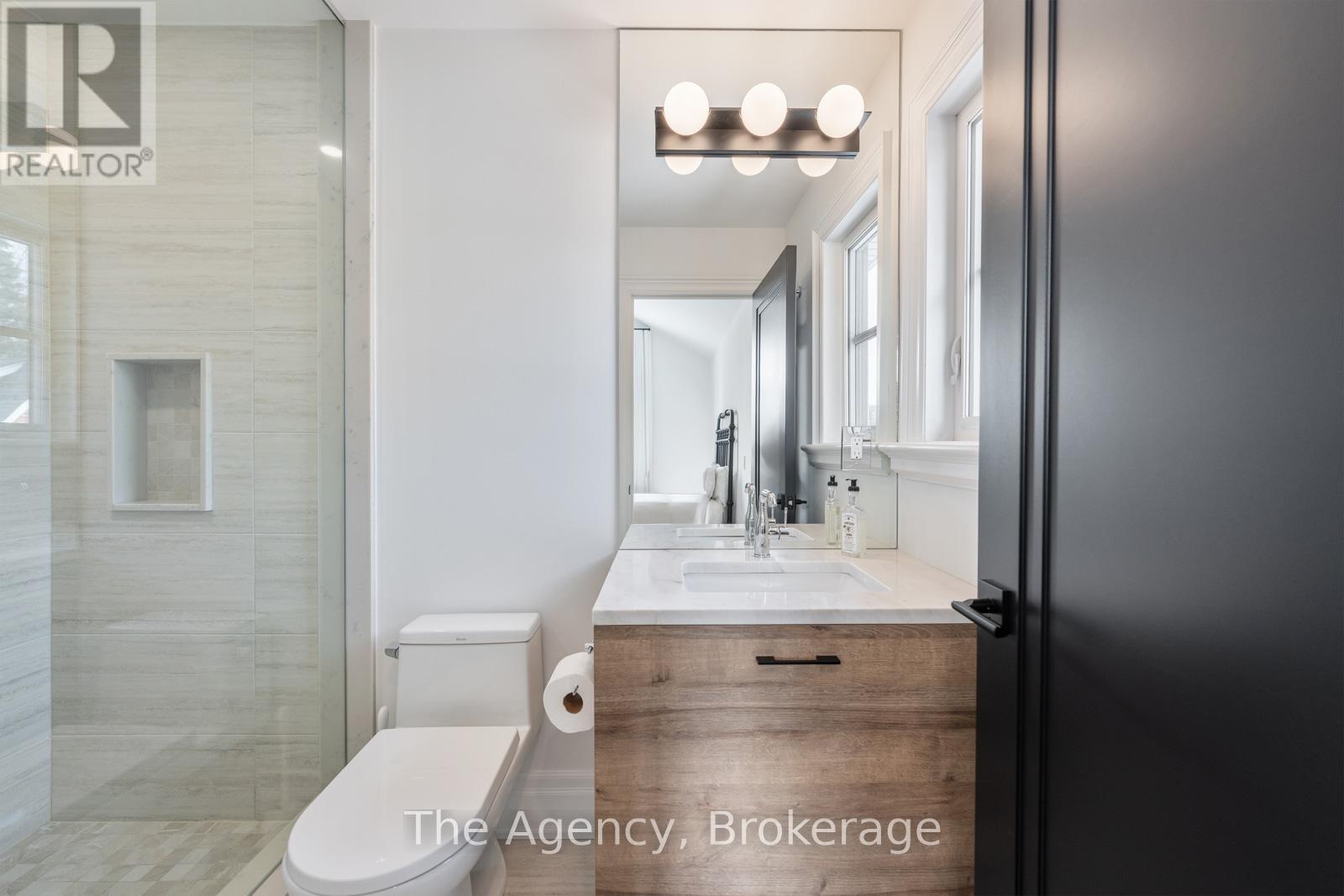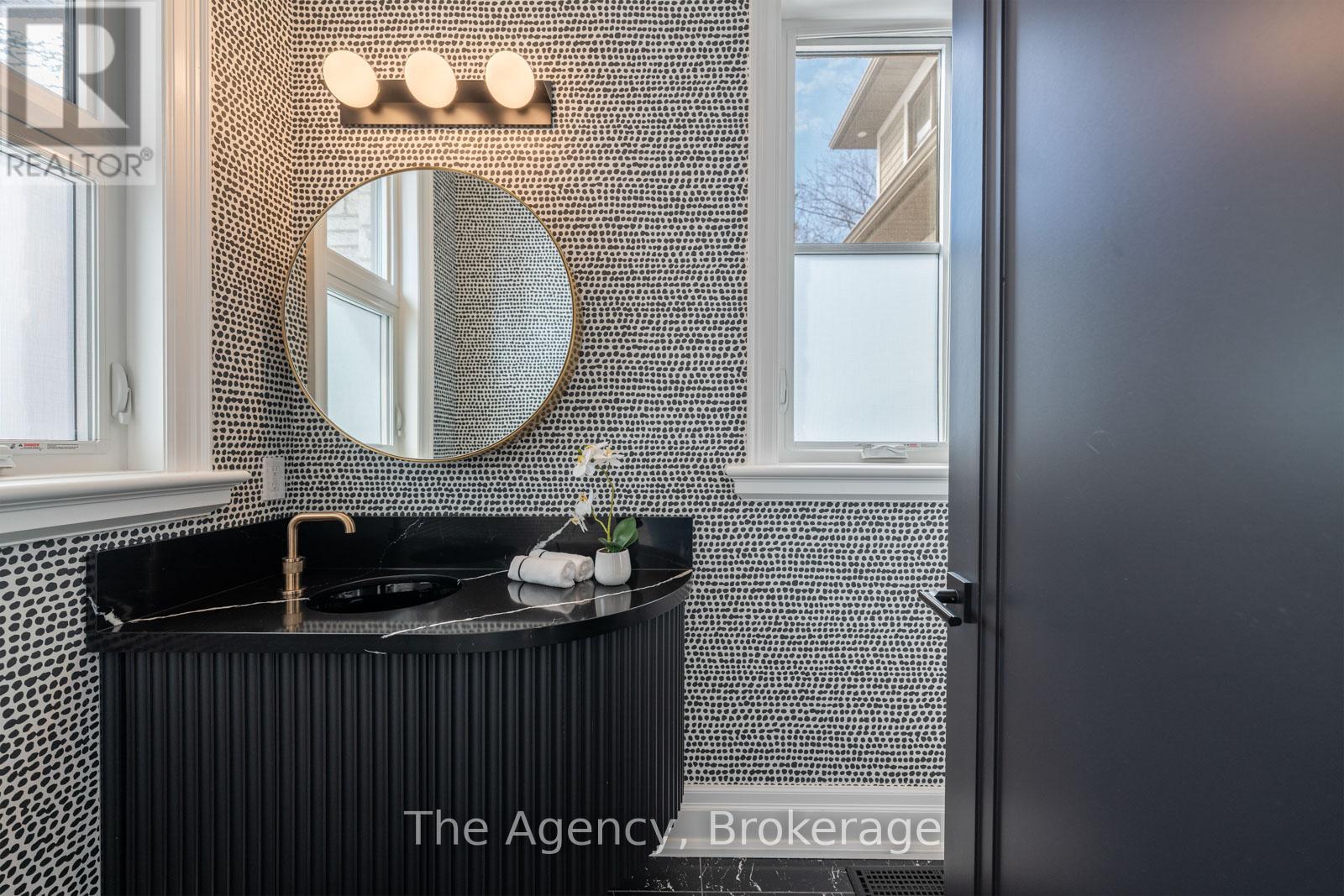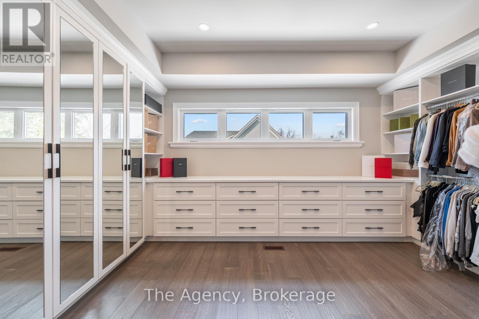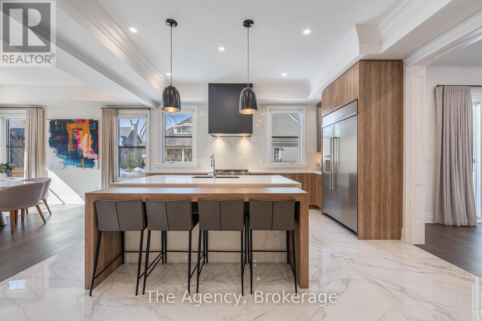 Your dream home awaits in an exclusive enclave just steps from Lake Ontario and minutes from downtown Burlington's shops, cafes, and restaurants. With 4+1 bedrooms and 6+2 bathrooms and a fully finished lower-level ideal for entertaining or extended family living this upgraded, custom home truly has it all. On the main level, hardwood floors, 10ft ceilings, wainscoting, coffered ceilings, and an oak staircase with wrought iron accents set a refined tone. The home features formal living and dining rooms, as well as a main floor family room with custom built-ins, a gas fireplace and patio doors leading to the exterior. A convenient mud room with access to the double car garage adds to the practicality of the space. The customized kitchen boasts a large center island, quartz countertops, a gas range, stainless steel appliances, and a cozy breakfast area. Upstairs, the primary suite includes a dressing room, ensuite, and laundry, while three additional bedrooms each enjoy their own ensuite bath. The fully finished lower level offers a spacious living area with a fireplace, projector screen, built in speakers, glass enclosed gym, guest bedroom, and heated bathroom floors. Set on a low-maintenance lot, this home offers both convenience and luxury, with a landscaped front yard featuring a sprinkler system and security cameras, plus a covered rear patio designed for relaxing outdoor living. (id:24334)