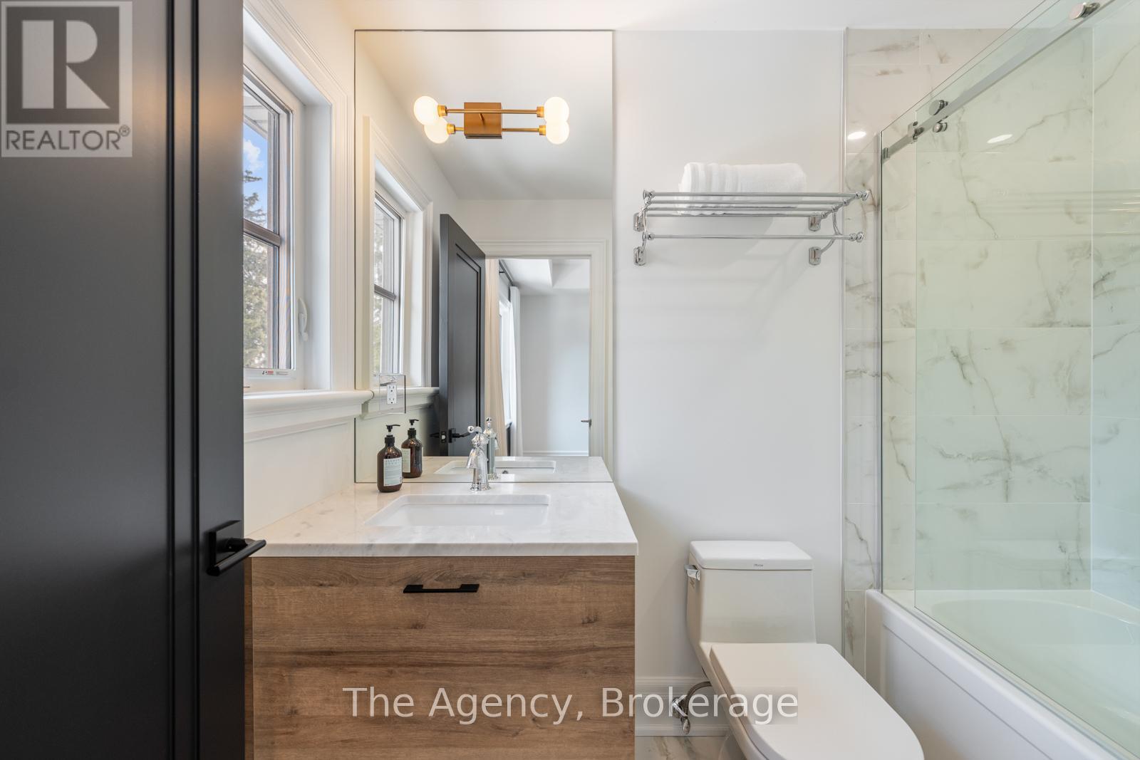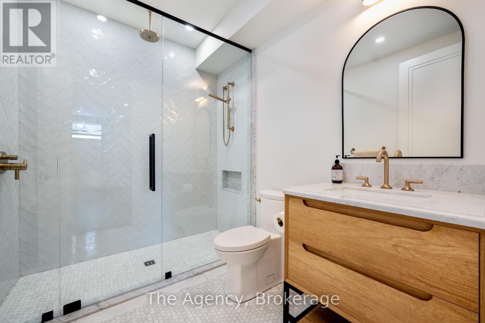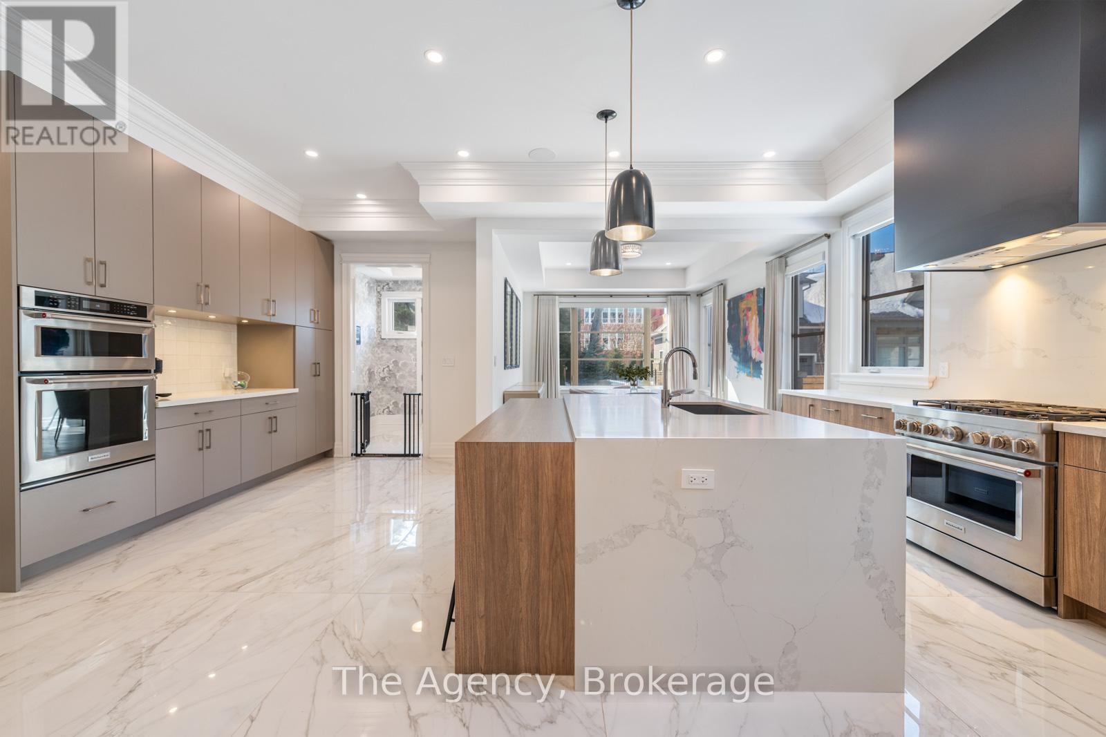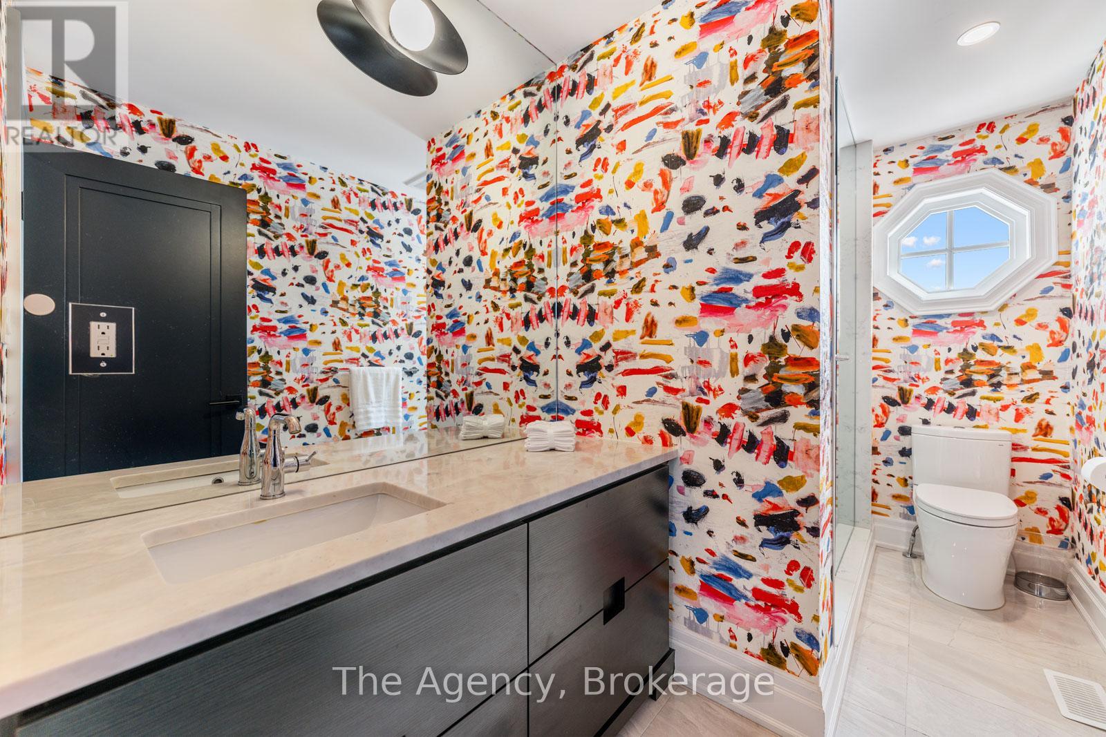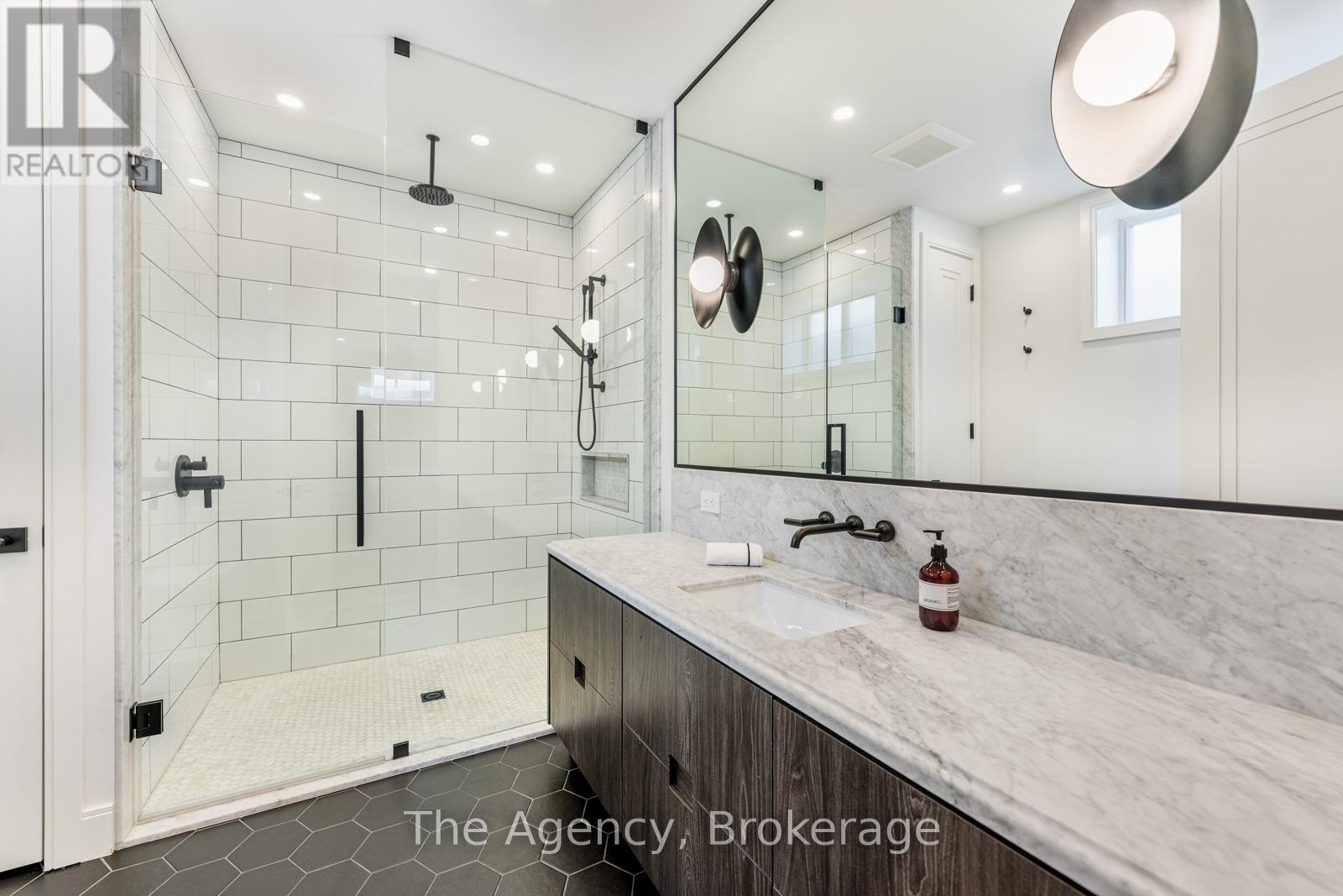 Your dream home awaits in an exclusive enclave just steps from Lake Ontario and minutes from downtown Burlington's shops, cafes, and restaurants. With 4+1 bedrooms and 6+2 bathrooms and a fully finished lower-level ideal for entertaining or extended family living this upgraded, custom home truly has it all. On the main level, hardwood floors, 10ft ceilings, wainscoting, coffered ceilings, and an oak staircase with wrought iron accents set a refined tone. The home features formal living and dining rooms, as well as a main floor family room with custom built-ins, a gas fireplace and patio doors leading to the exterior. A convenient mud room with access to the double car garage adds to the practicality of the space. The customized kitchen boasts a large center island, quartz countertops, a gas range, stainless steel appliances, and a cozy breakfast area. Upstairs, the primary suite includes a dressing room, ensuite, and laundry, while three additional bedrooms each enjoy their own ensuite bath. The fully finished lower level offers a spacious living area with a fireplace, projector screen, built in speakers, glass enclosed gym, guest bedroom, and heated bathroom floors. Set on a low-maintenance lot, this home offers both convenience and luxury, with a landscaped front yard featuring a sprinkler system and security cameras, plus a covered rear patio designed for relaxing outdoor living. (id:24334)