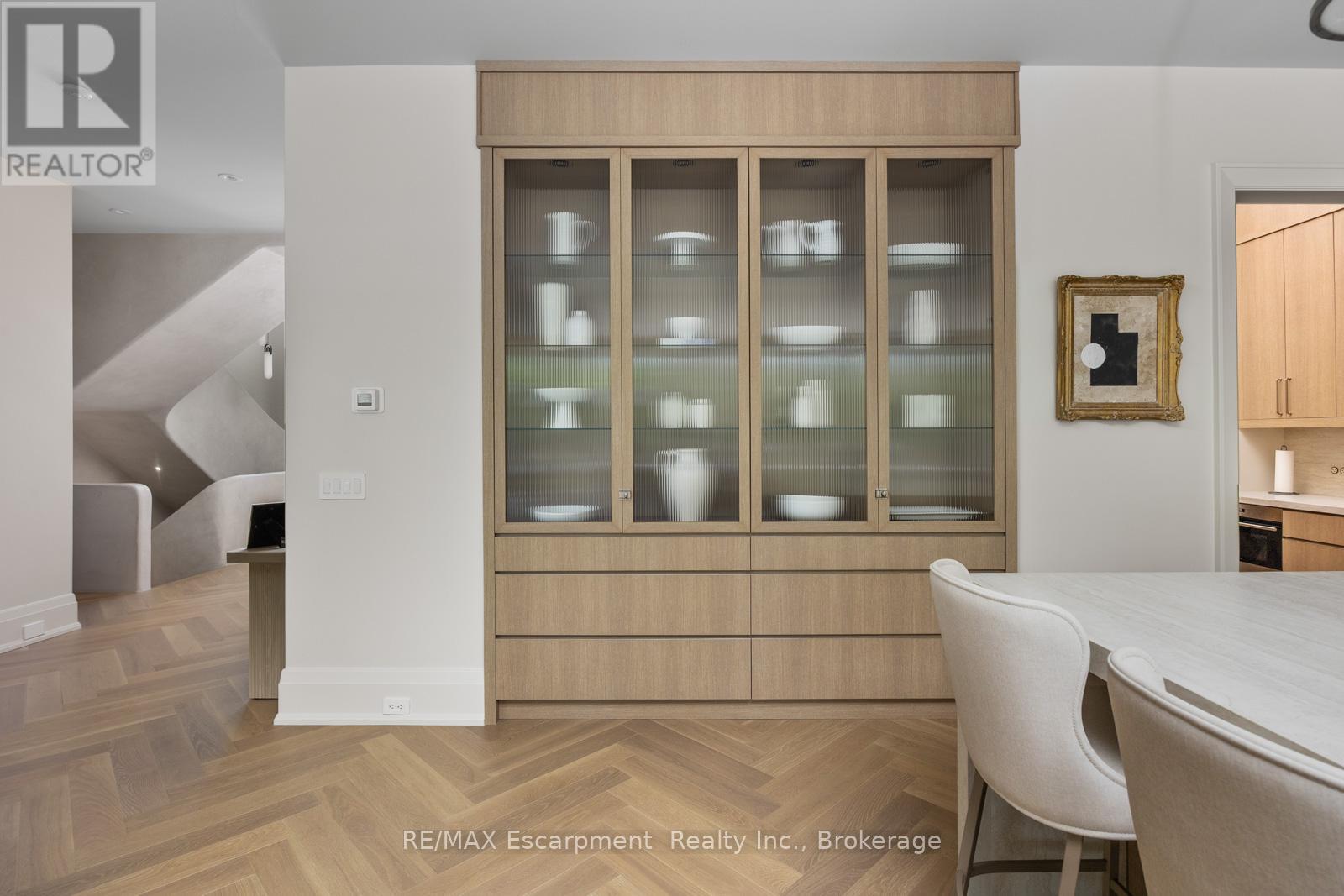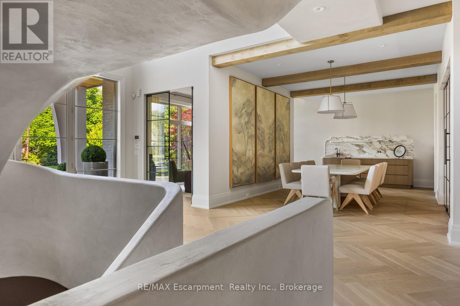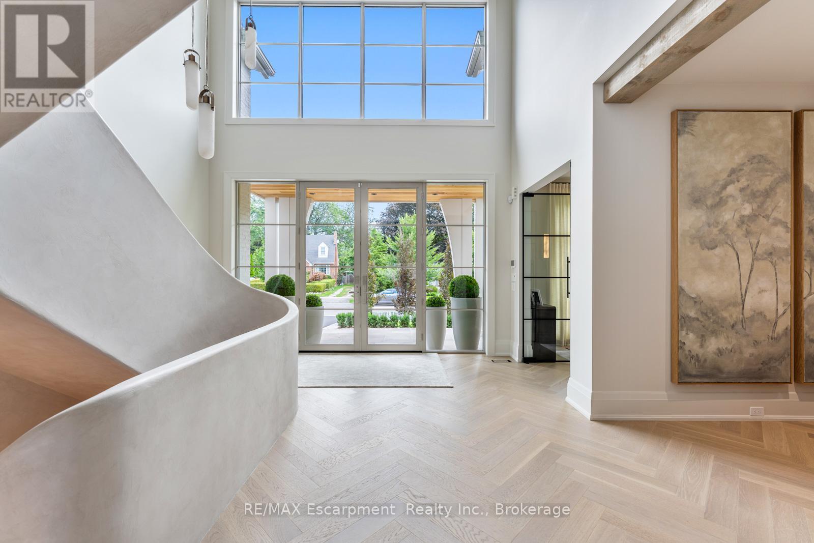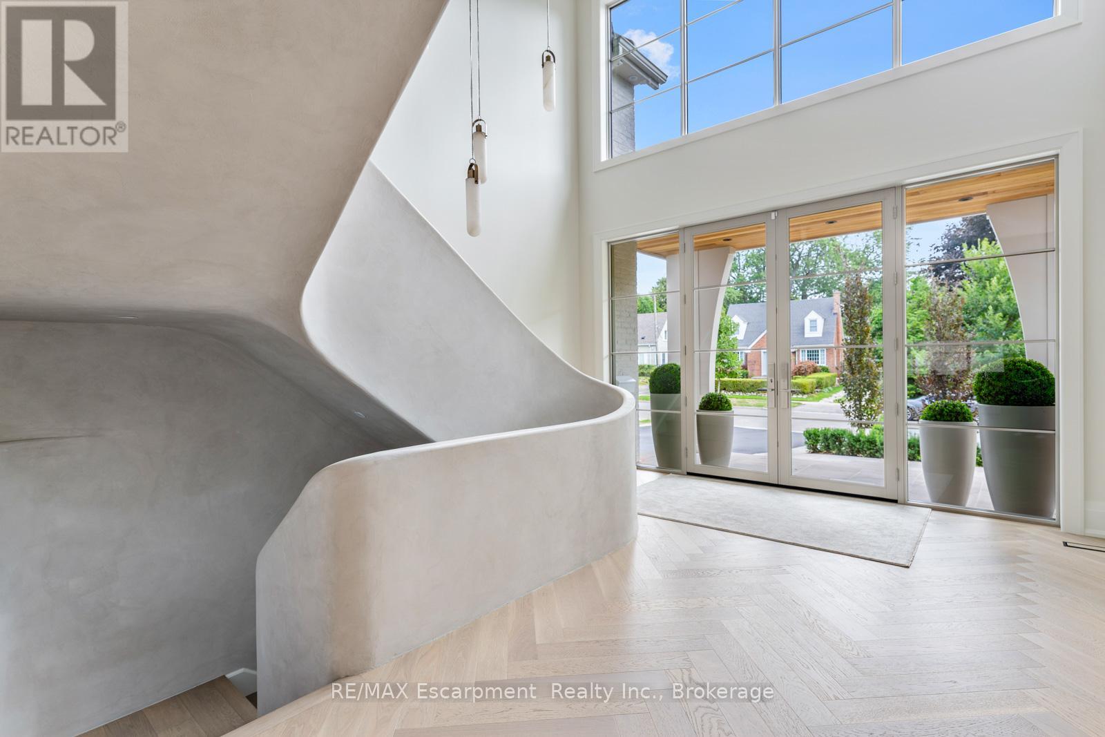 Welcome to 304 Pomona Avenue, a truly magnificent newly built home in Burlington's highly coveted Roseland community. Step inside and you're greeted by an incredible hand-carved plaster staircase rising through all three levels that's perfectly paired with rift-cut white oak herringbone floors that set an elevated tone. A formal dining room makes a statement with decorative ceiling beams, a glass wine display, and a marble wet bar. The private library draws you in, finished with oak panelled walls and a reading nook with floor-to-ceiling corner windows that flood the room with natural light. The living room completes the main level's gathering spaces with its plaster fireplace, oak shelving with integrated lighting, and full in-ceiling speakers. At the heart of the home, the kitchen offers a large custom plaster hood, oversized waterfall island, porcelain counters, and top-tier appliances including a 60" Wolf double oven, Sub-Zero fridge and freezer, and Bosch dishwasher. Pantry storage with reeded glass cabinetry and a walk-through servery extends the workspace. Just beyond, the breakfast area opens to a beautiful and serene covered terrace with a built-in BBQ, outdoor fridge, fireplace, and cedar-lined ceiling-overlooking the saltwater pool and landscaped gardens. Upstairs, four bedrooms each include private ensuites. The primary suite features a spacious walk-in closet and a spa-like bath with dual vanities, soaker tub, heated floors, and oversized shower. A full laundry room with custom cabinetry completes this level. The lower level expands the living space with a second kitchen, home theatre, gym, fifth bedroom, full bath, and radiant heated floors. Outside, stone patios, mature landscaping, irrigation, and a hydrangea wall create a welcoming backdrop. With 4+1 bedrooms, 7 bathrooms, and over 6,000 sq. ft. of living space, this Roseland residence combines thoughtful design with everyday comfort. Move in and enjoy! Luxury Certified. (id:24334)