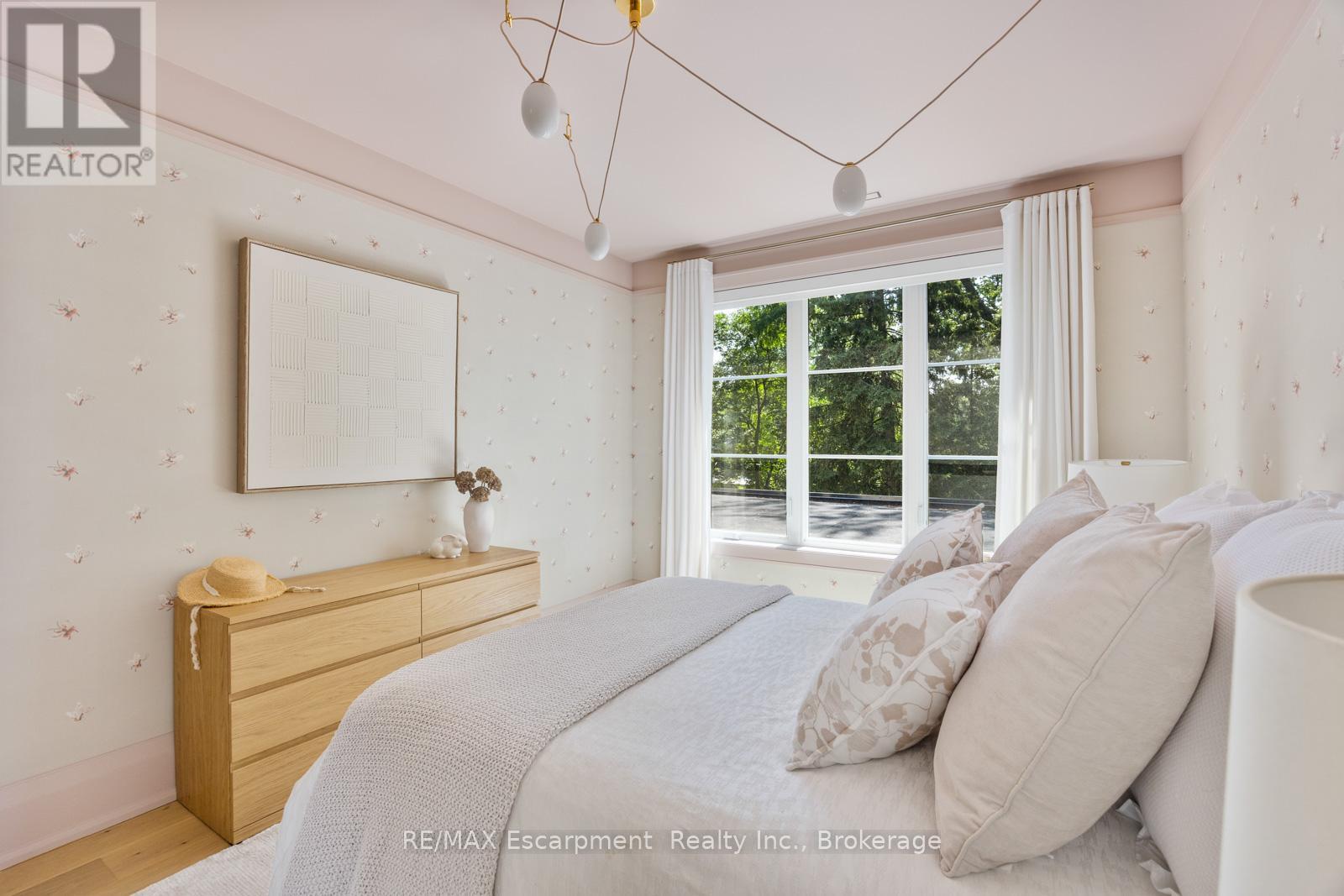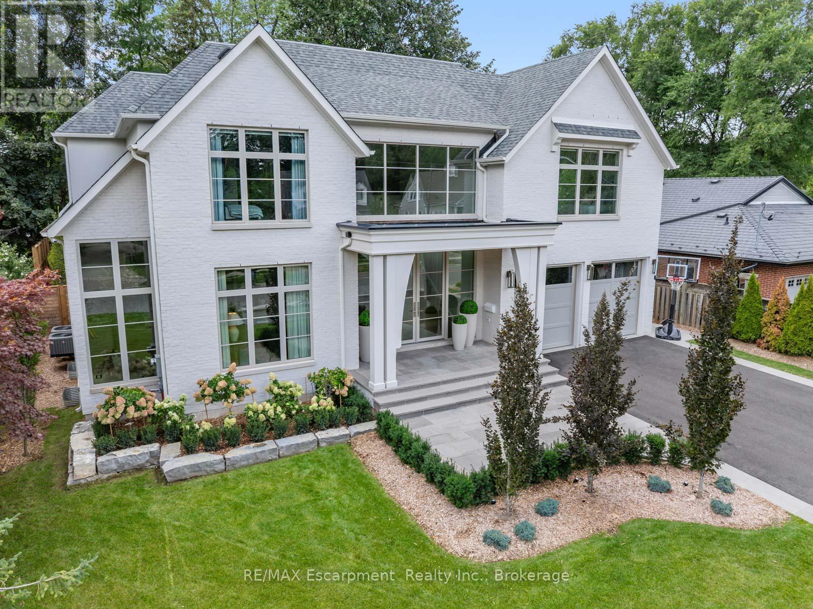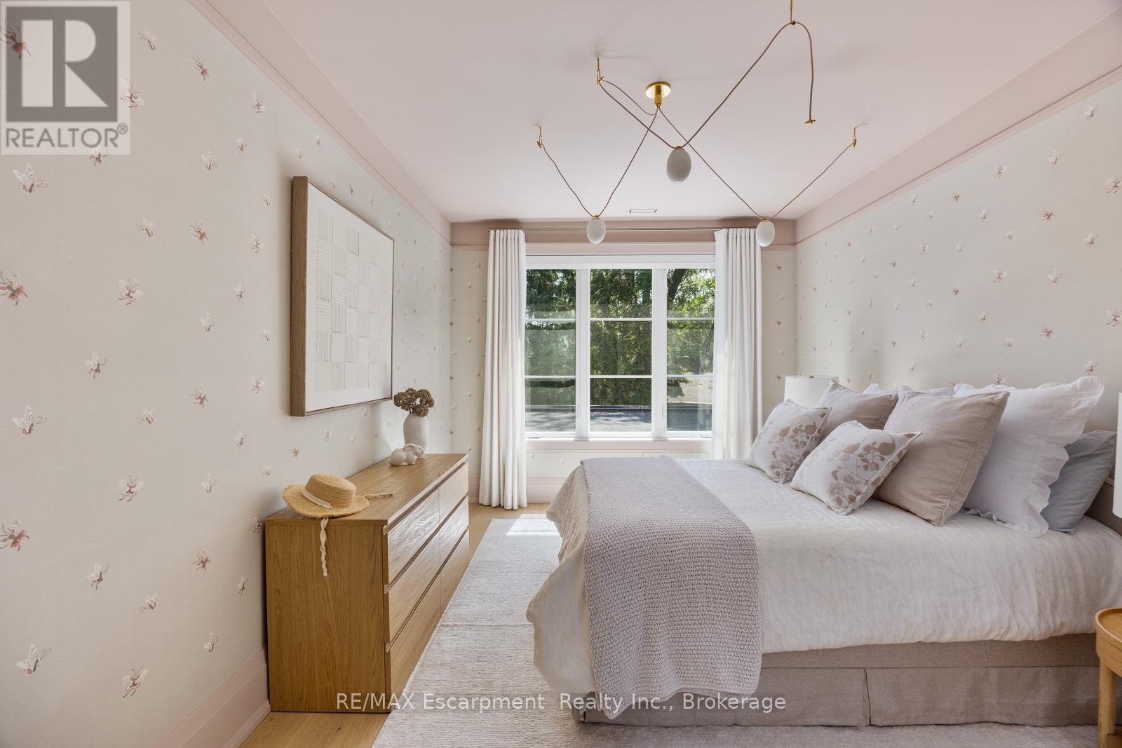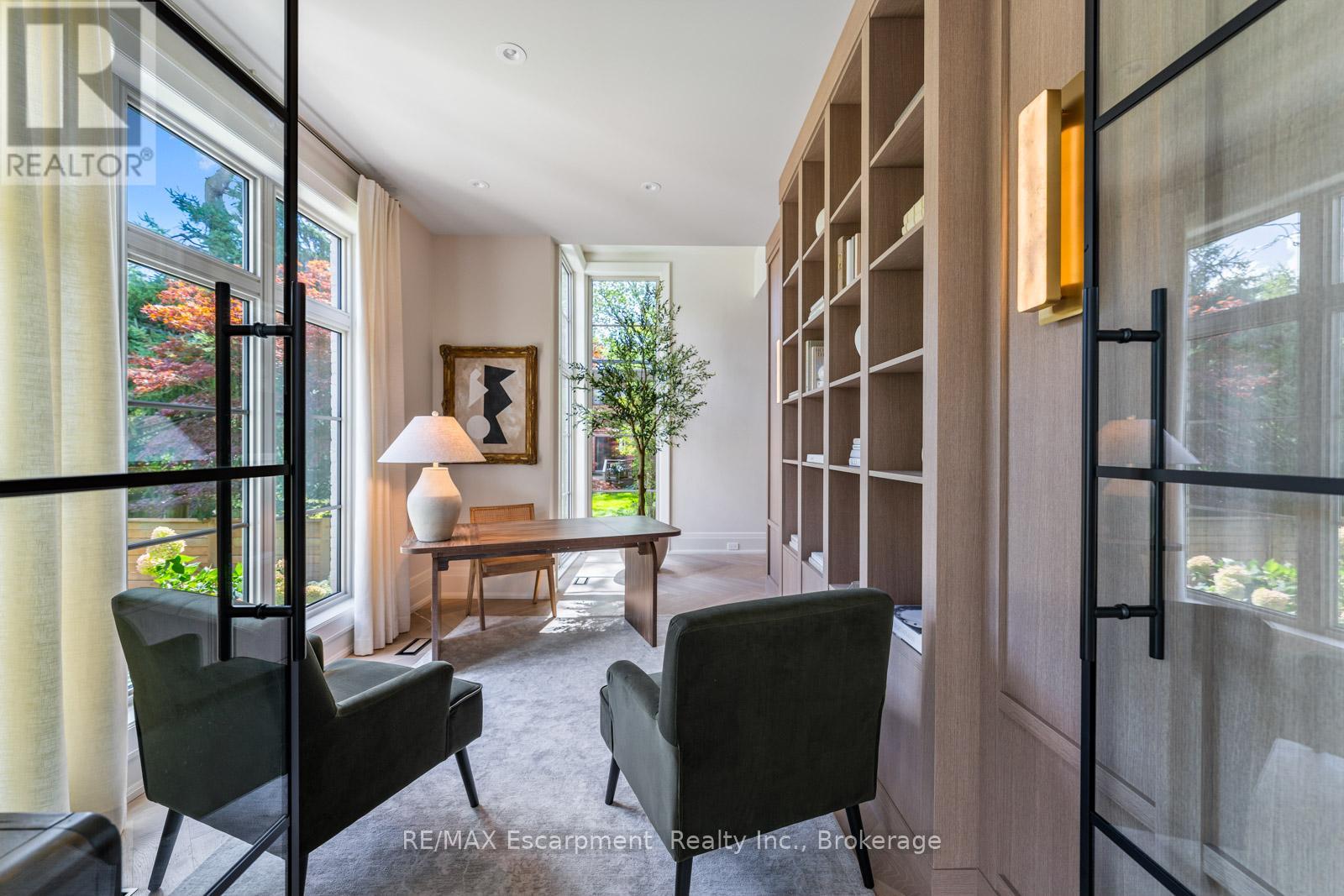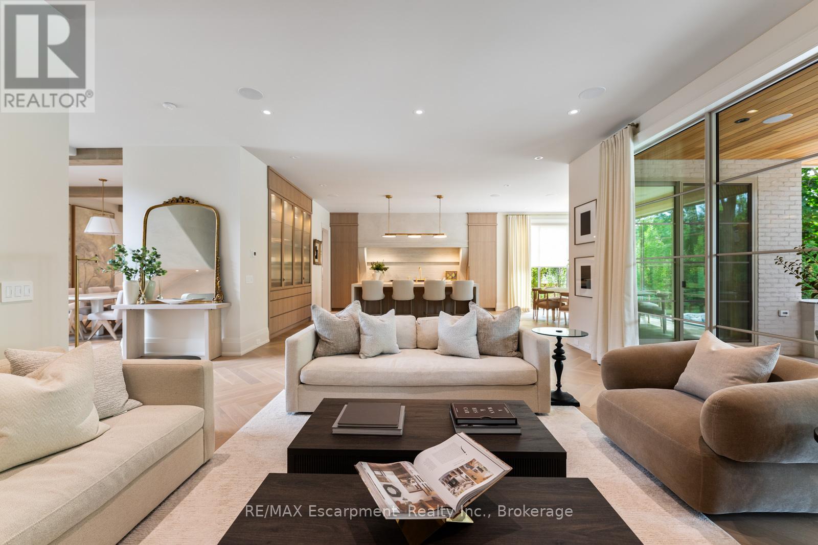 Welcome to 304 Pomona Avenue, a truly magnificent newly built home in Burlington's highly coveted Roseland community. Step inside and you're greeted by an incredible hand-carved plaster staircase rising through all three levels that's perfectly paired with rift-cut white oak herringbone floors that set an elevated tone. A formal dining room makes a statement with decorative ceiling beams, a glass wine display, and a marble wet bar. The private library draws you in, finished with oak panelled walls and a reading nook with floor-to-ceiling corner windows that flood the room with natural light. The living room completes the main level's gathering spaces with its plaster fireplace, oak shelving with integrated lighting, and full in-ceiling speakers. At the heart of the home, the kitchen offers a large custom plaster hood, oversized waterfall island, porcelain counters, and top-tier appliances including a 60" Wolf double oven, Sub-Zero fridge and freezer, and Bosch dishwasher. Pantry storage with reeded glass cabinetry and a walk-through servery extends the workspace. Just beyond, the breakfast area opens to a beautiful and serene covered terrace with a built-in BBQ, outdoor fridge, fireplace, and cedar-lined ceiling-overlooking the saltwater pool and landscaped gardens. Upstairs, four bedrooms each include private ensuites. The primary suite features a spacious walk-in closet and a spa-like bath with dual vanities, soaker tub, heated floors, and oversized shower. A full laundry room with custom cabinetry completes this level. The lower level expands the living space with a second kitchen, home theatre, gym, fifth bedroom, full bath, and radiant heated floors. Outside, stone patios, mature landscaping, irrigation, and a hydrangea wall create a welcoming backdrop. With 4+1 bedrooms, 7 bathrooms, and over 6,000 sq. ft. of living space, this Roseland residence combines thoughtful design with everyday comfort. Move in and enjoy! Luxury Certified. (id:24334)