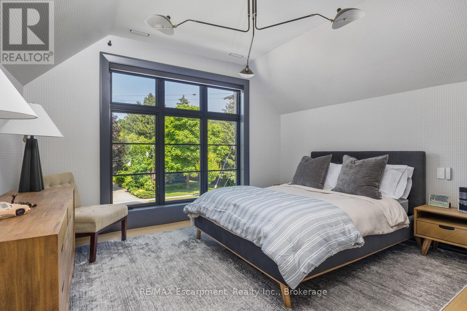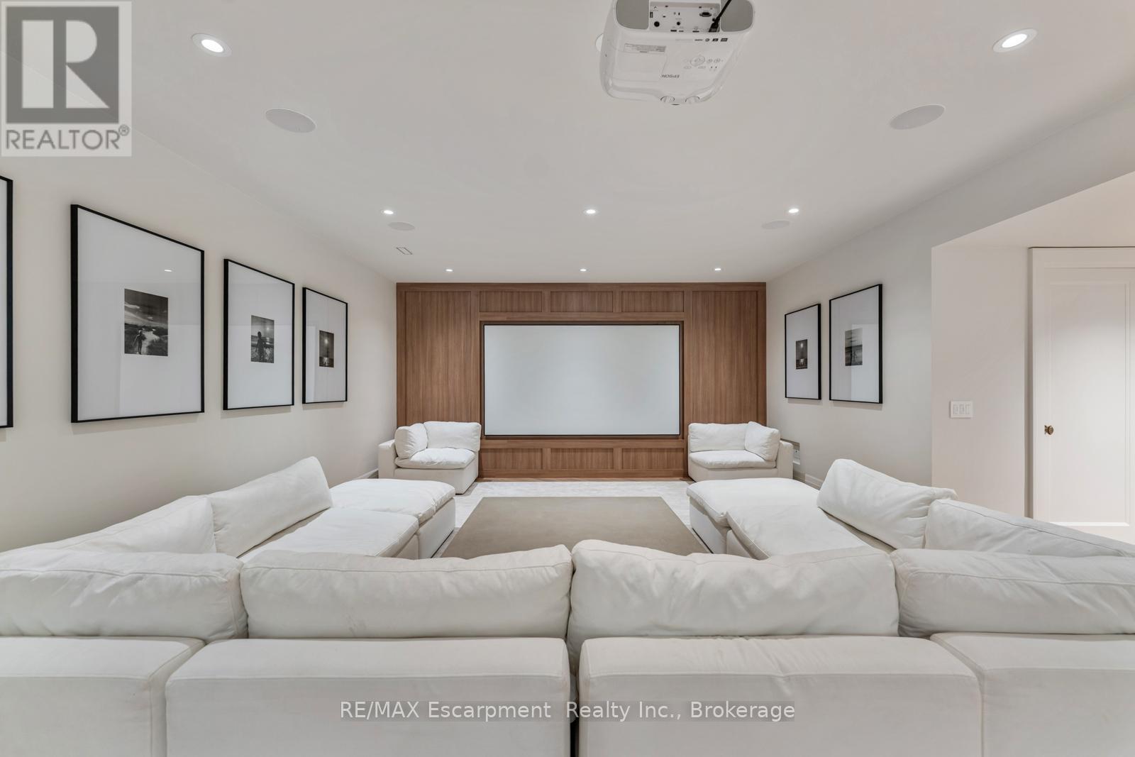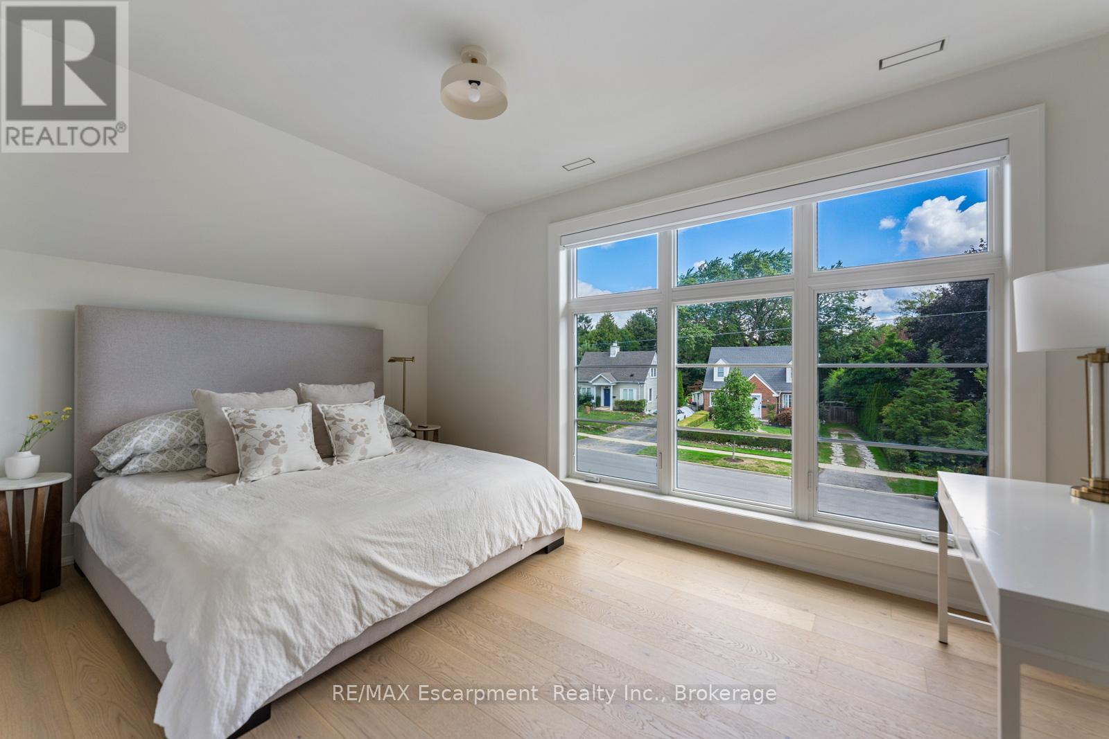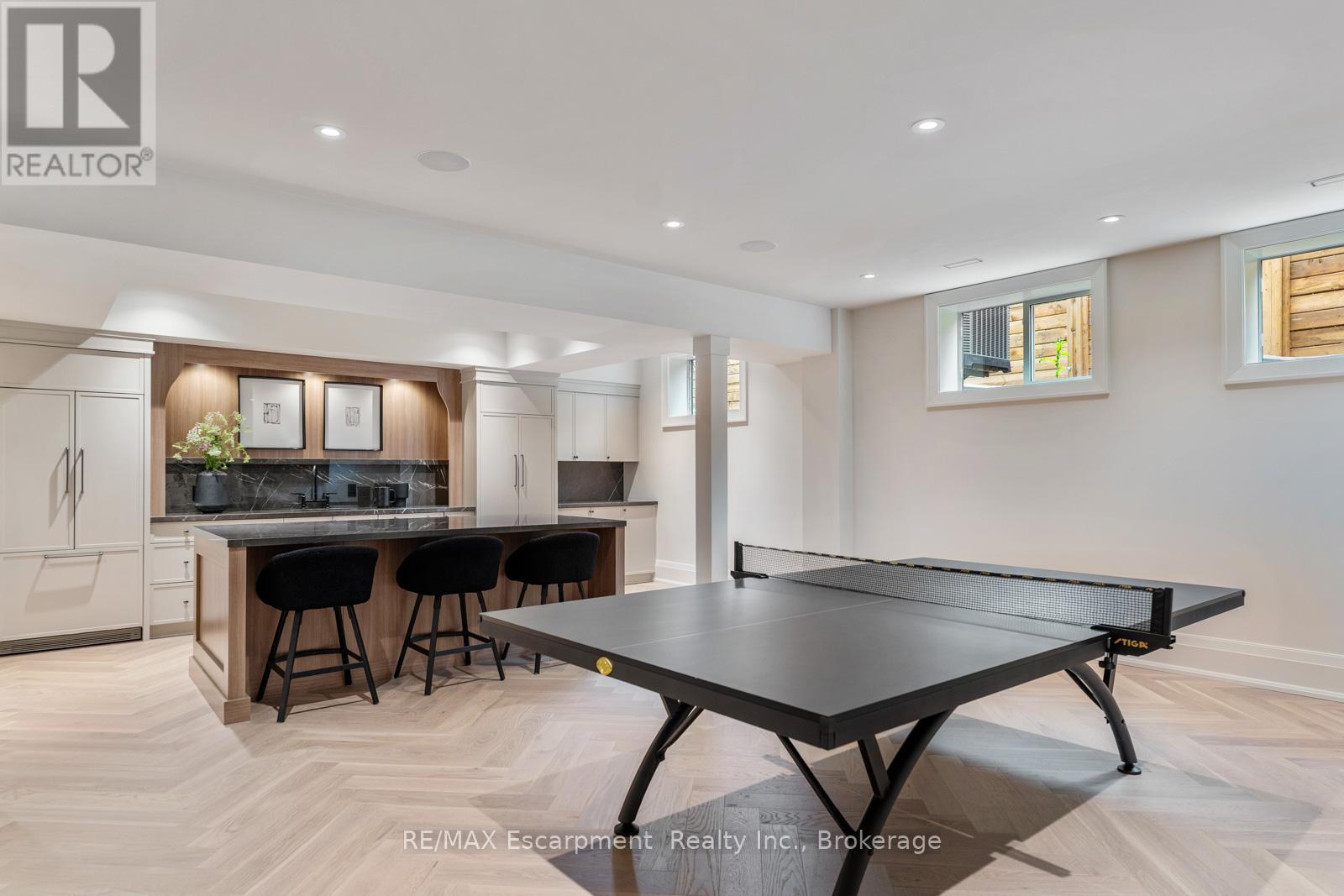 Welcome to 304 Pomona Avenue, a truly magnificent newly built home in Burlington's highly coveted Roseland community. Step inside and you're greeted by an incredible hand-carved plaster staircase rising through all three levels that's perfectly paired with rift-cut white oak herringbone floors that set an elevated tone. A formal dining room makes a statement with decorative ceiling beams, a glass wine display, and a marble wet bar. The private library draws you in, finished with oak panelled walls and a reading nook with floor-to-ceiling corner windows that flood the room with natural light. The living room completes the main level's gathering spaces with its plaster fireplace, oak shelving with integrated lighting, and full in-ceiling speakers. At the heart of the home, the kitchen offers a large custom plaster hood, oversized waterfall island, porcelain counters, and top-tier appliances including a 60" Wolf double oven, Sub-Zero fridge and freezer, and Bosch dishwasher. Pantry storage with reeded glass cabinetry and a walk-through servery extends the workspace. Just beyond, the breakfast area opens to a beautiful and serene covered terrace with a built-in BBQ, outdoor fridge, fireplace, and cedar-lined ceiling-overlooking the saltwater pool and landscaped gardens. Upstairs, four bedrooms each include private ensuites. The primary suite features a spacious walk-in closet and a spa-like bath with dual vanities, soaker tub, heated floors, and oversized shower. A full laundry room with custom cabinetry completes this level. The lower level expands the living space with a second kitchen, home theatre, gym, fifth bedroom, full bath, and radiant heated floors. Outside, stone patios, mature landscaping, irrigation, and a hydrangea wall create a welcoming backdrop. With 4+1 bedrooms, 7 bathrooms, and over 6,000 sq. ft. of living space, this Roseland residence combines thoughtful design with everyday comfort. Move in and enjoy! Luxury Certified. (id:24334)