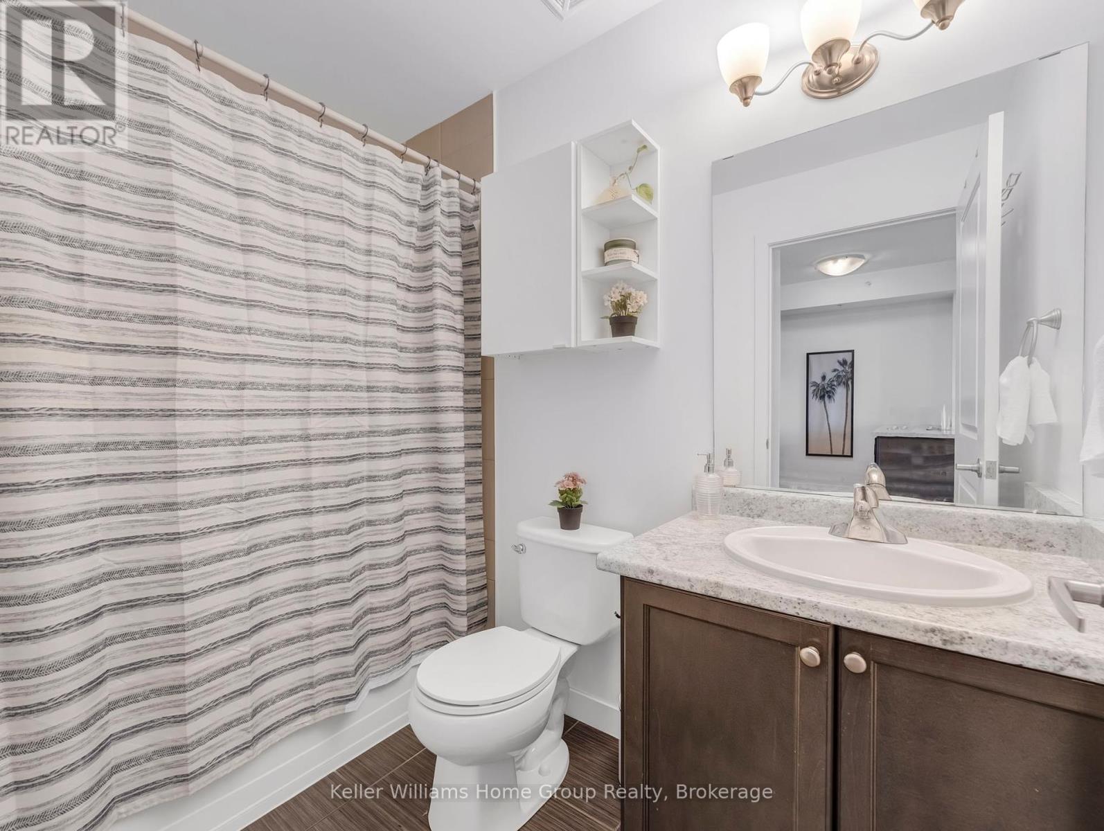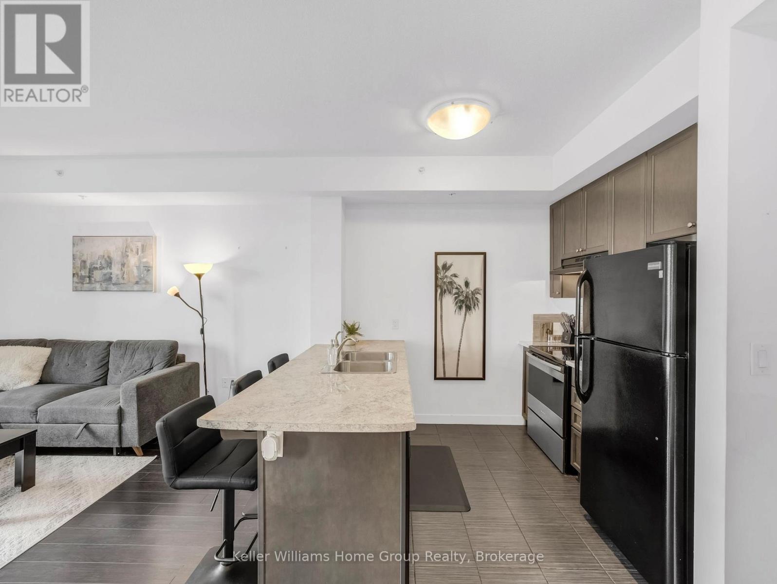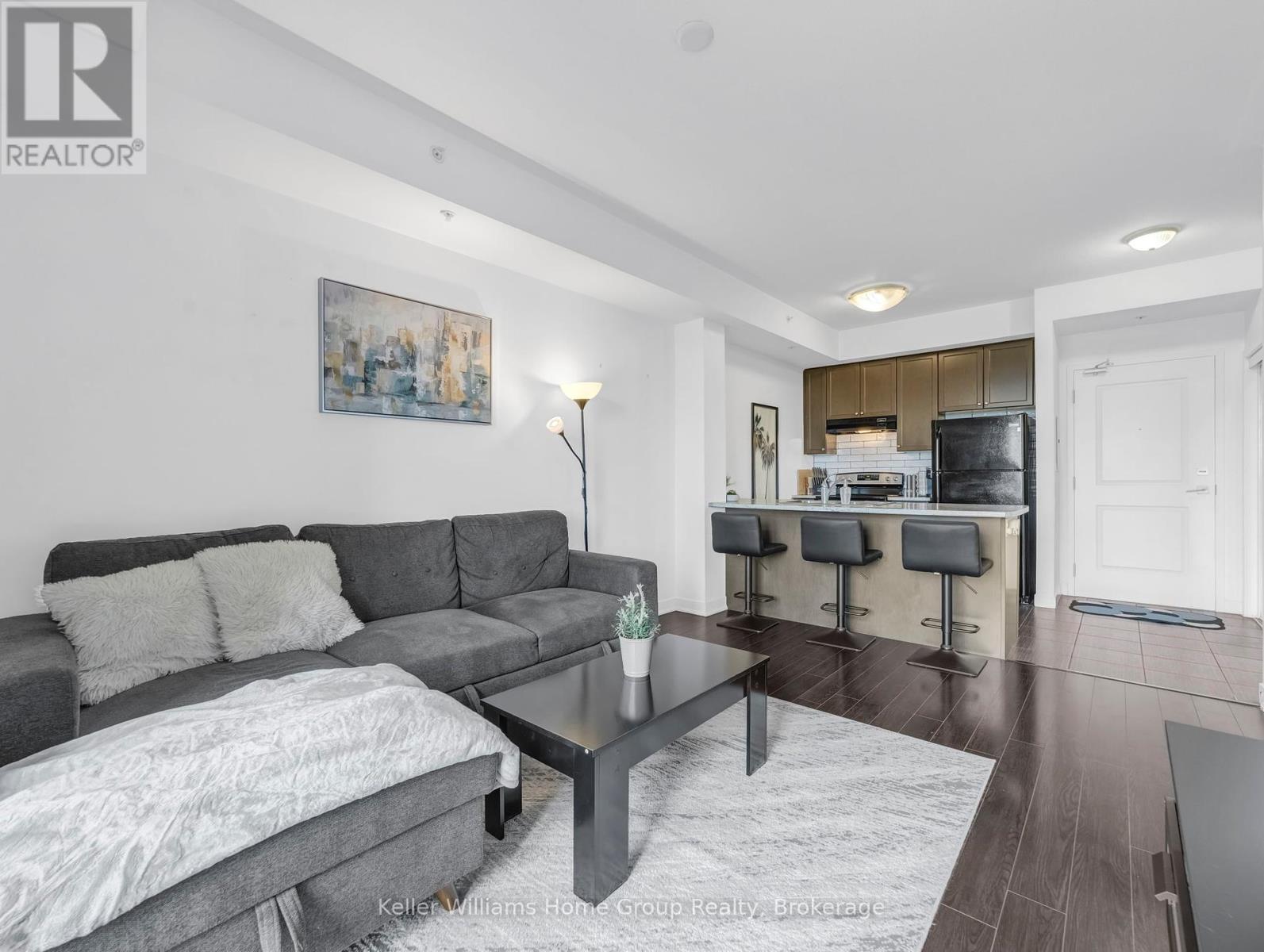 Welcome to Vibe Condos, where modern luxury meets intelligent living. This opportunity to own a well-managed residence is designed for comfort, efficiency, and an unparalleled lifestyle. This property is perfect for first-time buyers seeking a smart entry into the market, those looking to downsize without sacrificing quality, or the astute investor building a strong portfolio. Step into a bright, West-facing sanctuary that greets you with 9' ceilings and beautiful upgraded flooring that flows throughout. The open-concept layout is perfect for both entertaining and everyday living. Unwind in the living area, where a glass door leads to your private balcony, the ideal perch to enjoy morning coffees and sunsets. The kitchen is both stylish and functional, featuring a sleek breakfast bar for casual dining, a contemporary updated backsplash, and reliable appliances. Retreat to the spacious and bright bedroom, a peaceful haven offering ample space for rest and relaxation. The elegant four-piece bathroom is appointed with timeless finishes, and the ultimate convenience is delivered with in-suite laundry. This home is powered by a cutting-edge geothermal heating and cooling system, a premium feature that ensures year-round comfort and sustainable condo fees. The condo fees also cover heat, water and parking, presenting incredible value. This investment includes one underground parking space and one storage locker, both steps from the elevator. Indulge in a host of premium building amenities without leaving home. There is a spacious gym, party room for hosting gatherings, a stunning rooftop terrace with panoramic views, and ample visitor parking. Experience the ultimate in convenience with an unbeatable location. You are just minutes from a myriad of boutiques, cafes, and restaurants, easy access to public transit for a seamless commute, grocery stores for all your essentials, and quick access to the QEW and Highway 407, putting the entire Greater Toronto Area within reach. (id:24334)