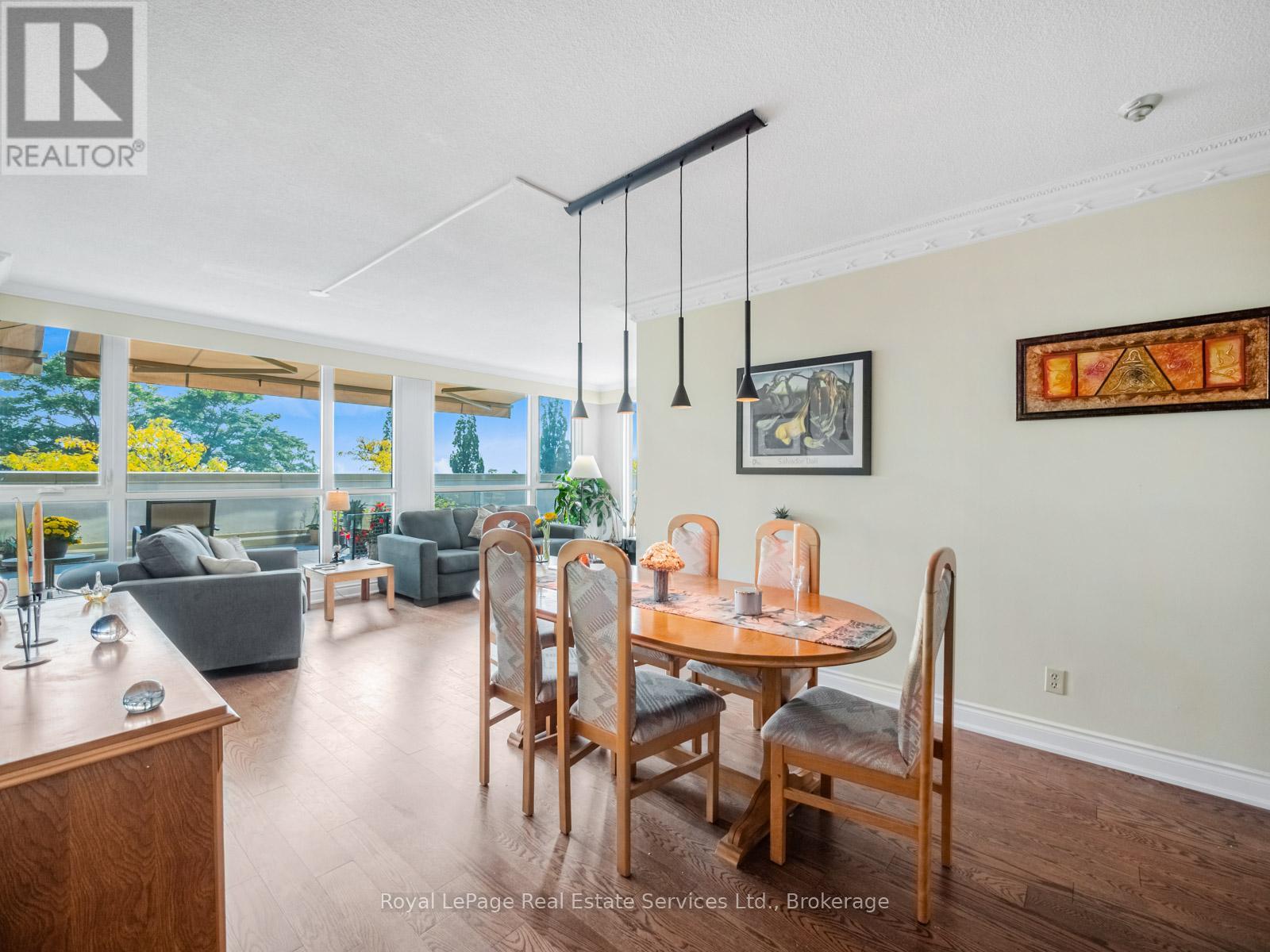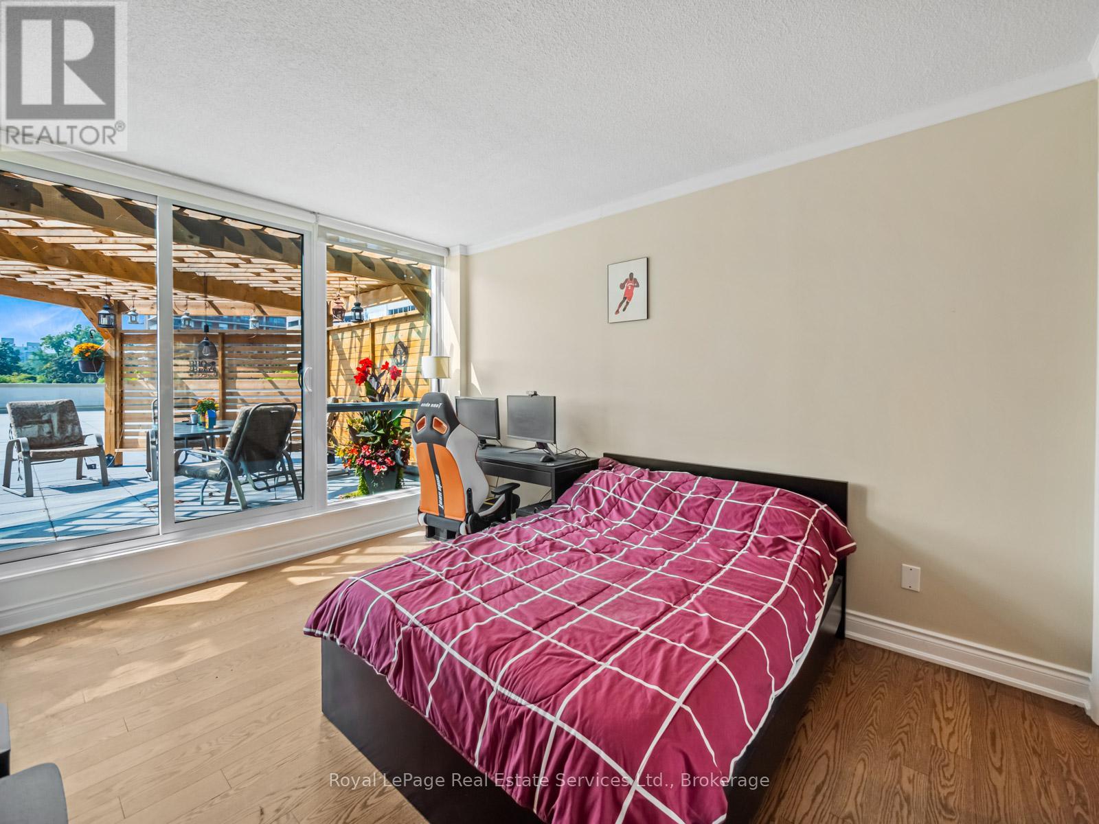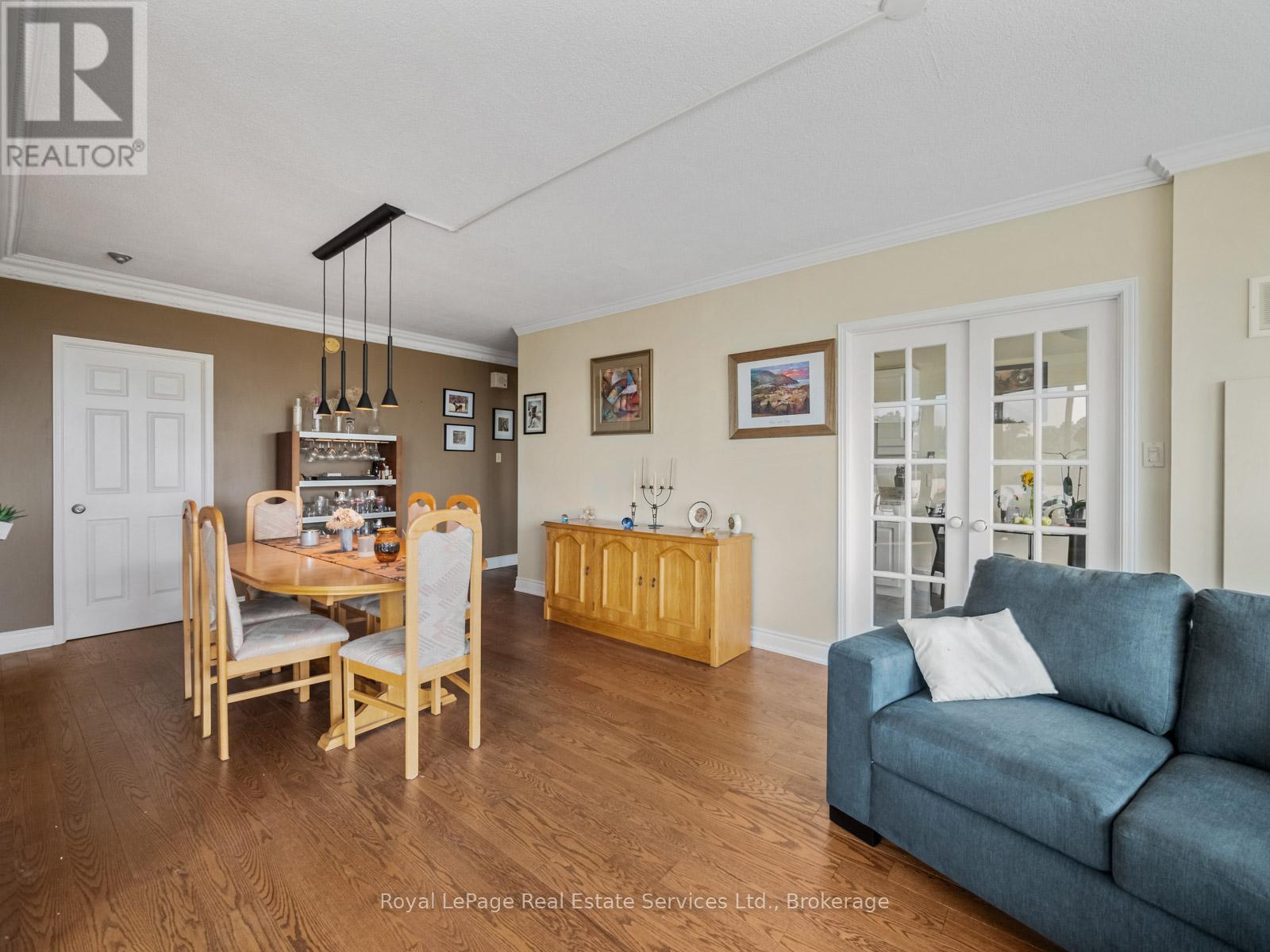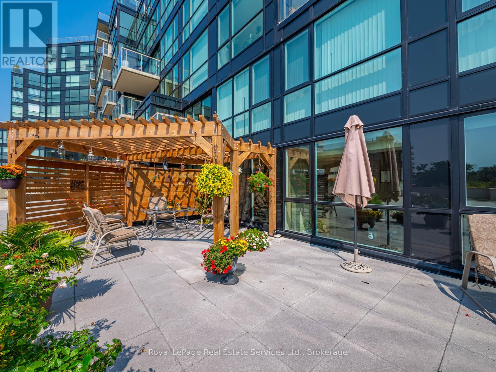 $1,872.55 MonthlyWelcome to the luxurious Harbourview Residences in prime downtown Burlington with spectacular views of Lake Ontario! This stunning 2+1 bedroom, 2+1 bath condo offers 1541SF of beautifully updated living space, perfectly complemented by an incredible 1200+SF wrap-around private terrace overlooking Lake Ontario and Spencer Smith Park. Bright and spacious, the south-facing corner unit is surrounded by floor-to-ceiling, wall-to-wall windows, flooding the home with natural light and offering breathtaking, unobstructed lake views. Both generously sized bedrooms feature en suite bathrooms and walkouts to the expansive terrace. The perfect spot for morning coffee or evening relaxation. The primary suite also boasts a large walk-in closet and hardwood floors throughout. An additional den provides flexible space for a home office, guest room, or reading nook. The living and dining room flow seamlessly, while the stylish eat in kitchen with updated floors and stone countertops, top this unit off with another walkout to the incredible lake view. Experience the ultimate in waterfront luxury, surrounded by Burlington's vibrant downtown shops, restaurants, and walking trails. Don't miss! (id:24334)