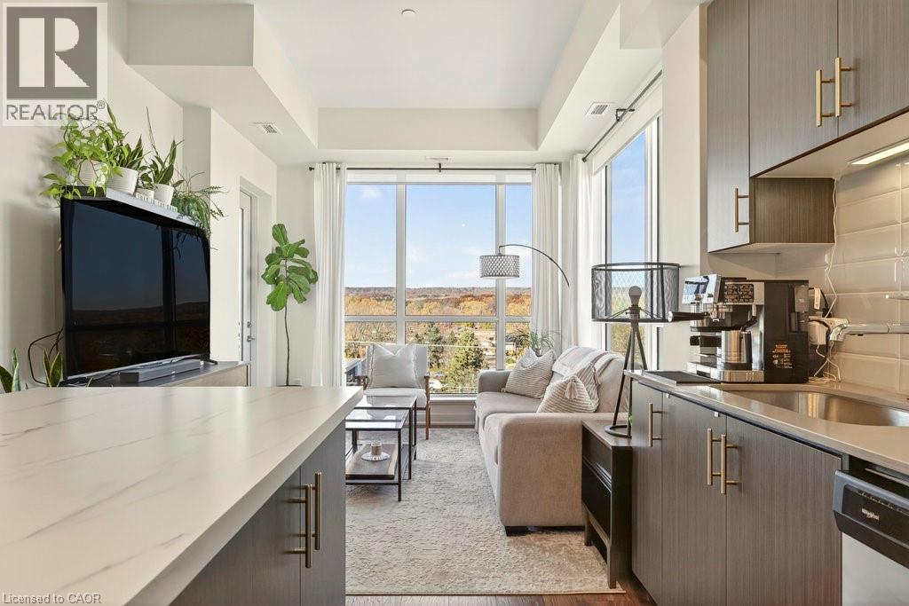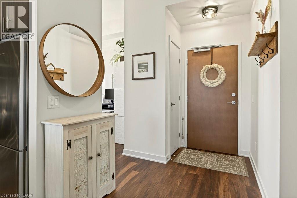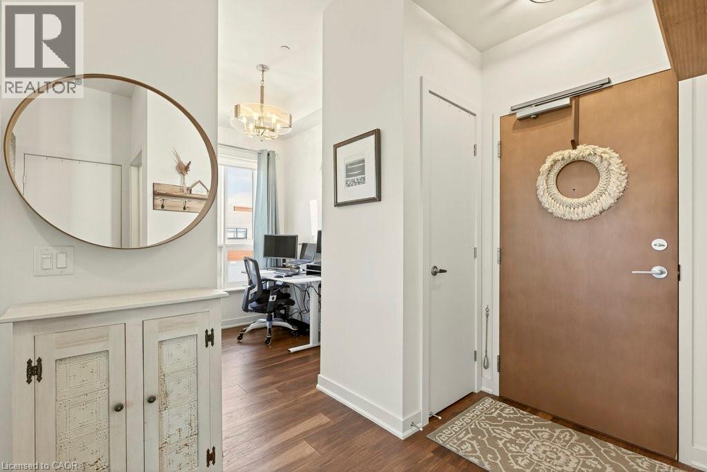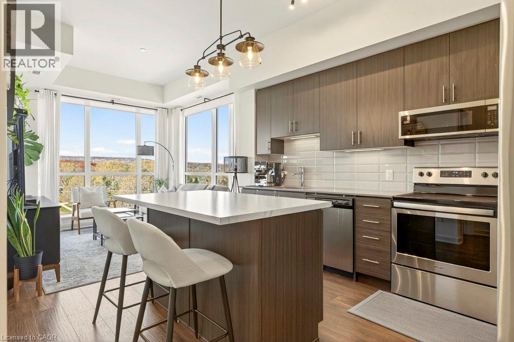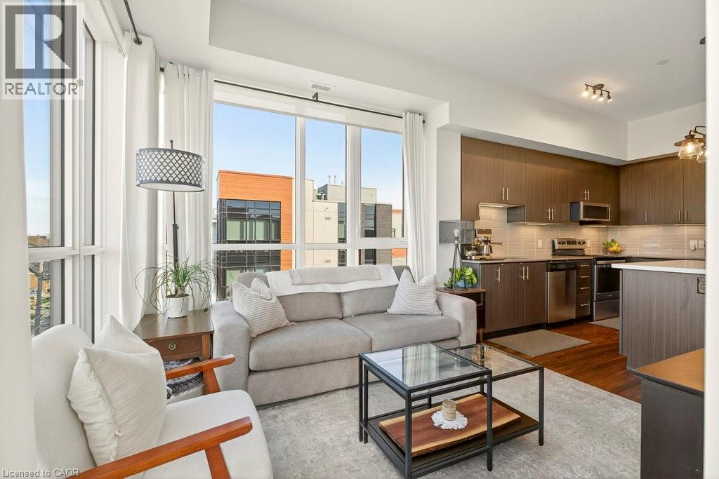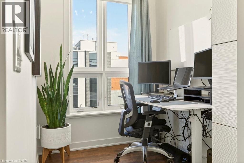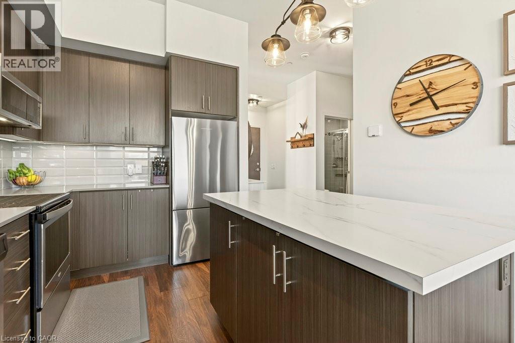 $596.46 MonthlyUnique opportunity to own a gorgeous one bedroom + den top floor corner suite at sought-after Affinity in Aldershot! Floor to ceiling windows with stunning views of the escarpment and beyond! Upgraded kitchen with stainless steel appliances, quartz countertop, island, subway tile backsplash and under-cabinet lighting. Open and extremely bright living space with 10' ceilings, upgraded wide plank flooring, upgraded lighting, in-suite laundry, 3-piece bathroom, walkout to a private balcony and a cozy den perfect for a home office. The spacious bedroom features a second walkout to the balcony and a large closet with built-ins and motion sensor lighting. Just steps to the GO station, RBG, marina, library, schools and Burlington Golf & Country Club. One underground parking space and one storage locker on unit level. Building amenities include an electric car charging station, rooftop terrace with BBQs, gym, yoga room, party room and loads of visitor parking! (id:24334)