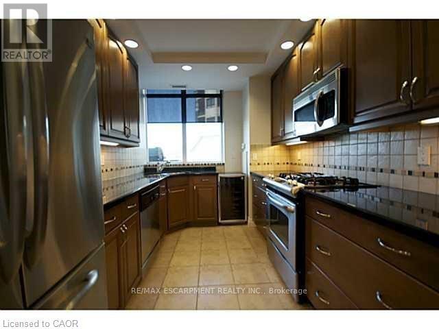 Welcome to luxury lakeside living in the heart of downtown Burlington. This rarely offered 1,369 sq. ft. corner suite features 2 bedrooms and 2 bathrooms, showcasing stunning southwest lake views through expansive floor-to-ceiling windows. Enjoy seamless indoor-outdoor living with an impressive 340 sq. ft. private terrace complete with your own BBQ area - perfect for entertaining or relaxing while taking in the views. The upgraded galley kitchen is beautifully appointed with granite countertops and a large window, filling the space with natural light. The spacious primary bedroom offers a walk-in closet and a private ensuite. A generous second bedroom and full bath provide comfort and flexibility for guests or a home office. Additional features include: Two side-by-side underground parking spaces, one storage locker, Concierge, fitness centre, sauna, party room, theatre room, spectacular rooftop terrace with lake views. Located just steps to shops, restaurants, theatre, and Spencer Smith Park waterfront, this exceptional suite offers the ultimate downtown lifestyle. Don't miss this opportunity to live in one of Burlington's most sought-after buildings. (id:24334)