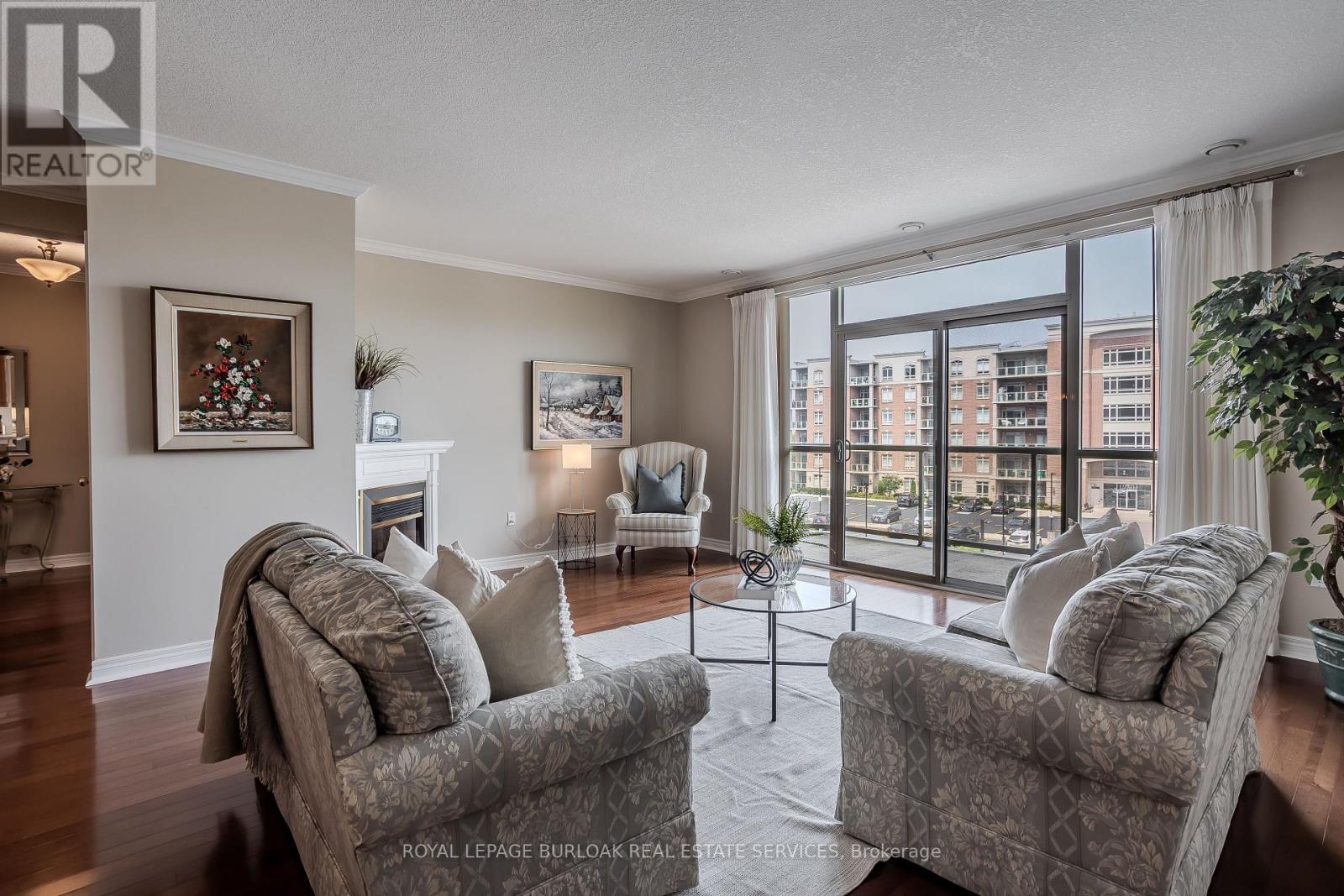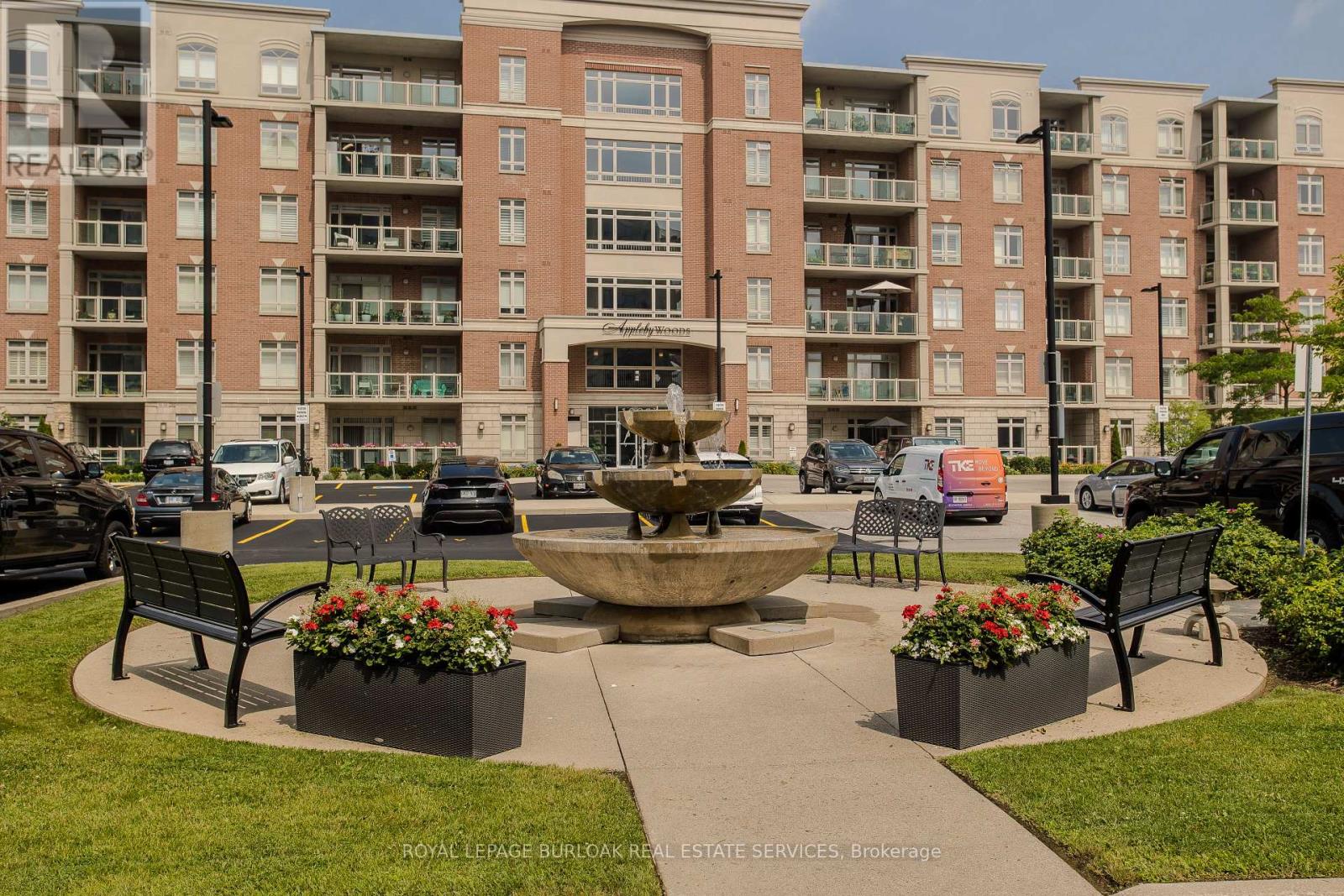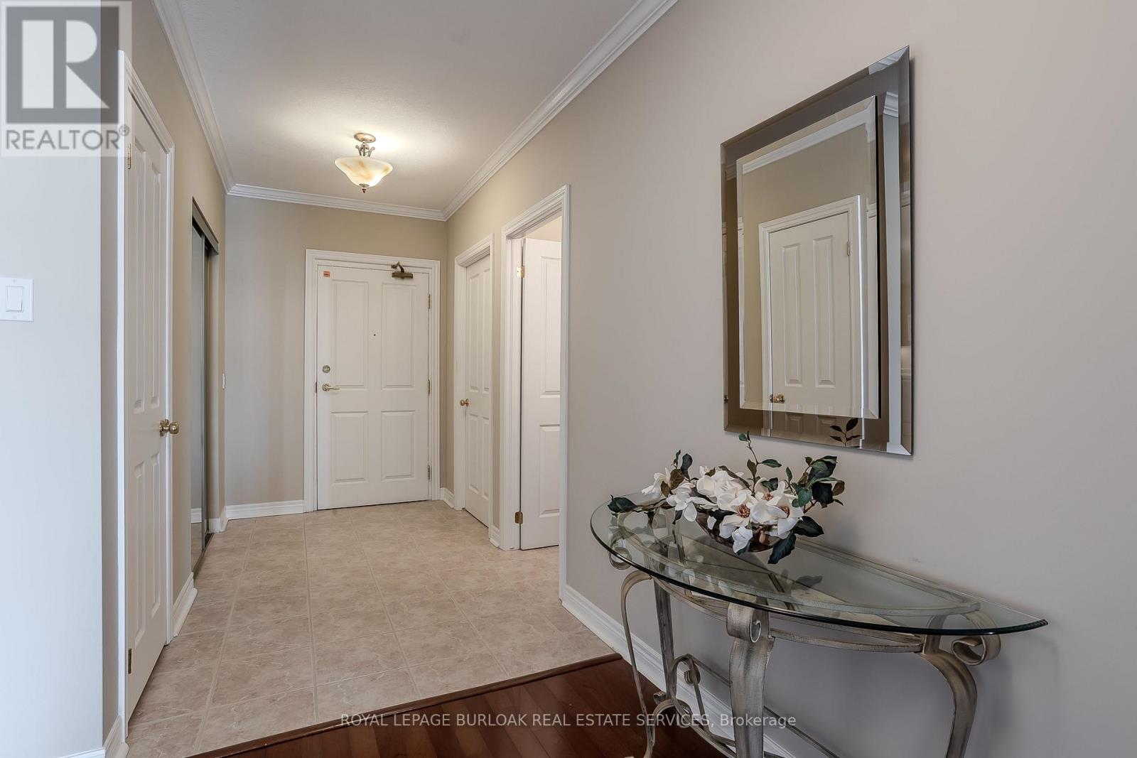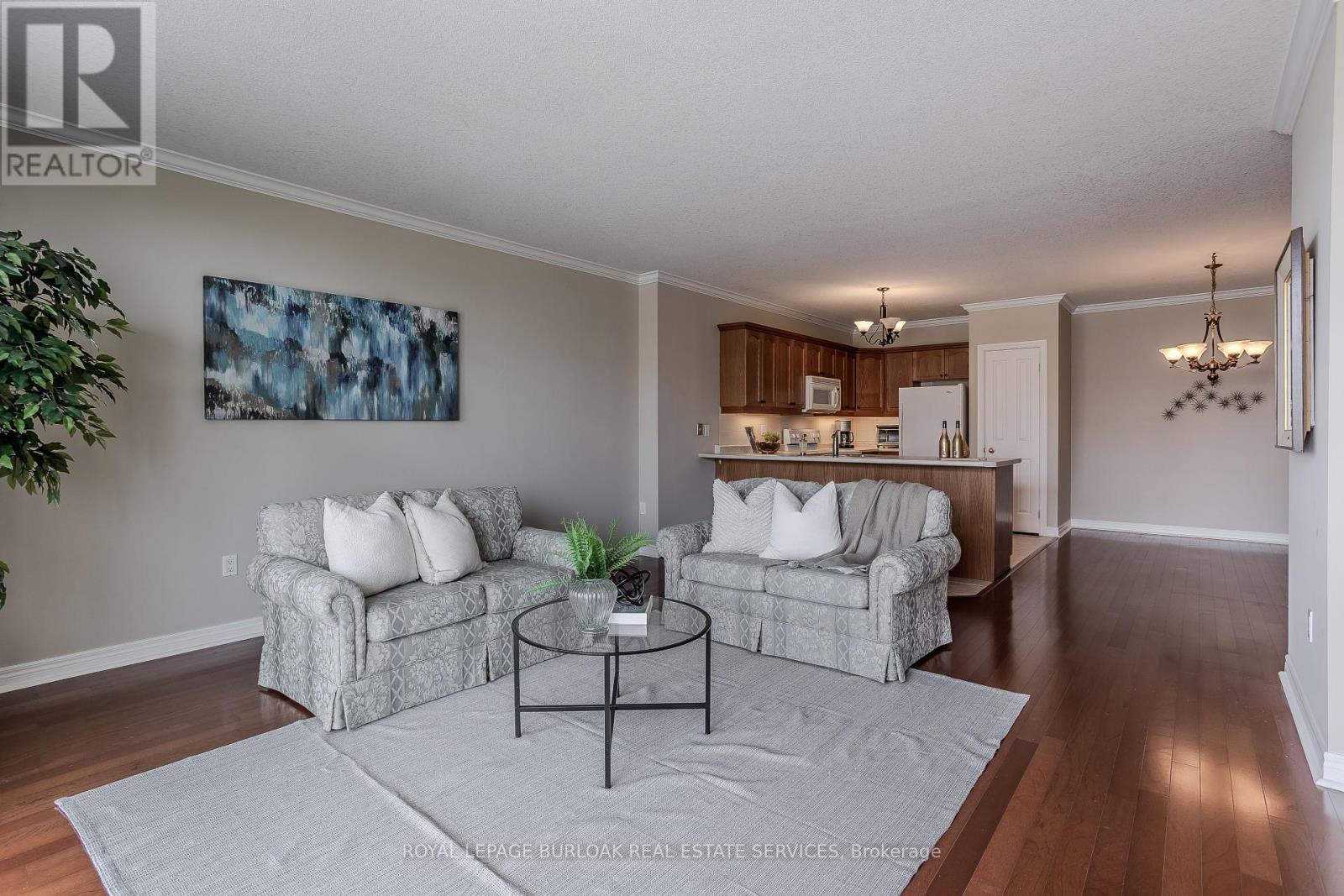 Welcome to Millcroft Place where thoughtful design meets carefree living in the heart of Uptown Burlington. This sought-after residence is ideal for those looking to downsize without compromise, offering a spacious layout, elegant finishes, and a vibrant community. You'll enjoy the ease of a low-maintenance lifestyle with shopping, dining, transit, parks, and trails all within walking distance. From the moment you walk in, you'll appreciate the crown moulding throughout, warm hardwood flooring in the main living areas, and oversized windows that flood the space with natural light. The kitchen is as functional as it is welcoming, with a peninsula breakfast bar, classic tile backsplash, ample cabinetry, and a pantry for all your essentials. Whether you're hosting dinner or enjoying a quiet meal at home, the full-sized dining area offers the flexibility and space to suit your lifestyle. The living room is expansive and inviting, anchored by a cozy gas fireplace that adds warmth and charm to the space. Walk out onto the large, private balcony with sleek glass railing perfect for relaxing with your morning coffee, tending to a container garden, or watching the sunset in peace. The primary bedroom is a true retreat with a large window, walk-in closet, and private 3-piece ensuite featuring a sleek glass shower. A second bedroom provides space for guests, a home office, or hobbies, while the 4-piece main bathroom offers a quartz-topped vanity and modern finishes. Additional conveniences include in-suite laundry, one underground parking space, and a private storage locker. Enjoy a friendly, well-maintained building with top-tier amenities including an exercise centre, party room, beautifully appointed indoor and outdoor seating areas, and ample visitor parking. All of this just steps from shopping, dining, transit, and Millcroft's scenic parks and trails. This is downsizing done right. Welcome home. (id:24334)