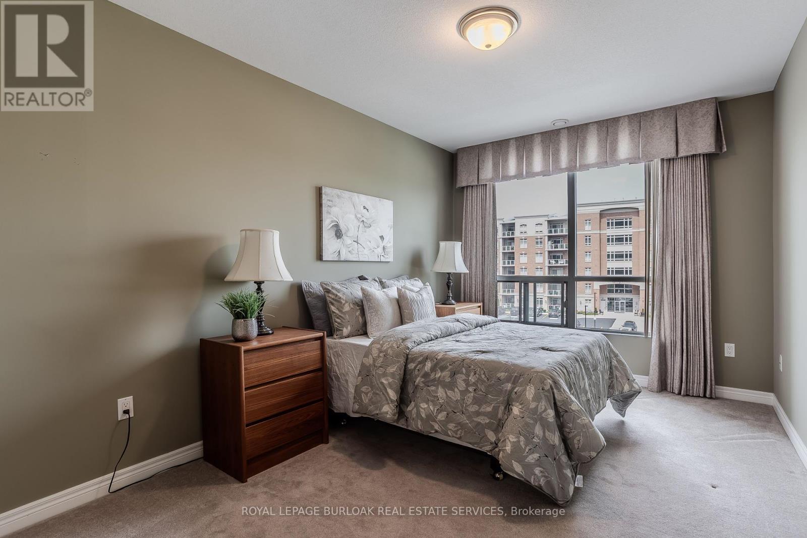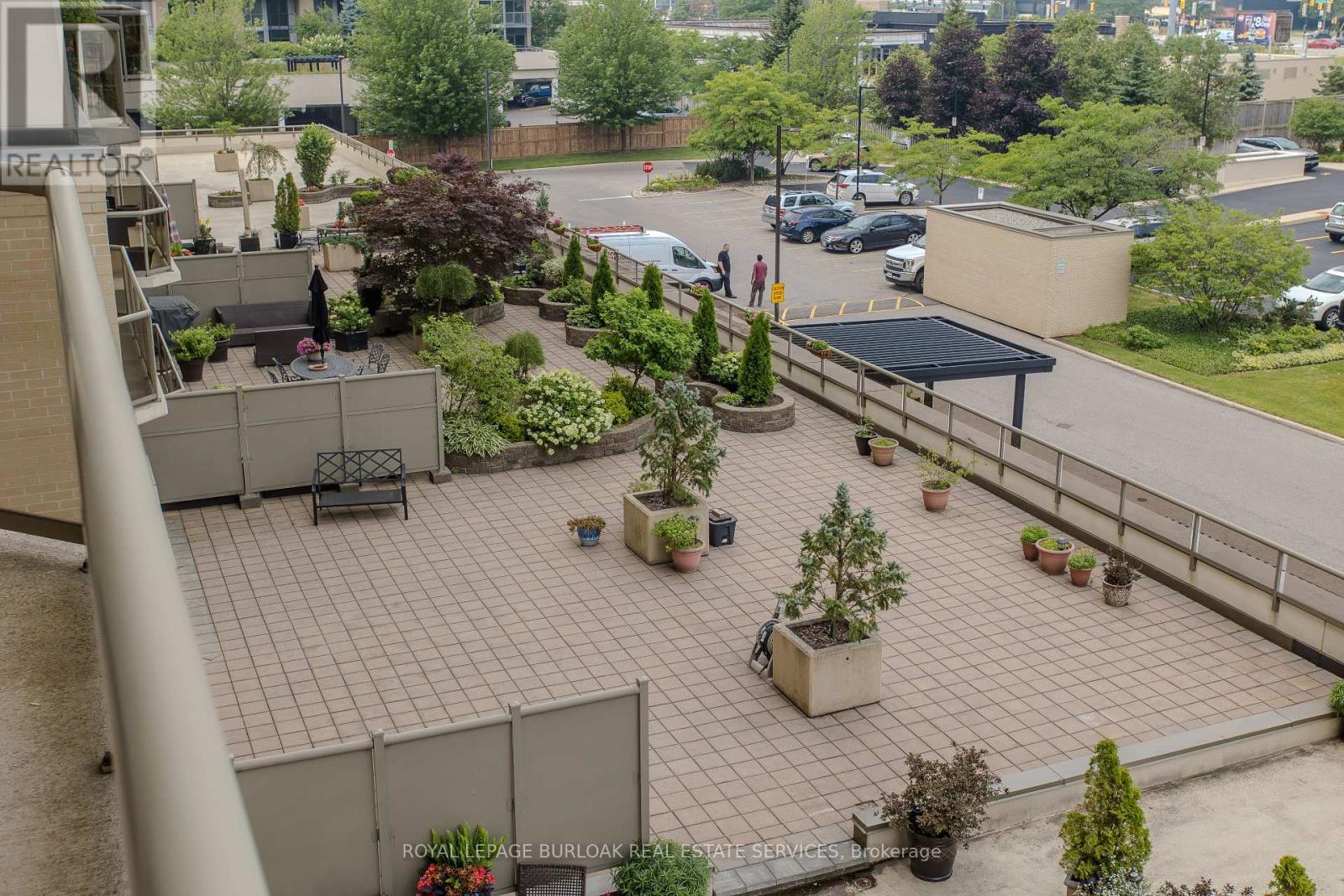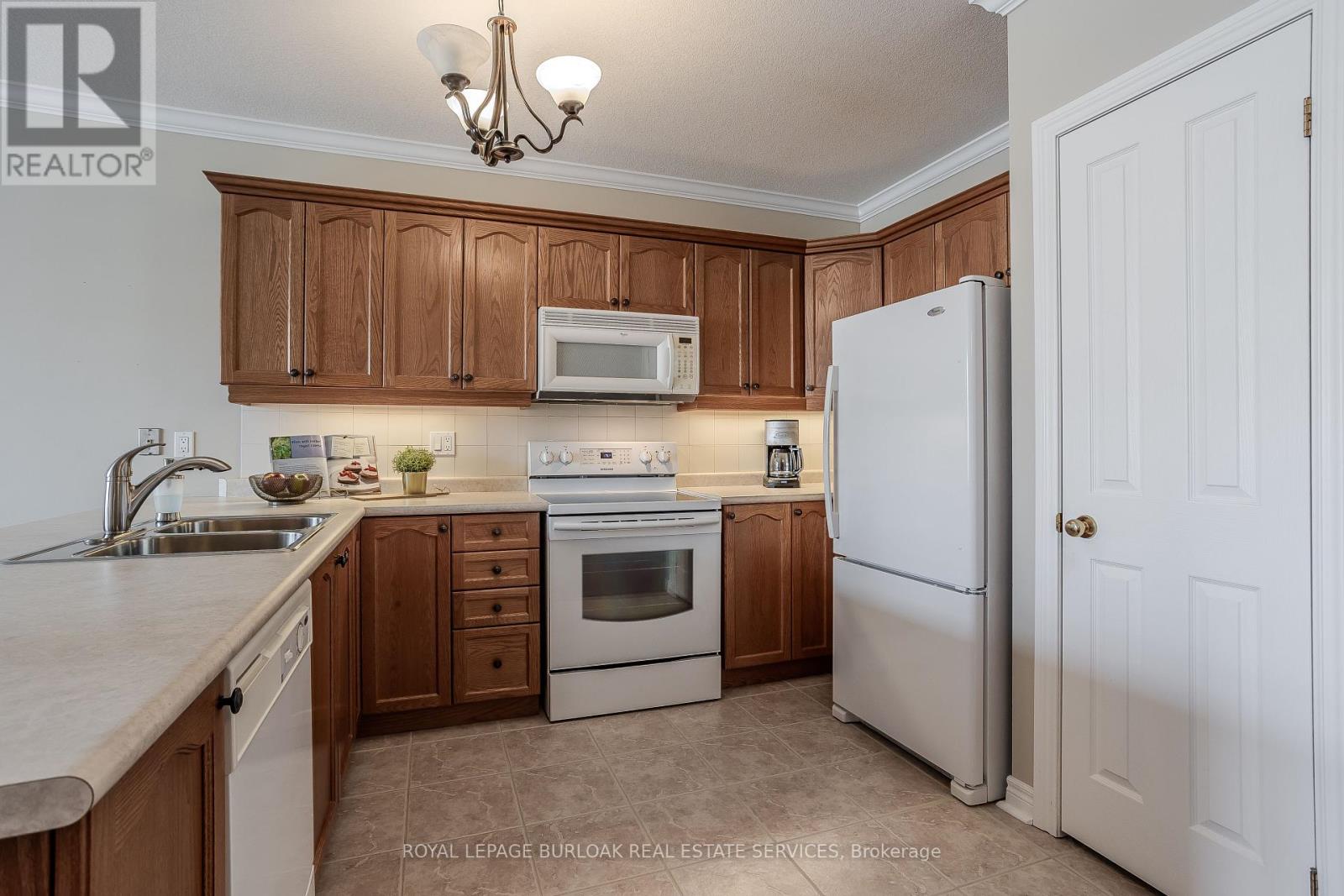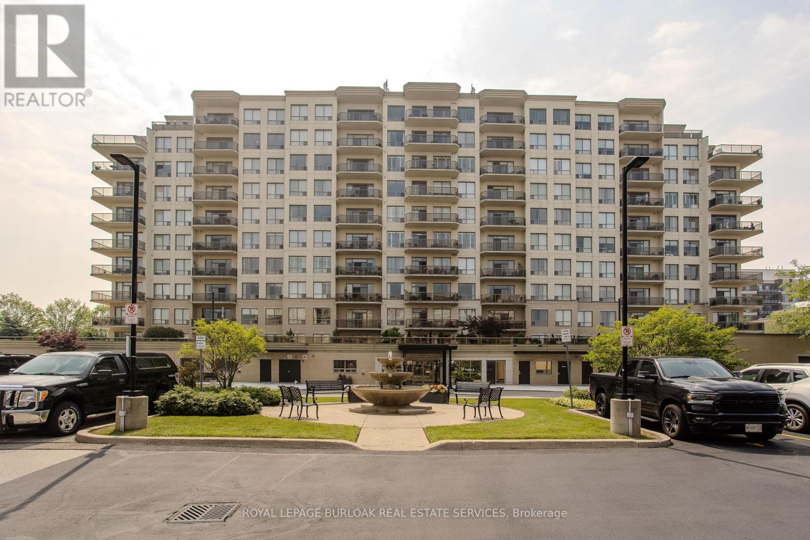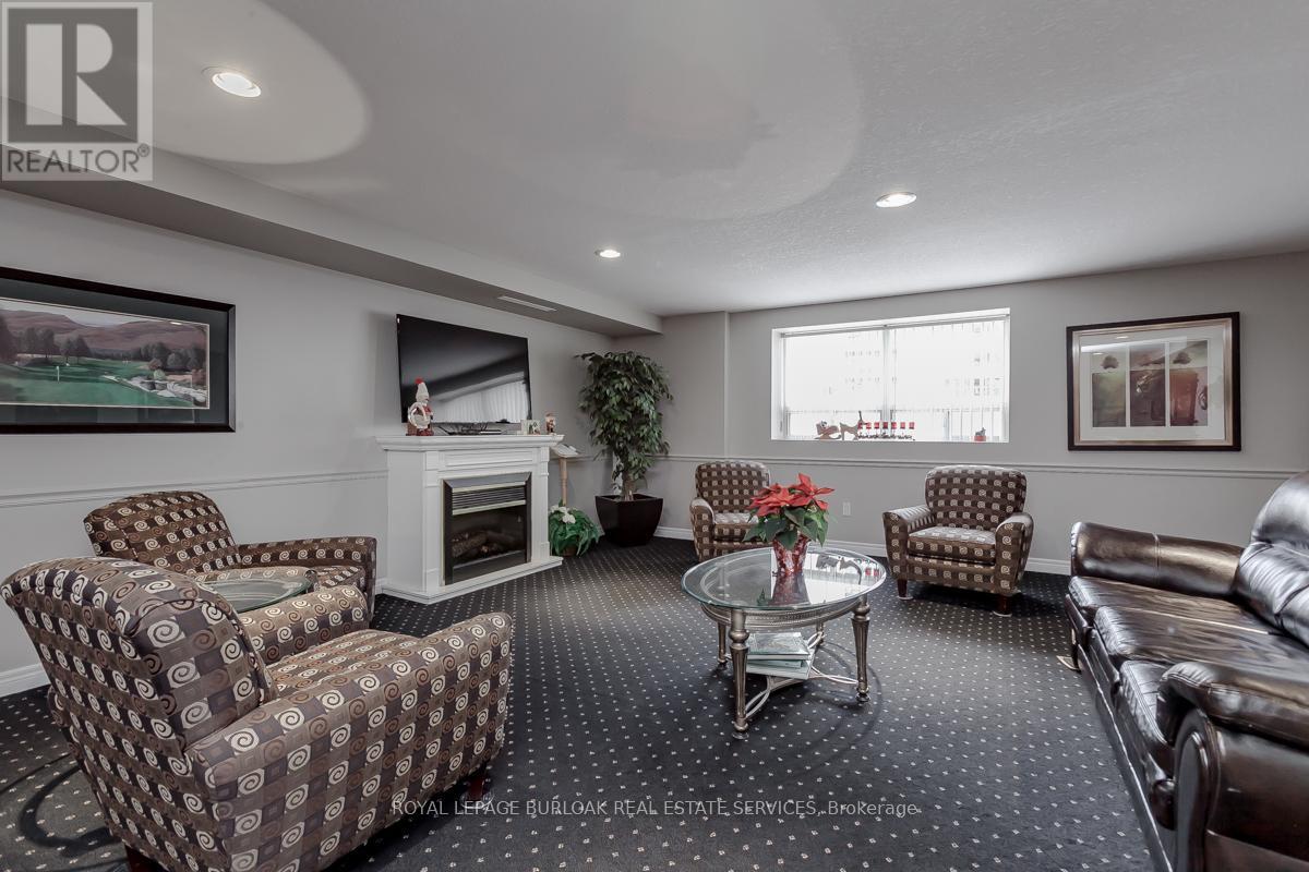 Welcome to Millcroft Place where thoughtful design meets carefree living in the heart of Uptown Burlington. This sought-after residence is ideal for those looking to downsize without compromise, offering a spacious layout, elegant finishes, and a vibrant community. You'll enjoy the ease of a low-maintenance lifestyle with shopping, dining, transit, parks, and trails all within walking distance. From the moment you walk in, you'll appreciate the crown moulding throughout, warm hardwood flooring in the main living areas, and oversized windows that flood the space with natural light. The kitchen is as functional as it is welcoming, with a peninsula breakfast bar, classic tile backsplash, ample cabinetry, and a pantry for all your essentials. Whether you're hosting dinner or enjoying a quiet meal at home, the full-sized dining area offers the flexibility and space to suit your lifestyle. The living room is expansive and inviting, anchored by a cozy gas fireplace that adds warmth and charm to the space. Walk out onto the large, private balcony with sleek glass railing perfect for relaxing with your morning coffee, tending to a container garden, or watching the sunset in peace. The primary bedroom is a true retreat with a large window, walk-in closet, and private 3-piece ensuite featuring a sleek glass shower. A second bedroom provides space for guests, a home office, or hobbies, while the 4-piece main bathroom offers a quartz-topped vanity and modern finishes. Additional conveniences include in-suite laundry, one underground parking space, and a private storage locker. Enjoy a friendly, well-maintained building with top-tier amenities including an exercise centre, party room, beautifully appointed indoor and outdoor seating areas, and ample visitor parking. All of this just steps from shopping, dining, transit, and Millcroft's scenic parks and trails. This is downsizing done right. Welcome home. (id:24334)