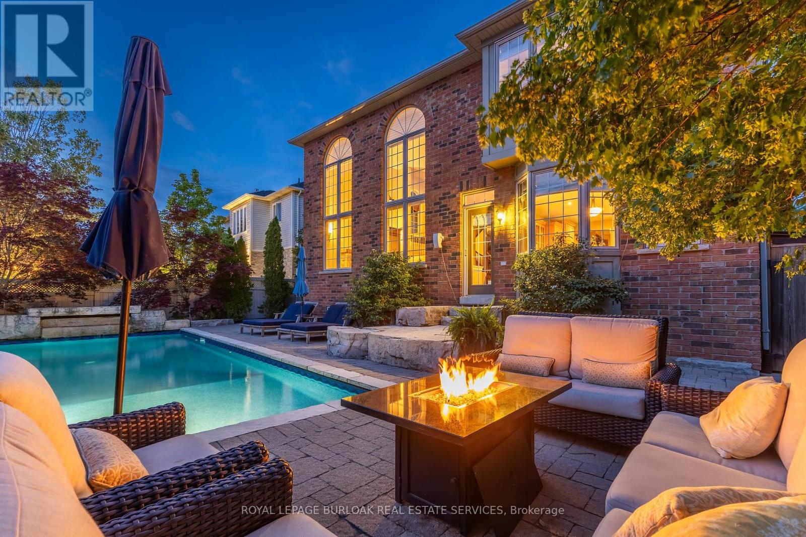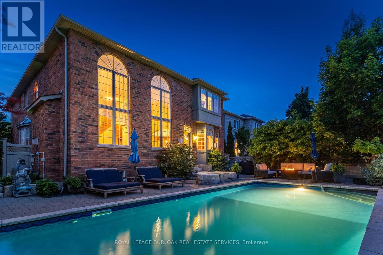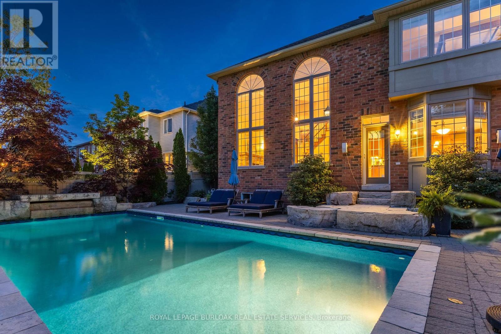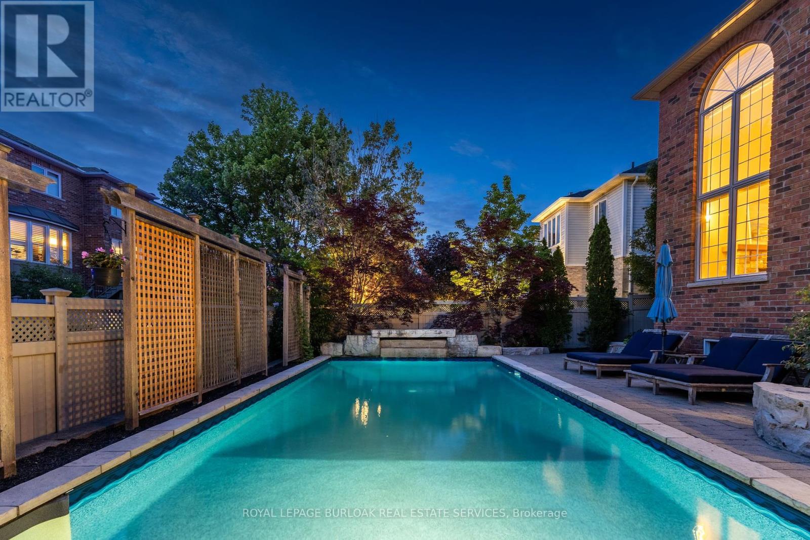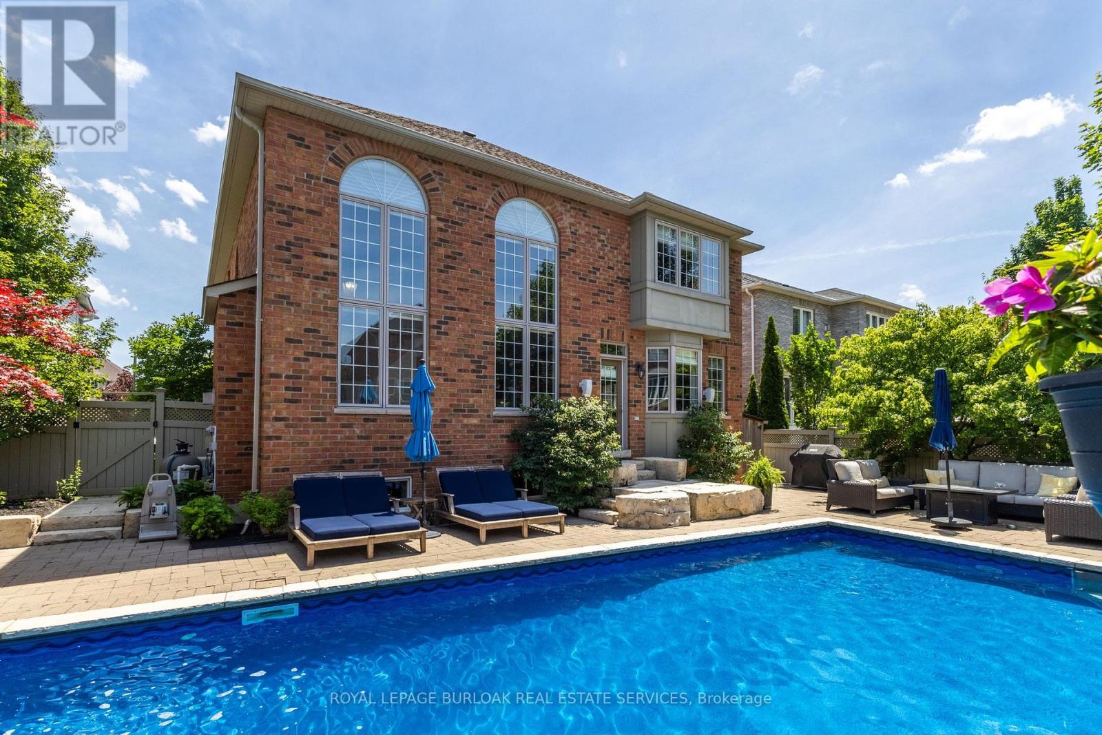 Exceptional 2-storey home with over 4,900 sq ft of carpet-free, finished living space, showcasing thoughtful design and meticulous attention to detail. Impressive stone and brick exterior, interlocking double driveway, patios, and elegant light scaping. Curb appeal is outstanding. Welcoming two-storey foyer flooded with natural light, leading to a spacious and open main floor layout. Elegant living room features a gas fireplace and crown moulding, while the formal dining room accommodates large gatherings ideal for entertaining. Grand staircase with Juliet balcony overlooks the impressive two-storey family room, with Palladian windows and a gas fireplace. The gourmet kitchen is a chefs dream, featuring a large island, granite countertops, marble backsplash, gas cooktop, double wall ovens, wine fridge, and abundant cabinetry. The bright breakfast area, with bay window and built-in bench seating, offers views of the private backyard patio. A main floor office with custom built-ins, powder room, and laundry room with garage access complete the level. A second staircase off the kitchen adds convenience and ease of flow. Upstairs, the luxurious principal suite includes a 5-piece ensuite with dual vanities, a soaker tub, separate shower, and a large walk-in closet. The second bedroom features a 4-piece ensuite. Third and fourth bedrooms share a convenient Jack-and-Jill bathroom. Bright, spacious, fully finished lower level has oversized windows, a large rec room with fireplace, fifth bedroom with ensuite privilege to a 4-piece bath, an exercise room, and a utility/storage area. Private backyard oasis with heated saltwater inground pool and water feature includes a new liner and heater. Expansive patio offers both a lounging area and a cozy sitting area. Located on a quiet crescent, this exceptional home is just minutes from top-rated schools, parks, trails, shopping, dining, and access to Hwy 407. Truly a rare find in one of Burlington's most desirable neighbourhoods. (id:24334)