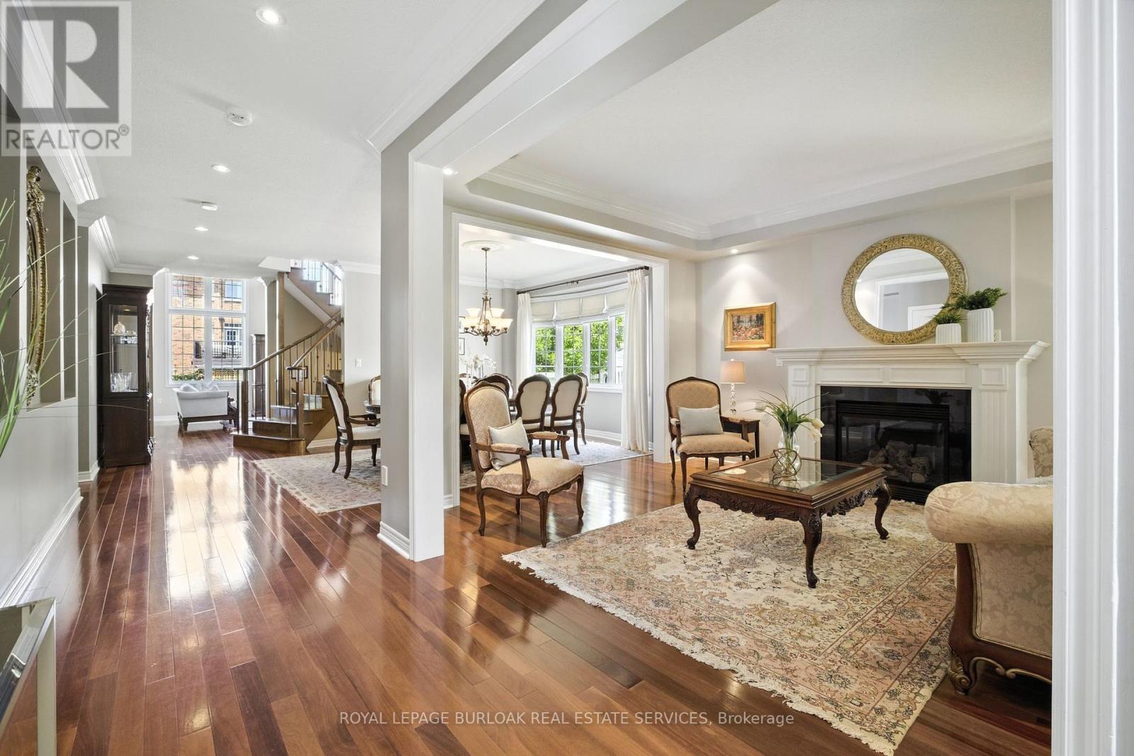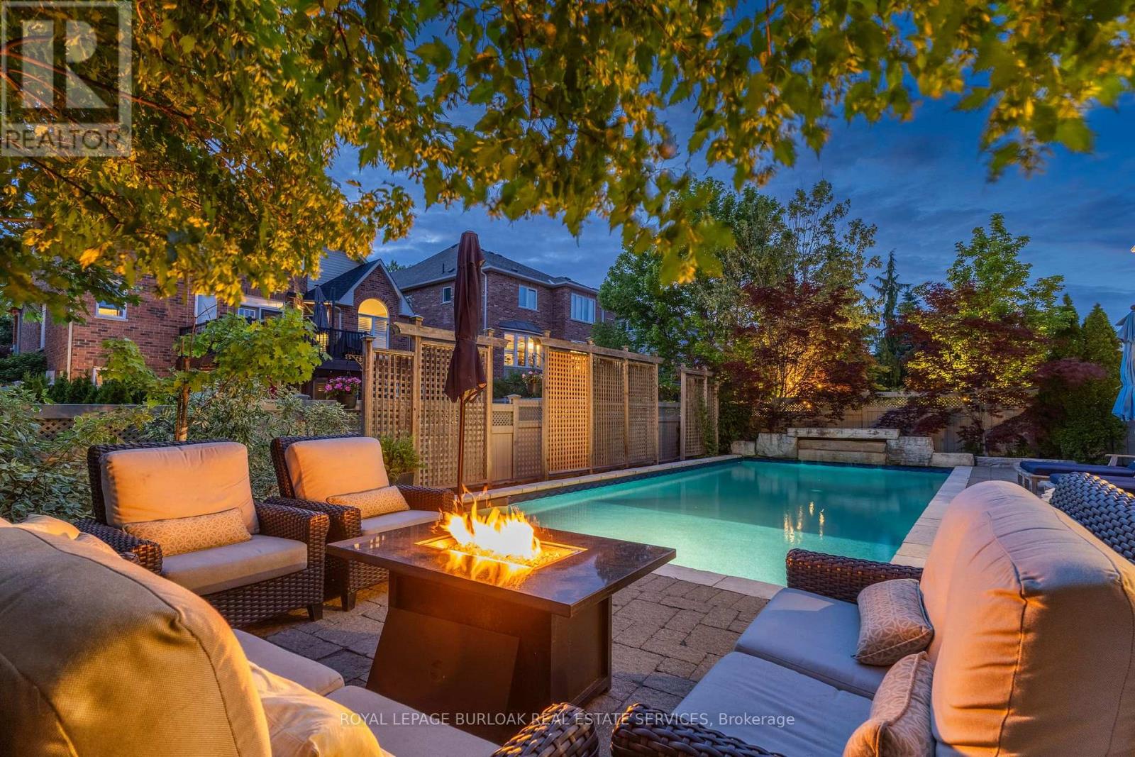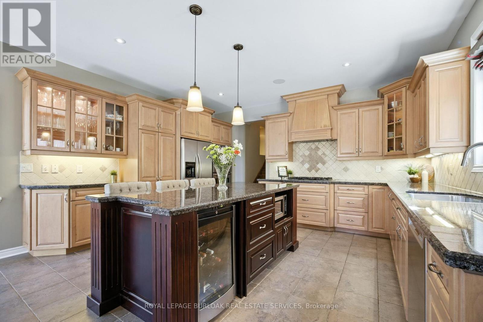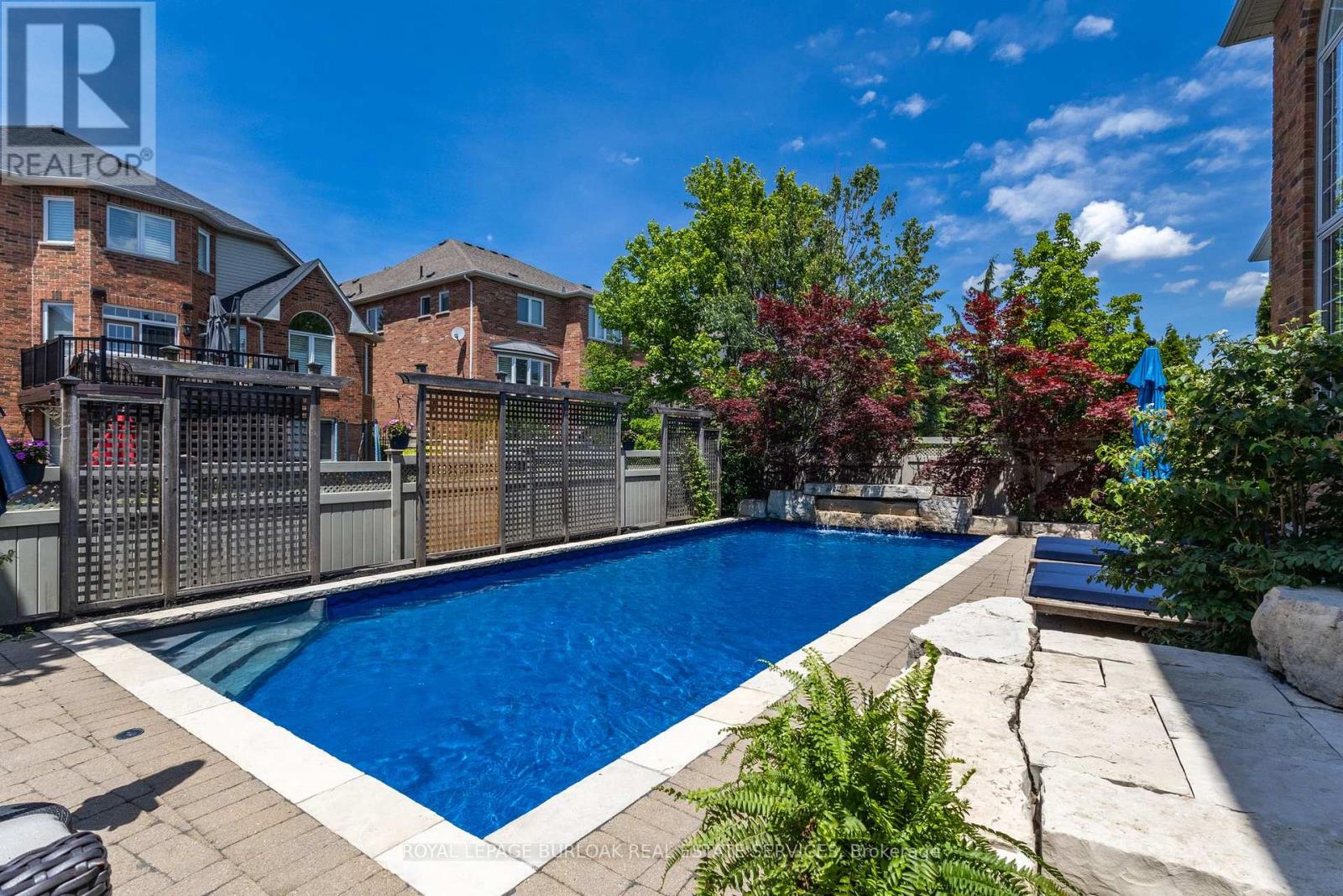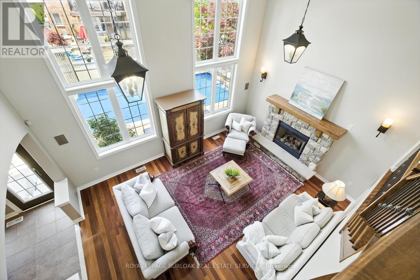Exceptional 2-storey home with over 4,900 sq ft of carpet-free, finished living space, showcasing thoughtful design and meticulous attention to detail. Impressive stone and brick exterior, interlocking double driveway, patios, and elegant light scaping. Curb appeal is outstanding. Welcoming two-storey foyer flooded with natural light, leading to a spacious and open main floor layout. Elegant living room features a gas fireplace and crown moulding, while the formal dining room accommodates large gatherings ideal for entertaining. Grand staircase with Juliet balcony overlooks the impressive two-storey family room, with Palladian windows and a gas fireplace. The gourmet kitchen is a chefs dream, featuring a large island, granite countertops, marble backsplash, gas cooktop, double wall ovens, wine fridge, and abundant cabinetry. The bright breakfast area, with bay window and built-in bench seating, offers views of the private backyard patio. A main floor office with custom built-ins, powder room, and laundry room with garage access complete the level. A second staircase off the kitchen adds convenience and ease of flow. Upstairs, the luxurious principal suite includes a 5-piece ensuite with dual vanities, a soaker tub, separate shower, and a large walk-in closet. The second bedroom features a 4-piece ensuite. Third and fourth bedrooms share a convenient Jack-and-Jill bathroom. Bright, spacious, fully finished lower level has oversized windows, a large rec room with fireplace, fifth bedroom with ensuite privilege to a 4-piece bath, an exercise room, and a utility/storage area. Private backyard oasis with heated saltwater inground pool and water feature includes a new liner and heater. Expansive patio offers both a lounging area and a cozy sitting area. Located on a quiet crescent, this exceptional home is just minutes from top-rated schools, parks, trails, shopping, dining, and access to Hwy 407. Truly a rare find in one of Burlington's most desirable neighbourhoods. (id:24334)
