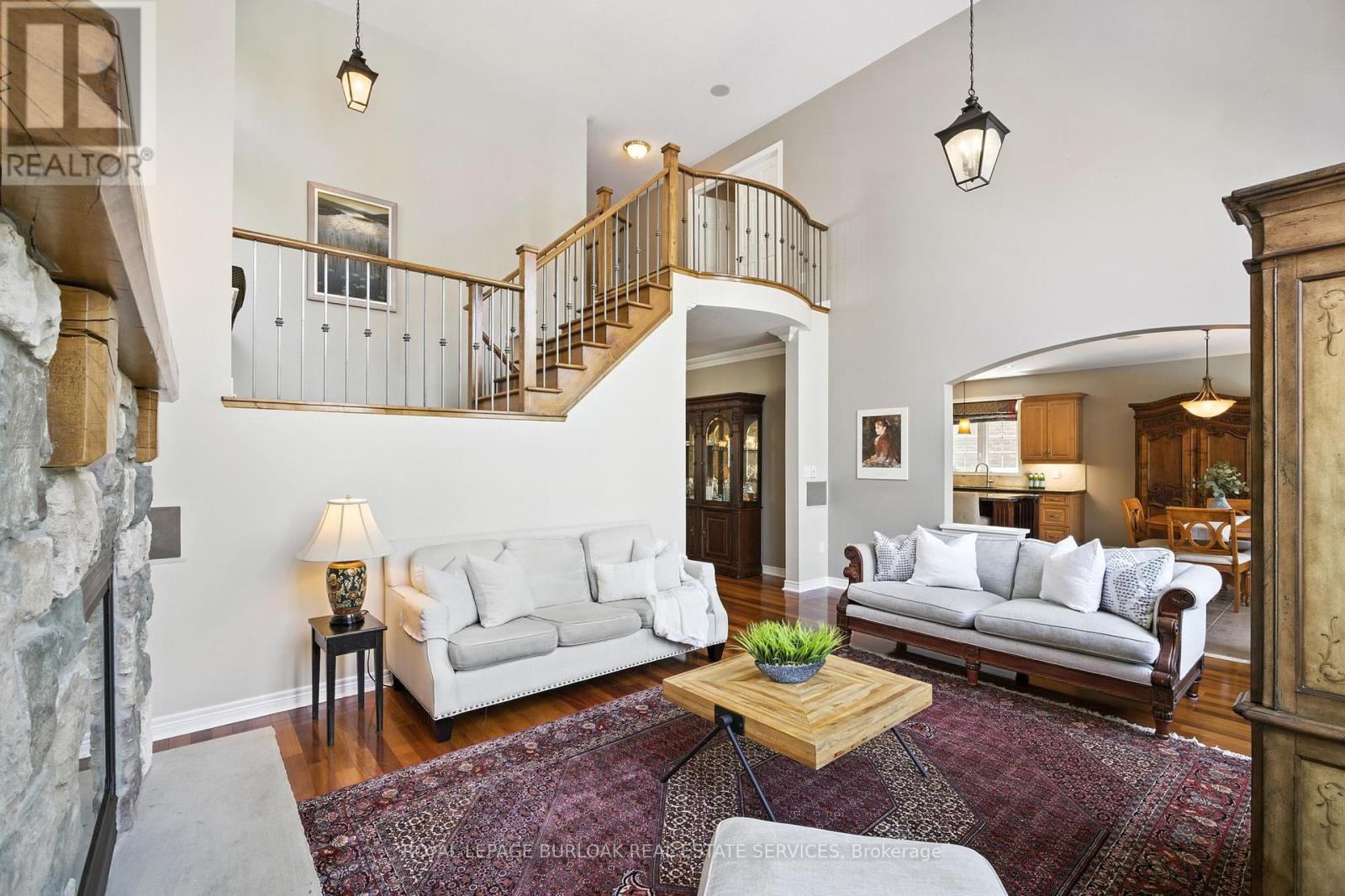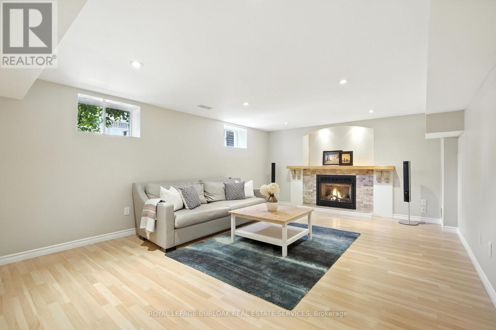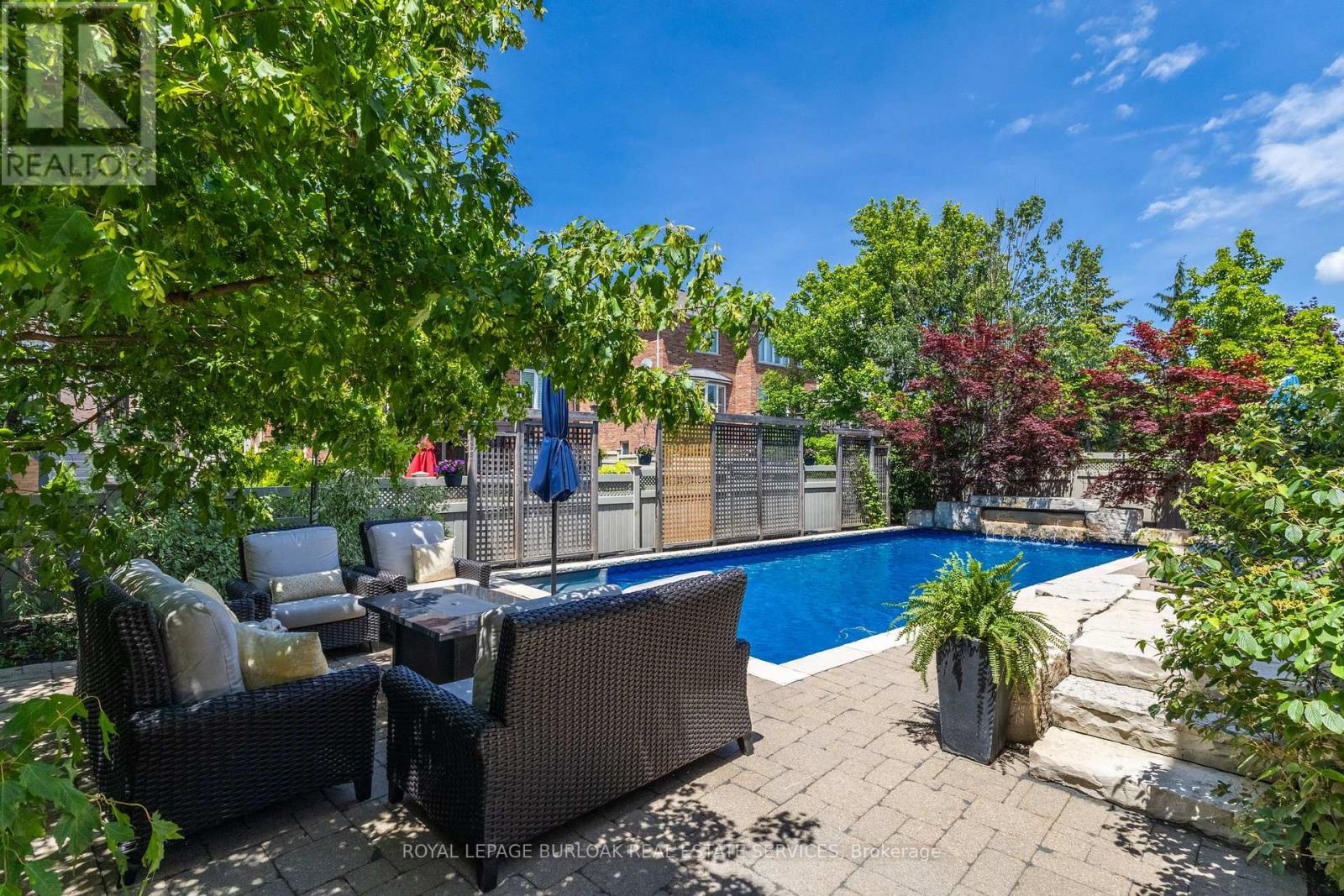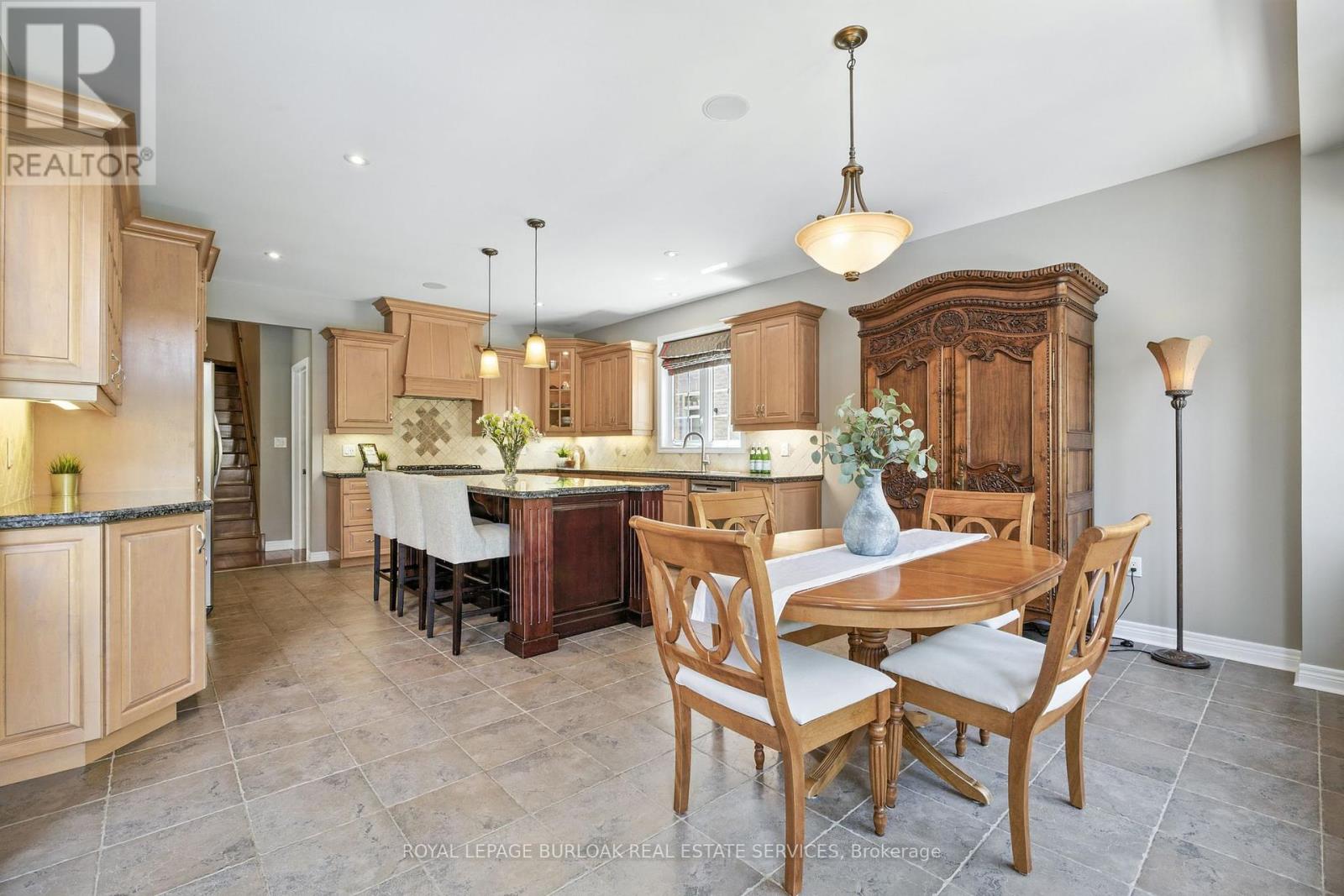 Exceptional 2-storey home with over 4,900 sq ft of carpet-free, finished living space, showcasing thoughtful design and meticulous attention to detail. Impressive stone and brick exterior, interlocking double driveway, patios, and elegant light scaping. Curb appeal is outstanding. Welcoming two-storey foyer flooded with natural light, leading to a spacious and open main floor layout. Elegant living room features a gas fireplace and crown moulding, while the formal dining room accommodates large gatherings ideal for entertaining. Grand staircase with Juliet balcony overlooks the impressive two-storey family room, with Palladian windows and a gas fireplace. The gourmet kitchen is a chefs dream, featuring a large island, granite countertops, marble backsplash, gas cooktop, double wall ovens, wine fridge, and abundant cabinetry. The bright breakfast area, with bay window and built-in bench seating, offers views of the private backyard patio. A main floor office with custom built-ins, powder room, and laundry room with garage access complete the level. A second staircase off the kitchen adds convenience and ease of flow. Upstairs, the luxurious principal suite includes a 5-piece ensuite with dual vanities, a soaker tub, separate shower, and a large walk-in closet. The second bedroom features a 4-piece ensuite. Third and fourth bedrooms share a convenient Jack-and-Jill bathroom. Bright, spacious, fully finished lower level has oversized windows, a large rec room with fireplace, fifth bedroom with ensuite privilege to a 4-piece bath, an exercise room, and a utility/storage area. Private backyard oasis with heated saltwater inground pool and water feature includes a new liner and heater. Expansive patio offers both a lounging area and a cozy sitting area. Located on a quiet crescent, this exceptional home is just minutes from top-rated schools, parks, trails, shopping, dining, and access to Hwy 407. Truly a rare find in one of Burlington's most desirable neighbourhoods. (id:24334)