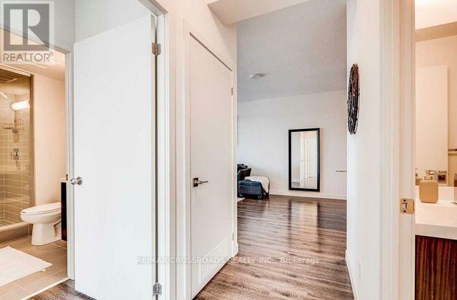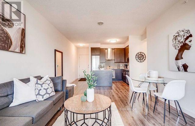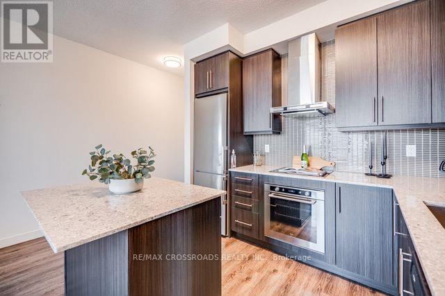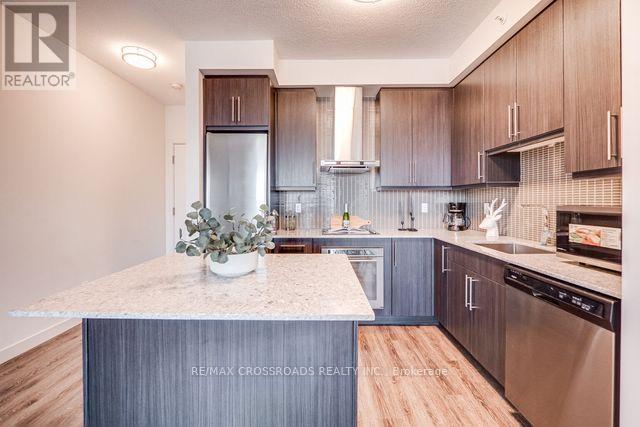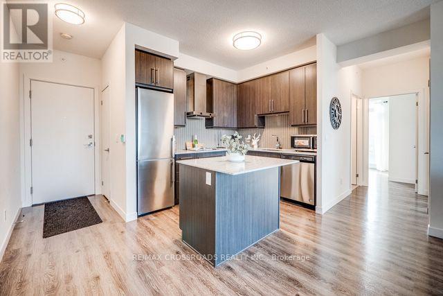 Welcome to luxury living at Paradigm Condos Burlington most sought-after address! This exceptional 2-bedroom, 2-bath suite offers over 800 sqft of stylish, open-concept living with 9 ceilings, floor-to-ceiling windows, and sleek vinyl plank flooring throughout. Enjoy a gourmet kitchen featuring stainless steel appliances, white quartz countertops, a glass tile backsplash, and a large central island perfect for entertaining or casual dining. The spacious bedrooms, in-suite laundry, and private balcony add to the comfort and convenience. Located in the heart of Midtown Burlington, just steps to the GO Station, Walmart, restaurants, and a short drive to Lake Ontario. Includes 1 underground parking space and 1 locker. A rare opportunity in a family-friendly, award-winning development! **The photos were taken while the property was staged** (id:24334)