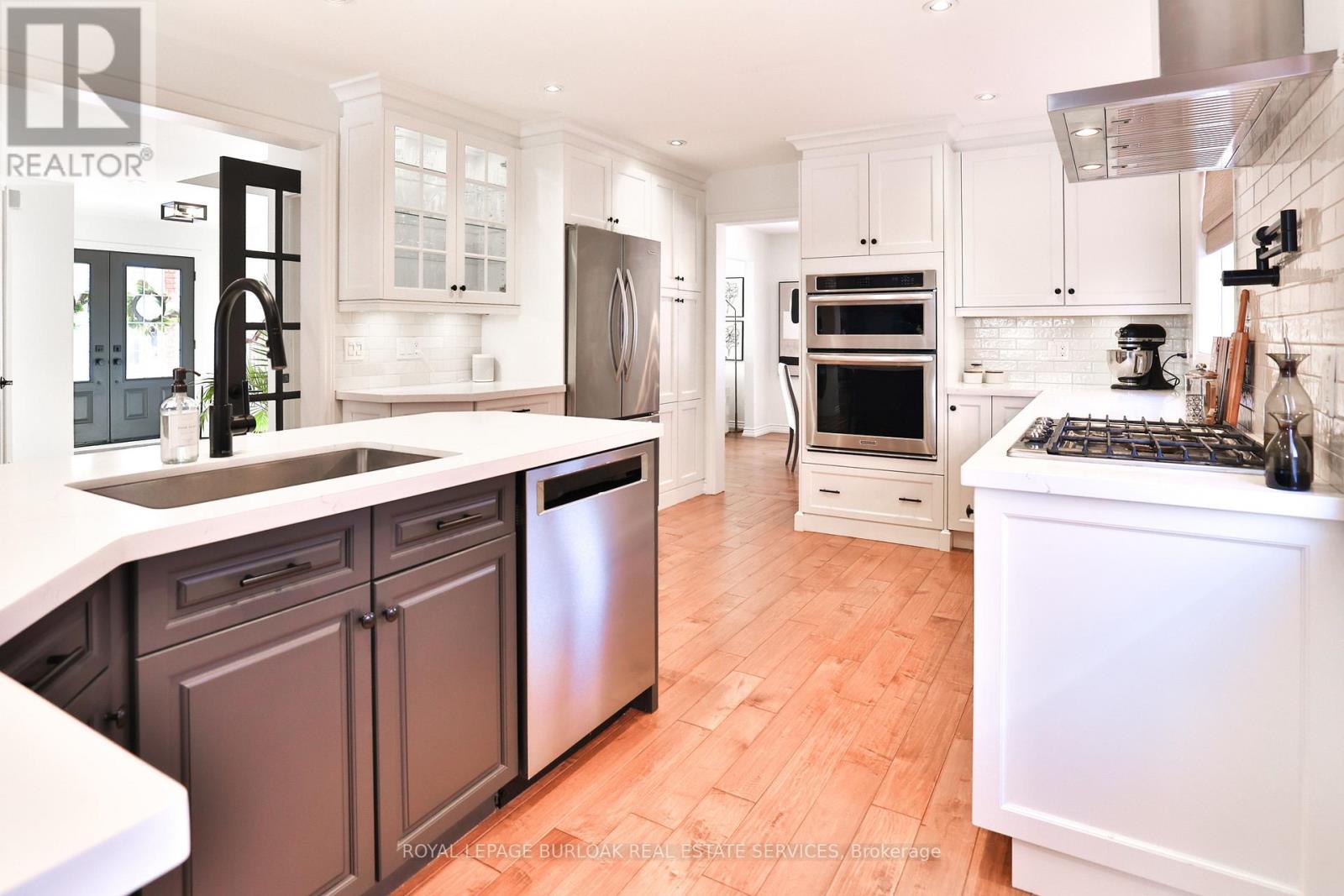Welcome to a must-see fully upgraded home siding onto a quiet, family-friendly court in one of Dynes' most sought-after neighbourhoods within the Tuck Nelson school district and just mins to DT Burlington & Oakville. Offering an exceptional blend of luxury and timeless charm, this residence delivers 3,927sf of living space and an in-ground pool designed for comfort & entertaining. Upon arrival, the home impresses w/ manicured landscaping, & an interlock walkway. Inside, find hardwood floors throughout and a functional layout ideal for family living. A spacious living room w/ a large picture window invites quiet mornings, while the dining room shines w/ designer lighting. At the heart of the home, the chef's kitchen is both stunning & practical-complete w/ quartz countertops, subway tile backsplash, SS appliances, wall oven, gas range w/ pot filler & hood, custom cabinetry, valence lighting, coffee bar, beverage fridge, walk-in pantry & an oversized island w/ breakfast bar. Walkouts from both the kitchen & family room create seamless indoor-outdoor flow. The family room is warm and inviting w/ a rustic stone gas fireplace, wood mantle, & custom built-ins-perfect for movie nights. A stylish powder room and home office complete this level. Upstairs, the expansive primary retreat features a walk-in closet, wall-to-wall built-in wardrobe, and a spa-inspired ensuite w/ dual vanity & oversized glass shower w/ bench. 3 additional bedrooms & a beautifully finished 5pc main bath provide ample space for a growing family. The fully finished lower level offers versatility w/ premium vinyl flooring, generous storage, laundry room, additional bedroom, glass-enclosed exercise room, sleek 4pc bath, a rec room w/ wetbar & a striking stone gas fireplace. Step outside to a private, south-facing backyard oasis-fully fenced and designed for entertaining w/ an in-ground pool, interlock patio, cabana w/ lighting, hot tub, & landscaping. This is family living at its finest, inside and out. (id:24334)