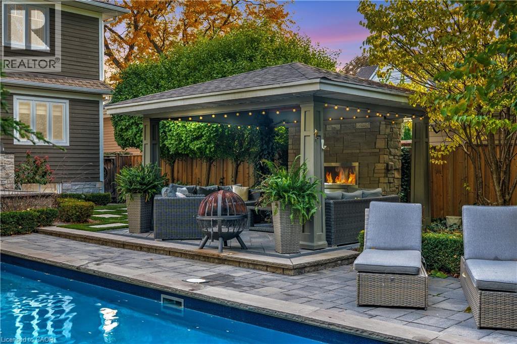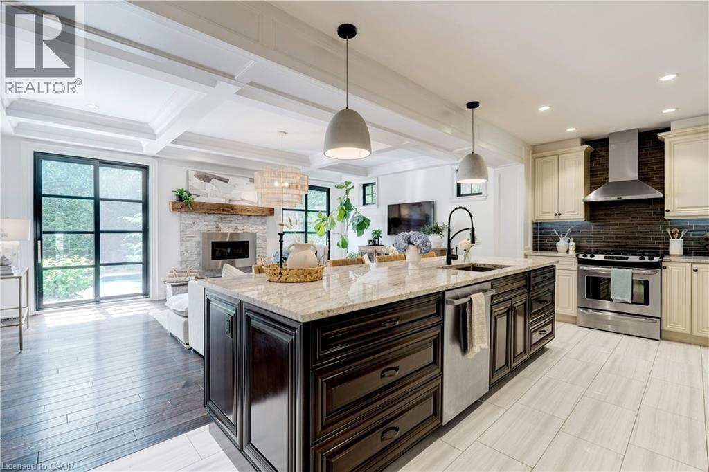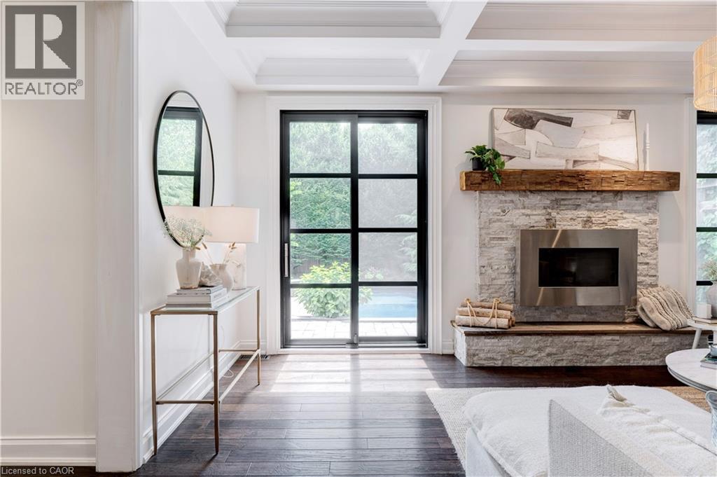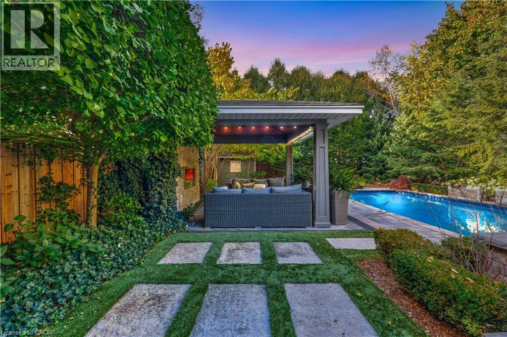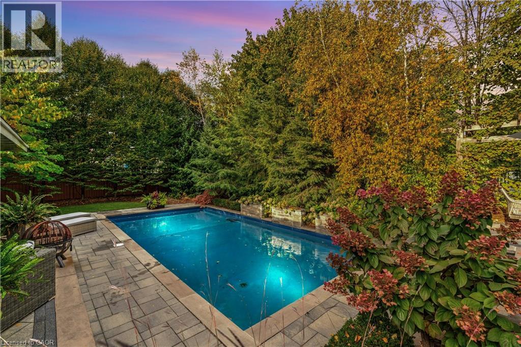 Curb appeal that draws you in, and a backyard you’ll never want to leave! Welcome to Burlington’s desirable core, where this 4+1 bedroom, 3.5 bathroom home delivers space, function, and a backyard that feels like a private escape! Inside, hand-scraped hardwood floors lead you through sun-filled spaces, starting with a formal dining room perfect for gatherings. The well-appointed kitchen features quality cabinetry, granite counters, and an oversized island that anchors the home. It opens to a generous great room with a coffered ceiling, stone fireplace, and dual walk-out to the backyard. A main floor bedroom or office, mudroom with laundry and garage access, and an a stylish powder room complete the main level. Upstairs, the primary suite features a walk-in closet and an ensuite with a soaker tub overlooking the yard and a glass shower, plus two additional bedrooms and a full bath. The finished lower level offers a spacious family room, additional seating area, the fifth bedroom, and a full bath. Step outside, and it only gets better: an incredibly private, meticulously landscaped backyard with mature trees, lush gardens, dozens of flourishing hydrangeas, elegant stonework, and low-maintenance turf. The oversized porch with built-in BBQ area, in-ground pool (newer liner, pump, and cartridge filter), waterfall feature, and covered outdoor lounge with gas fireplace make it the perfect space to gather or unwind. Truly, a home that captures attention! Luxury Certified. (id:24334)