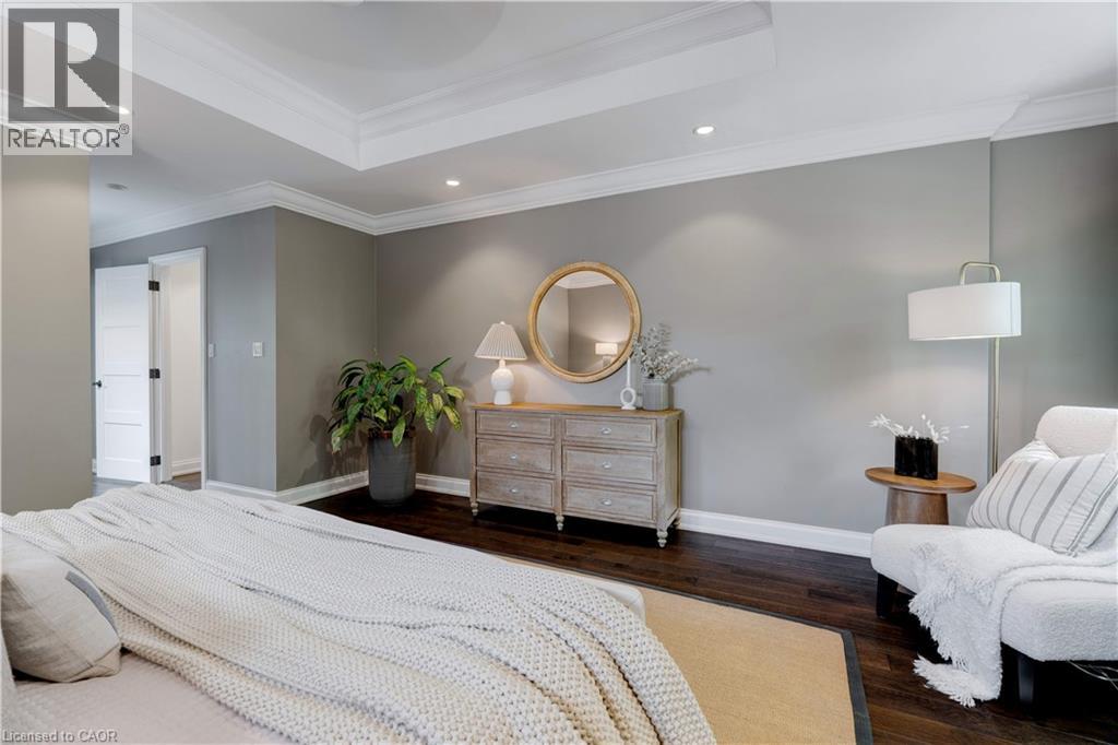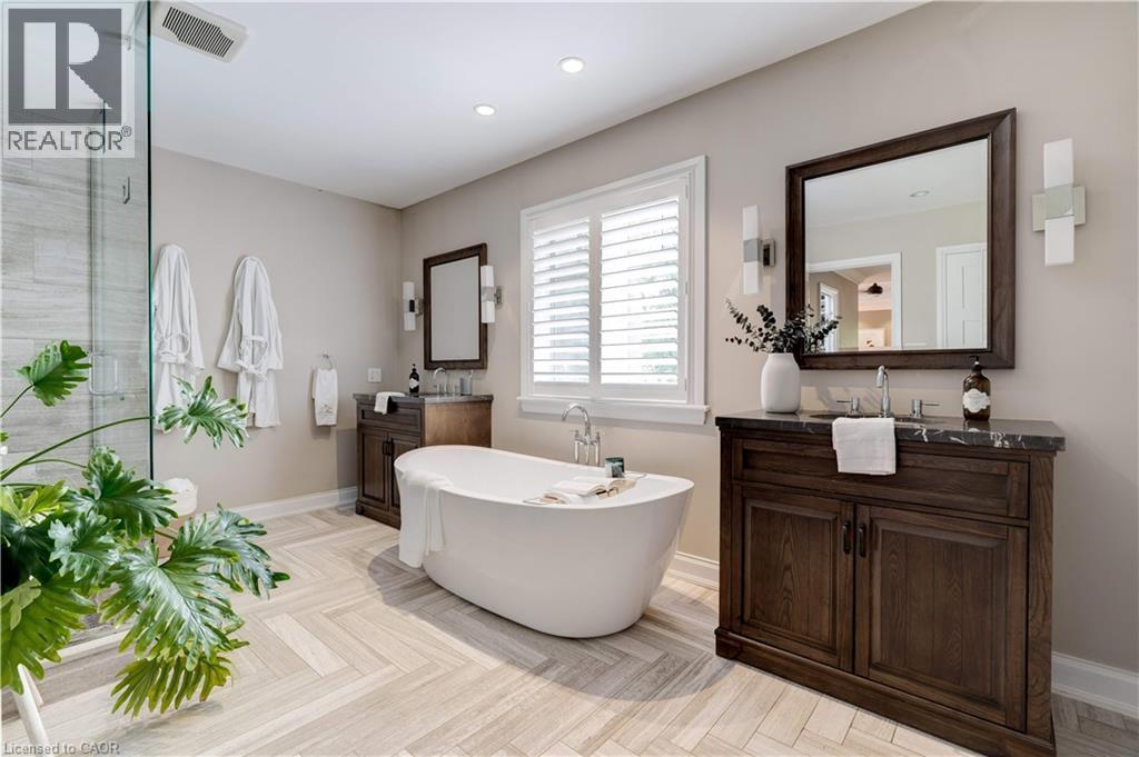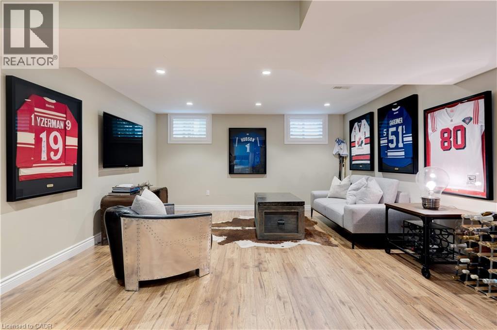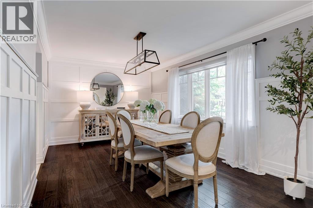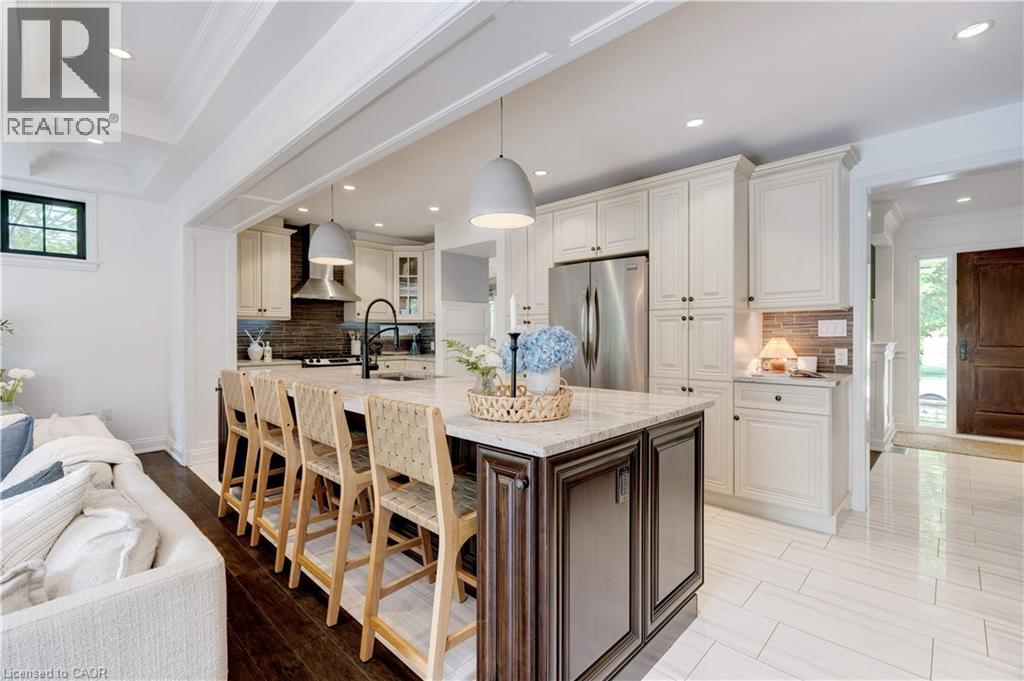 Curb appeal that draws you in, and a backyard you’ll never want to leave! Welcome to Burlington’s desirable core, where this 4+1 bedroom, 3.5 bathroom home delivers space, function, and a backyard that feels like a private escape! Inside, hand-scraped hardwood floors lead you through sun-filled spaces, starting with a formal dining room perfect for gatherings. The well-appointed kitchen features quality cabinetry, granite counters, and an oversized island that anchors the home. It opens to a generous great room with a coffered ceiling, stone fireplace, and dual walk-out to the backyard. A main floor bedroom or office, mudroom with laundry and garage access, and an a stylish powder room complete the main level. Upstairs, the primary suite features a walk-in closet and an ensuite with a soaker tub overlooking the yard and a glass shower, plus two additional bedrooms and a full bath. The finished lower level offers a spacious family room, additional seating area, the fifth bedroom, and a full bath. Step outside, and it only gets better: an incredibly private, meticulously landscaped backyard with mature trees, lush gardens, dozens of flourishing hydrangeas, elegant stonework, and low-maintenance turf. The oversized porch with built-in BBQ area, in-ground pool (newer liner, pump, and cartridge filter), waterfall feature, and covered outdoor lounge with gas fireplace make it the perfect space to gather or unwind. Truly, a home that captures attention! Luxury Certified. (id:24334)