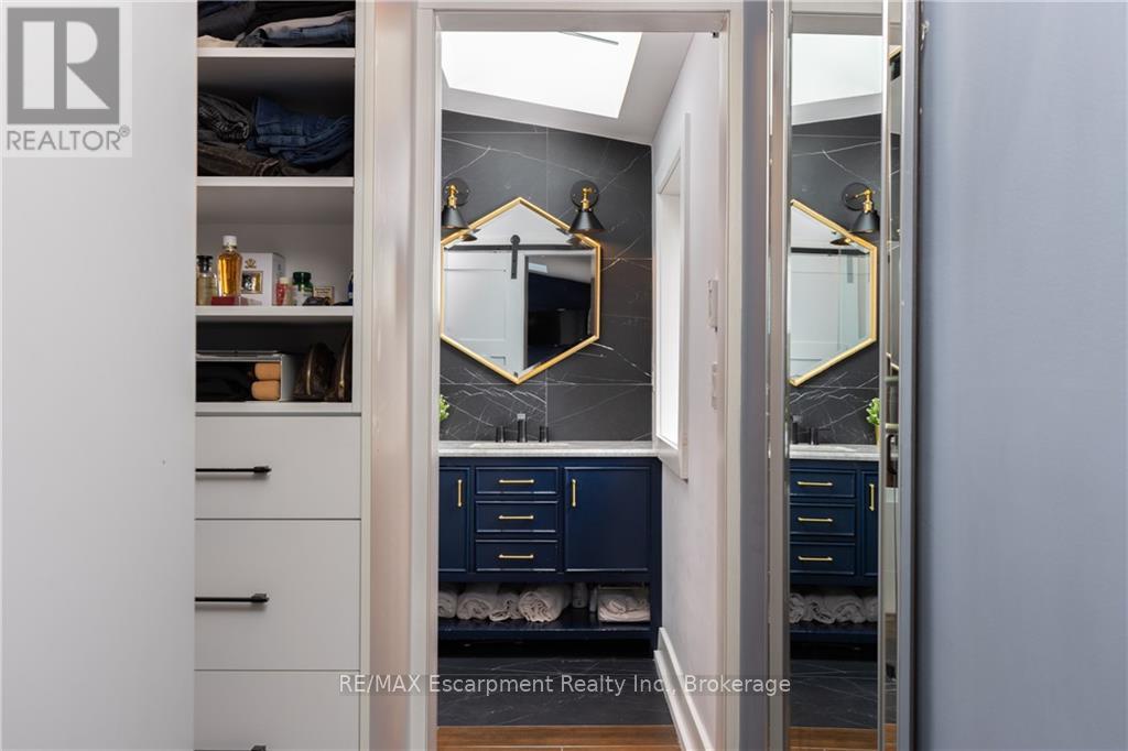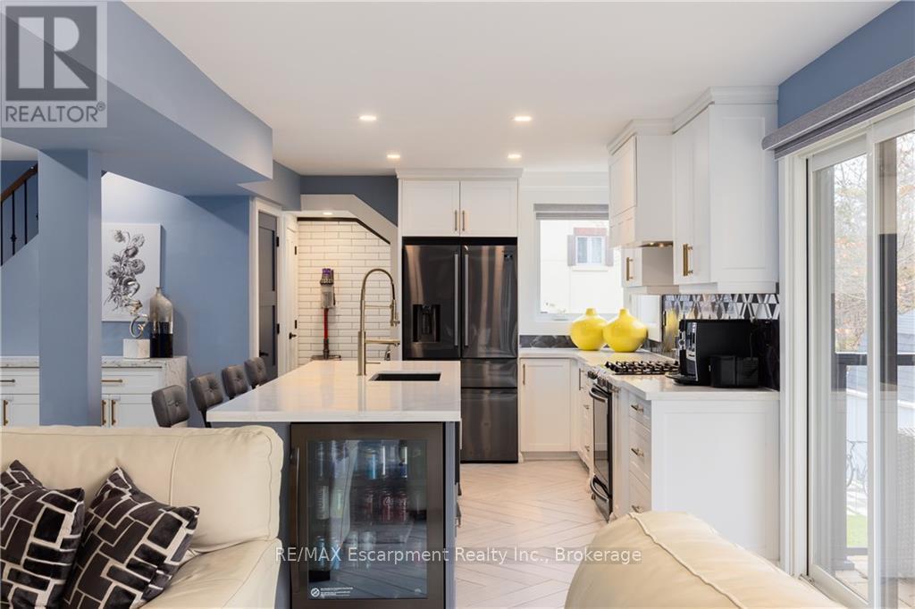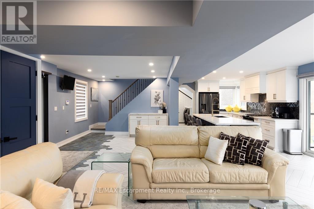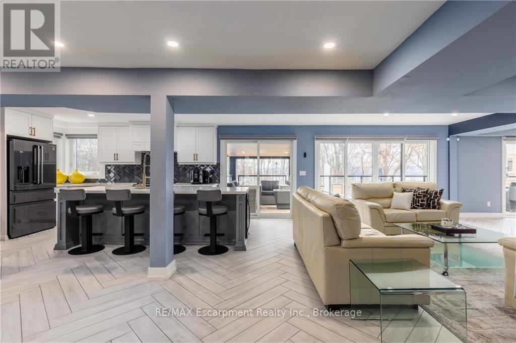 Tucked away at the end of a quiet cul-de-sac in Burlington's highly sought-after Aldershot neighbourhood, this beautifully renovated home (2019) offers an exceptional lifestyle ideal for families and downsizers alike. The bright, open-concept main floor features a spacious kitchen with centre island flowing effortlessly into the living and formal dining areas, all highlighted by breathtaking views of Burlington Bay. Expansive floor-to-ceiling windows bathe the space in natural light while framing the surrounding greenspace. This level also includes a convenient main-floor bedroom, laundry, a flexible office space, and a modern three-piece bathroom. Upstairs, three well-appointed bedrooms await, including a tranquil primary retreat with a spa-inspired ensuite complete with a soaker tub and skylights. Designed with versatility in mind, the lower level is perfect for multi-generational living and offers a second kitchen, comfortable living area, three-piece bath, and a fifth bedroom-ideal for in-laws or a nanny suite. A walk-up leads to the professionally landscaped backyard, an entertainer's haven featuring a covered upper porch, outdoor dining space, a sparkling inground concrete pool, and a lower-level fire pit area for relaxing with family and friends. Adding to its appeal, the property includes a rare 1/75th ownership share in Brighton Beach, a peaceful 5.5-acre conservation area with scenic trails and direct beach access. Enjoy easy access to shopping, schools, major highways, Aldershot GO Station, Royal Botanical Gardens, and premier golf courses. This is a rare opportunity to live in a remarkable home that seamlessly blends natural beauty with modern city living. (id:24334)