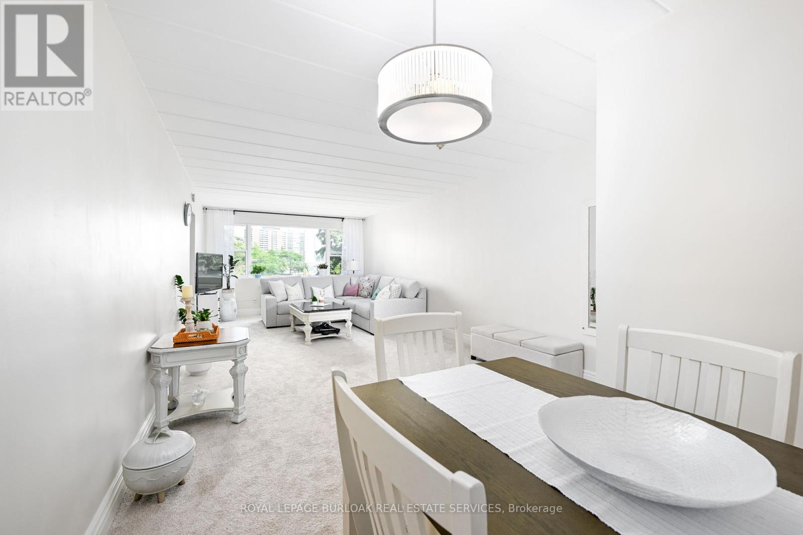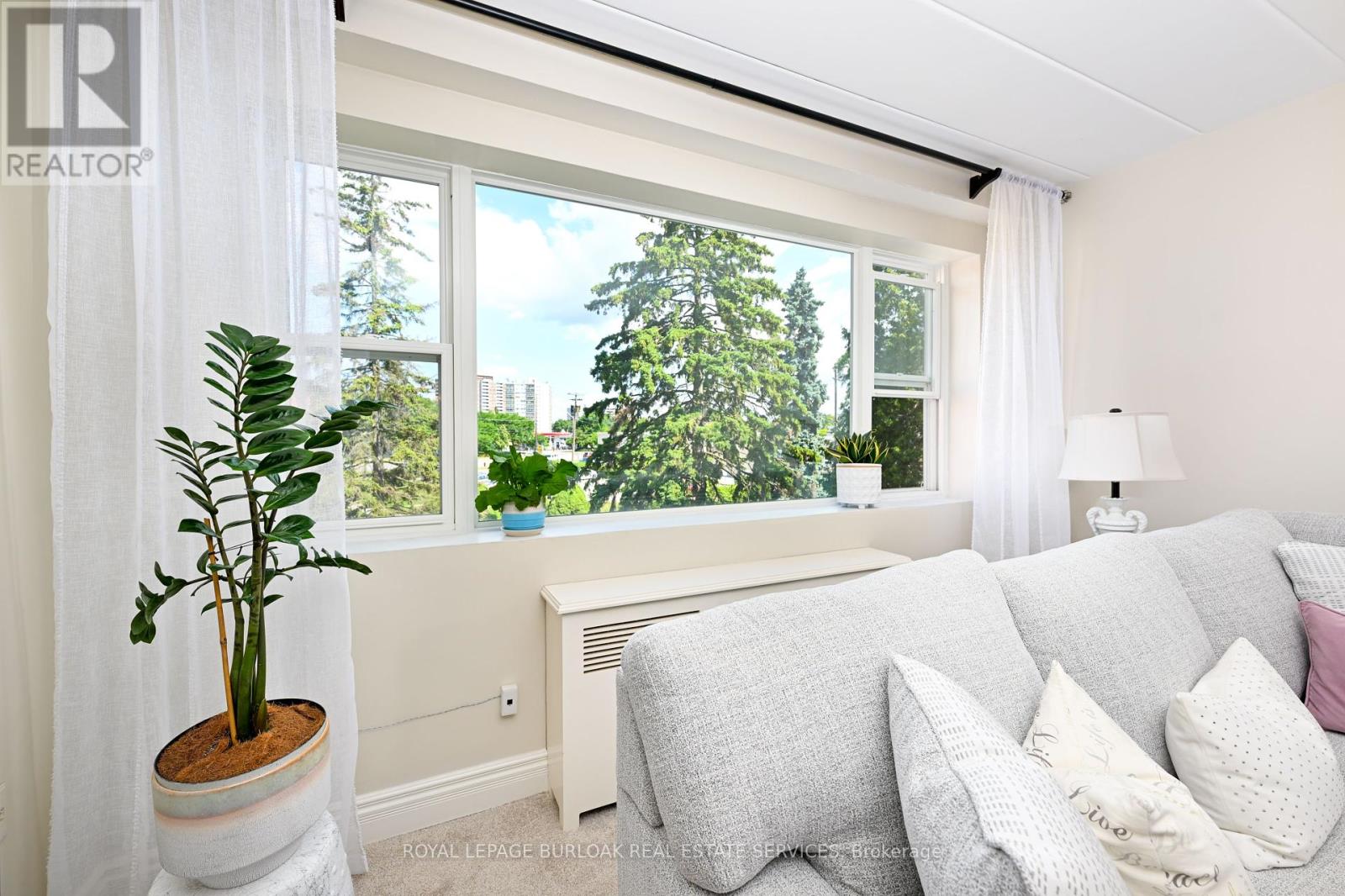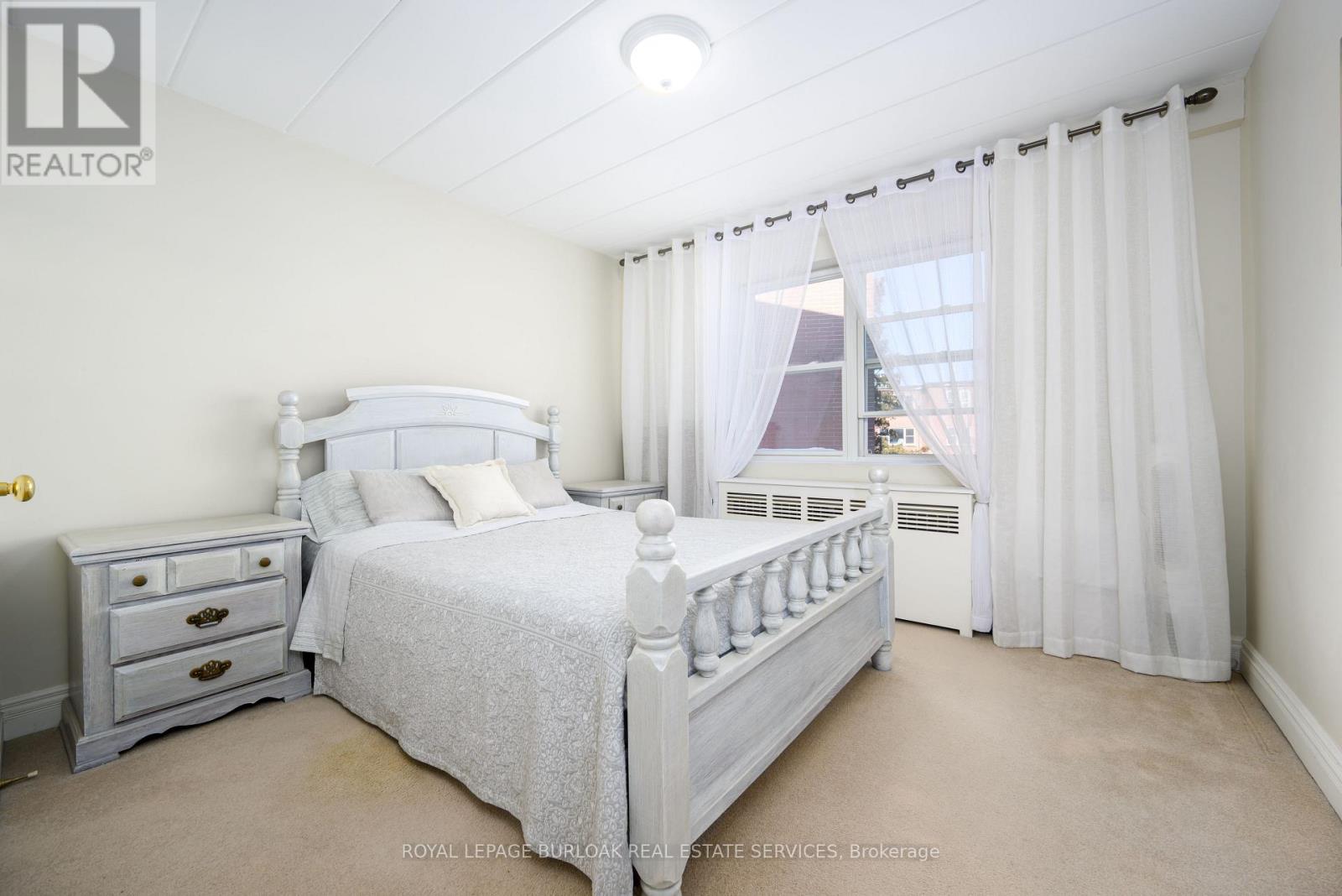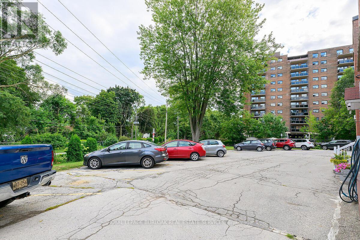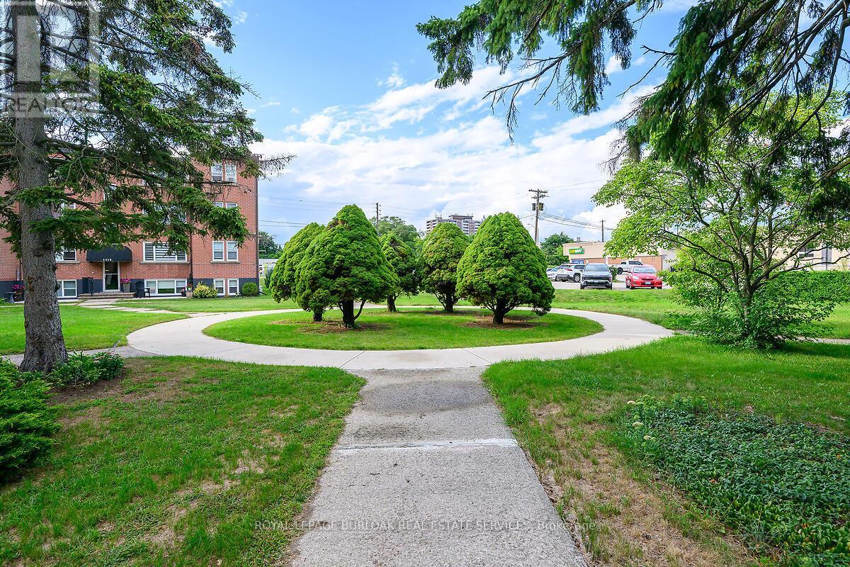 Welcome to this bright and spacious, 855sqft, 2 bedroom corner unit with lots of windows and lots of natural light, in a fantastic and highly desirable central Burlington location, close to shops, dining, downtown Burlington, hospital, highways, rec/community centre, library, parks, trails, and endless other great amenities. This unit has spacious principal rooms, is an inviting and functional space ideal for those downsizing, or young professionals, and also offers an updated kitchen with high-quality white cabinetry, backsplash, travertine tile floors, newer stainless steel stove, pantry, double sink, and lots of cupboard and countertop space, 2 spacious bedrooms including the primary with large windows overlooking the courtyard and trees, an updated 4-piece bathroom, a large living room with picture windows overlooking open space and trees, a spacious dining room off of the kitchen, quality vinyl windows updated in 2018, and freshly painted throughout. This unit is very clean, fresh, and comfortable, and shows 10++. The building is located at the back of the complex, well off the road, and backs on to lawn area, and walking and biking trails. The building is very quiet and well-maintained. The building amenities also include a storage locker, visitor parking, and onsite laundry. The unit comes with 1 parking space, with potential to rent a 2nd spot if needed. The low monthly maintenance fee includes PROPERTY TAX, heat, water, parking, locker, building insurance, exterior maintenance, and visitor parking. No pets (unless service animal), and no rentals/leasing. Don't wait and miss your opportunity to call this beautiful unit Home! Dare to compare! Welcome Home! (id:24334)